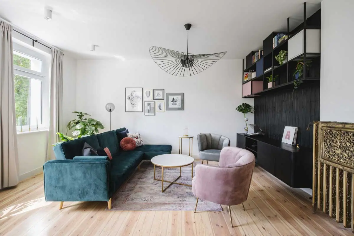 Zastosowanie bieli na ścianach i bielonych desek na posadzce sprawiło, że strefa dzienna wydaje się być bardziej przestronna i jasna. Jest to również idealne tło dla oryginalnych pamiątek i artefaktów gospodarzy. Tworzą one mini galerię ścienną, wśród której zajedziemy m.in. grafiki przedstawiające kota Romana. Po prawej stronie, uwagę zwraca odrestaurowany złoty grzejnik. Znajdującą się tuż obok wnękę wykończono drewnianą boazerią, pomalowaną na czarno. Na jej tle znajduje się podwieszona szafka RTV oraz zaprojektowany na zamówienie metalowy regał. Centralnym miejscem pokoju jest szmaragdowa sofa i fotele w kształcie muszli. Dwuskrzydłowe drzwi, pomalowane na biało to kolejne nawiązanie do historycznego wnętrza. Prowadzą one do niewielkiego gabinetu. Biurko połączone z regałem w kolorze granatowym, tworzy wygodne miejsce pracy. Na czarnej ścianie szczytowej, wyeksponowano złoty rower. Znalazła się też tutaj niewielka rozkładana kanapa, dzięki której domowe biuro szybko zamieni się w komfortowy pokój gościnny.