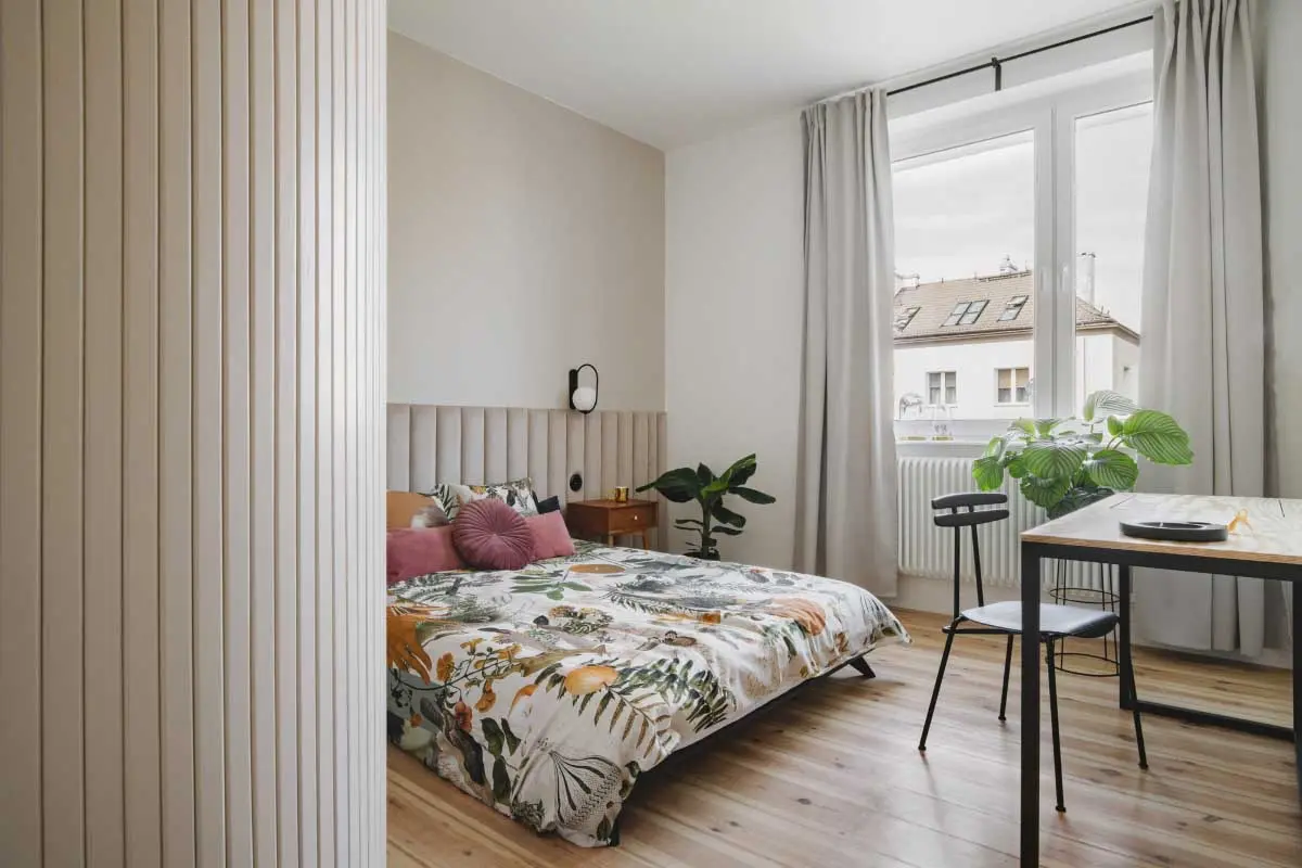 Sypialnia to miejsce wyciszenia i relaksu. Dlatego stworzono tutaj kontrapunkt wobec kolorów i zdecydowanych form, charakterystycznych dla pozostałej części mieszkania. Architekci zdecydowali się na konsekwentne użycie jasnego beżu na ścianach, zagłówku a także wykończeniu nietypowej garderoby. Ponieważ sypialnia jest spora, a właścicielka posiada wiele ubrań i par butów zdecydowano, że najlepiej będzie wydzielić garderobę. Ukryto ją za ścianką w formie łuku, który sprawia, że zabudowa nie przytłacza i nie zaburza komunikacji. Welurowy, pikowany zagłówek wykonany na zamówienie, współgra z frontami garderoby. Znalazło się tutaj też miejsce na minimalistyczną toaletkę, a całość dopełniają szafki nocne w stylu vintage.