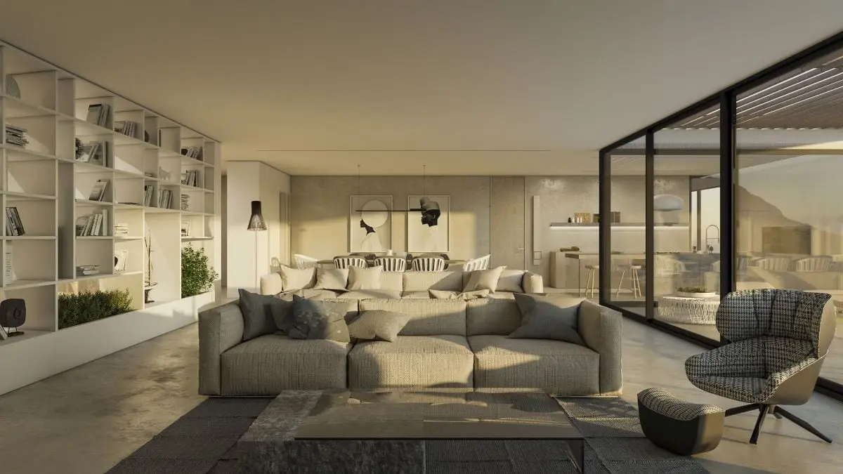 Podłogę wyłożono cienkim dywanem w kolorze grafitu, a wnętrze upiększono roślinami ozdobnymi. Dzięki odpowiedniemu ustawieniu kompletu wypoczynkowego zbudowano dwie strefy – jedna sprzyja wspólnym rozmowom, druga umożliwia relaks przed telewizorem. Z przestronnego salonu jest wyjście na taras, skąd można rozkoszować się wspaniałym widokiem na Ocean Atlantycki. Wyróżniony projekt jest minimalistyczny, elegancki i nowoczesny. Zachwyca prostotą wykonania. Niepowtarzalna lokalizacja apartamentu, pozwalająca na podziwianie oceanu, czyni go miejscem unikatowym, sprzyjającym miłym chwilom.