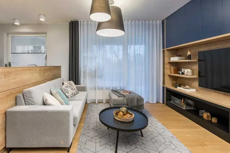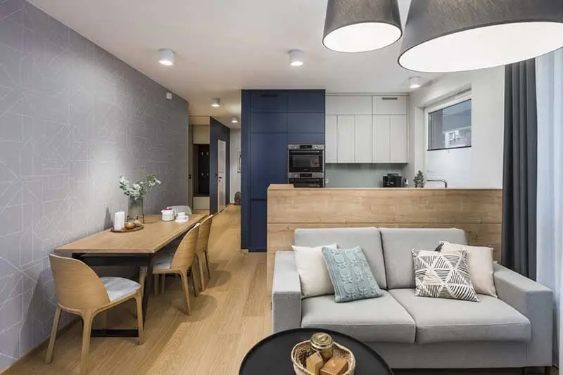 Mieszkanie w szarościach i granacie z przytulną strefą dzienną