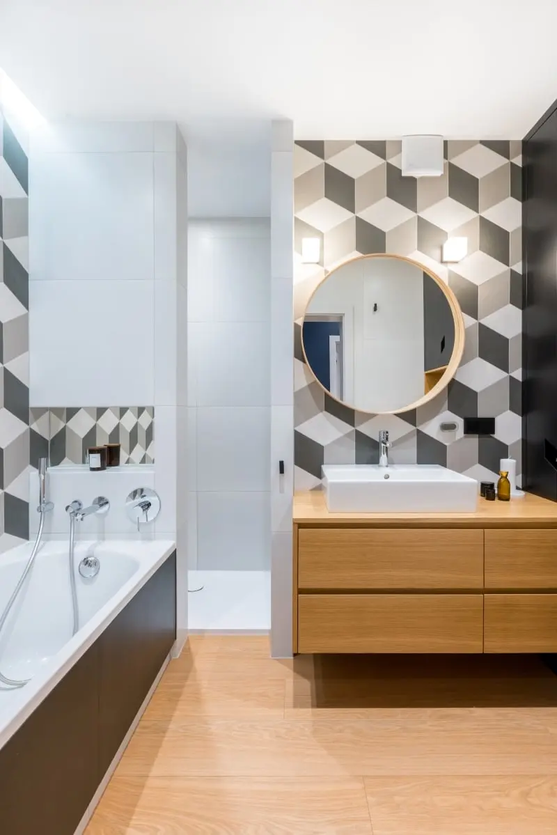 Jak podkreśla architekta Joanna Sztorch – Wysocka, łazienka mieszkania robi wrażenie – jest mocna, geometryczna, a motywem dominującym w tym pomieszczeniu są romby. Główną rolę grają płytki ścienne zestawione z czarnym gresem obudowującym wannę i czarnymi frontami szafy o znakomicie zaprojektowanych ażurach w kształcie rombów, które spełniają rolę uchwytów i wentylacji zarazem. Całość wnętrza ocieplają dodatki w kolorze drewna: panele winylowe, część zabudowy meblowej nad toaletą oraz szafka pod umywalkę. Łazienka mimo, że niewielka, pomieściła nie tylko wannę, lecz również i prysznic z brodzikiem, idealnie wpisanym we wnękę.