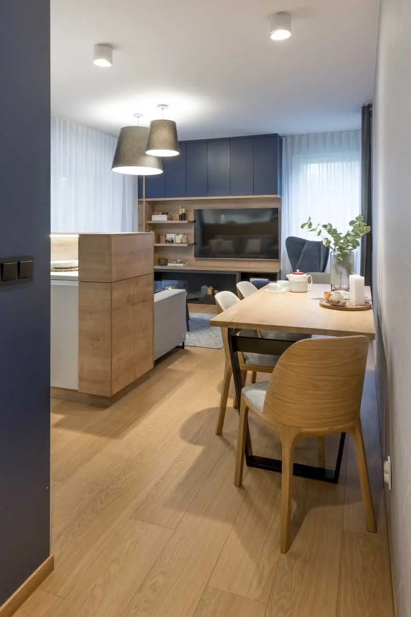Mieszkanie w szarościach i granacie o powierzchni 67m2 znajduje się na jednym z nowych poznańskich osiedli. Mieści się na parterze budynku, a z salonu i sypialni domownicy mogą wyjść do przydomowego ogródka, by odetchnąć i zrelaksować się na słońcu. Względem planów deweloperskich w projekcie mieszkania poczyniono kilka zmian. Wszystko, by dostosować przestrzeń do konkretnych potrzeb czteroosobowej rodziny. Powiększono aneks kuchenny, zmieniono układ łazienki i pralni oraz lokalizację wejścia do sypialni. Inwestorom poza funkcjonalnością, zależało na materiałach odpornych na uszkodzenia oraz na stonowanej kolorystyce. Architektki zaproponowały więc panele winylowe na podłogach, które wizualnie niczym niczym nie odbiegają od drewnianego parkietu, a jednocześnie są bardzo wytrzymałe. Ciekawym twistem w neutralnej kolorystyce wnętrza jest granat, przewijający się w aranżacji wszystkich pomieszczeń i stanowiący mocniejszy kolor przewodni.