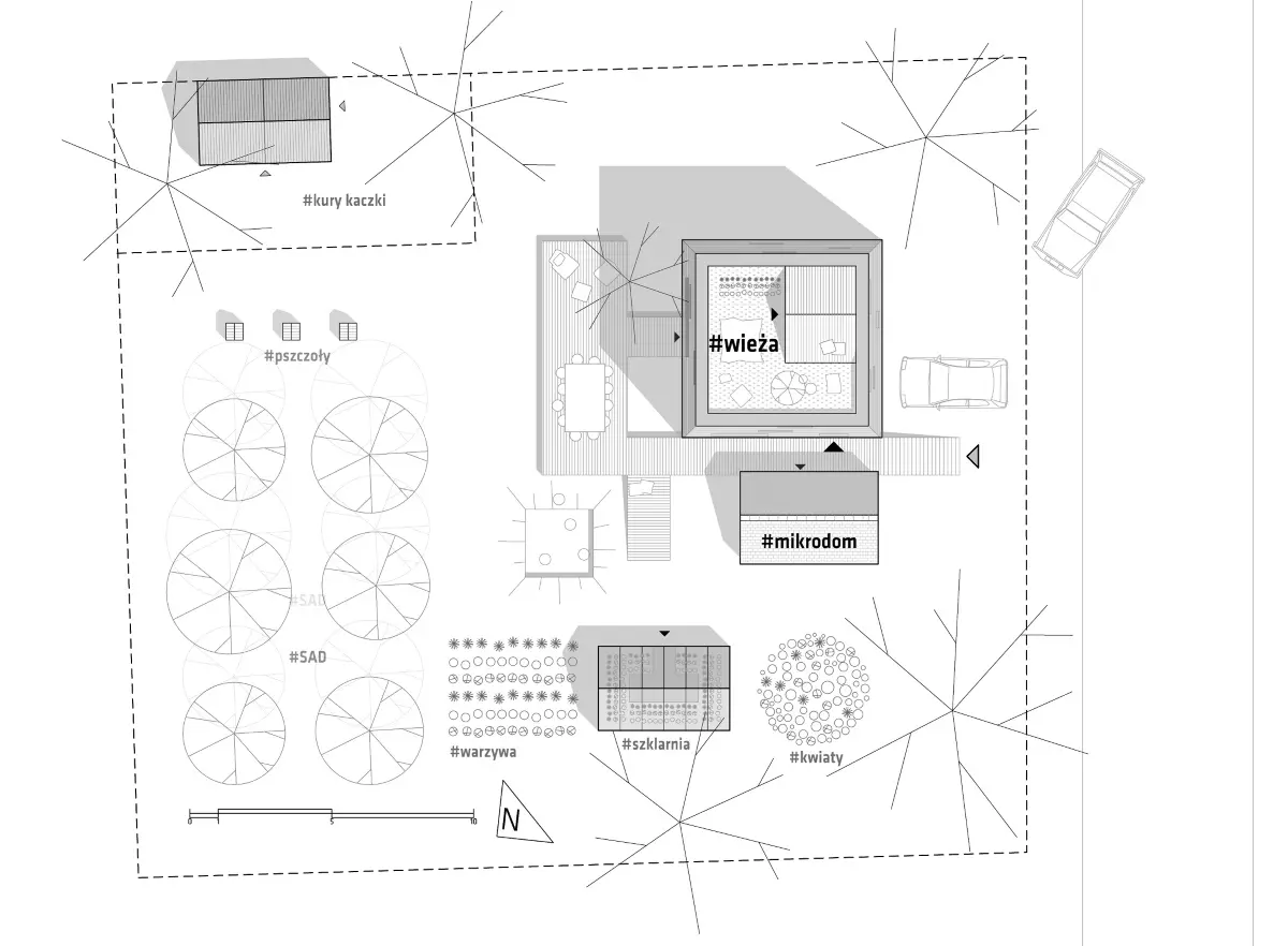 Całe założenie projektu autorstwa Sense Group, miało na celu stworzenie samowystarczalnego mikrogospodarstwa. Dzięki niemu domownicy mieliby zaspokajać większość swoich potrzeb. Właśnie dlatego na działce powstała szklarnia, gdzie można uprawiać warzywa. Poza tym sad, niewielka pasieka pszczół oraz kurnik, w którym również będą mieszkać kaczki. Natomiast dach wieży, miałby służyć do uprawy ziół. Przestrzeń działki, ma także umożliwiać mieszkańcom i odwiedzającym ich gościom, spędzanie czasu na świeżym powietrzu. Zatem nie zabraknie tu tarasu, miejsc do biesiadowania oraz aktywności fizycznej.