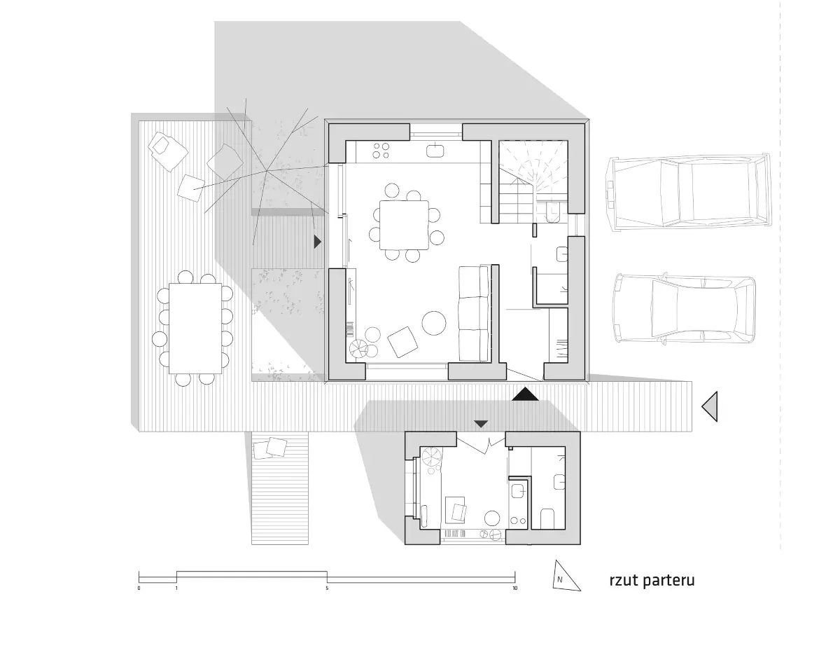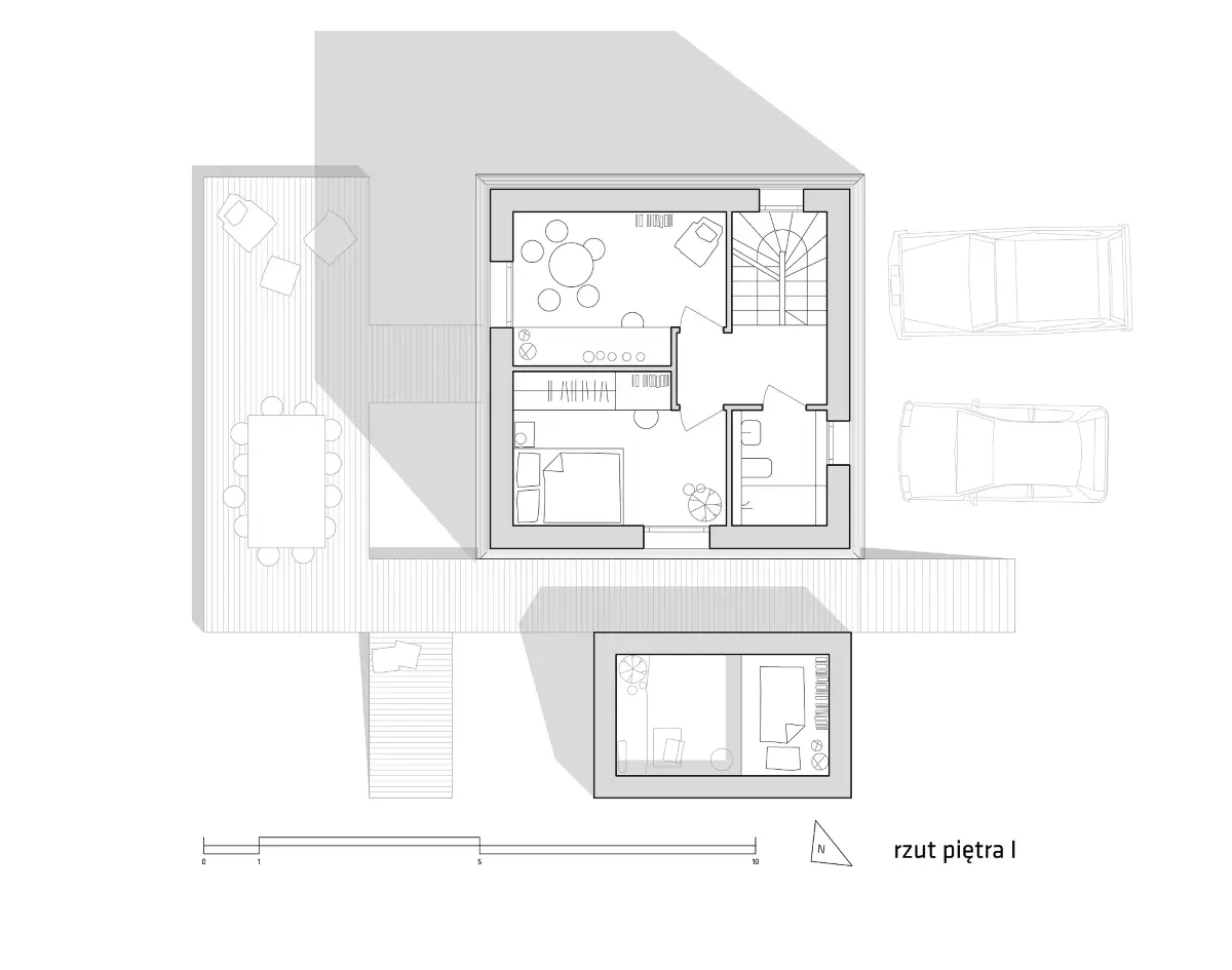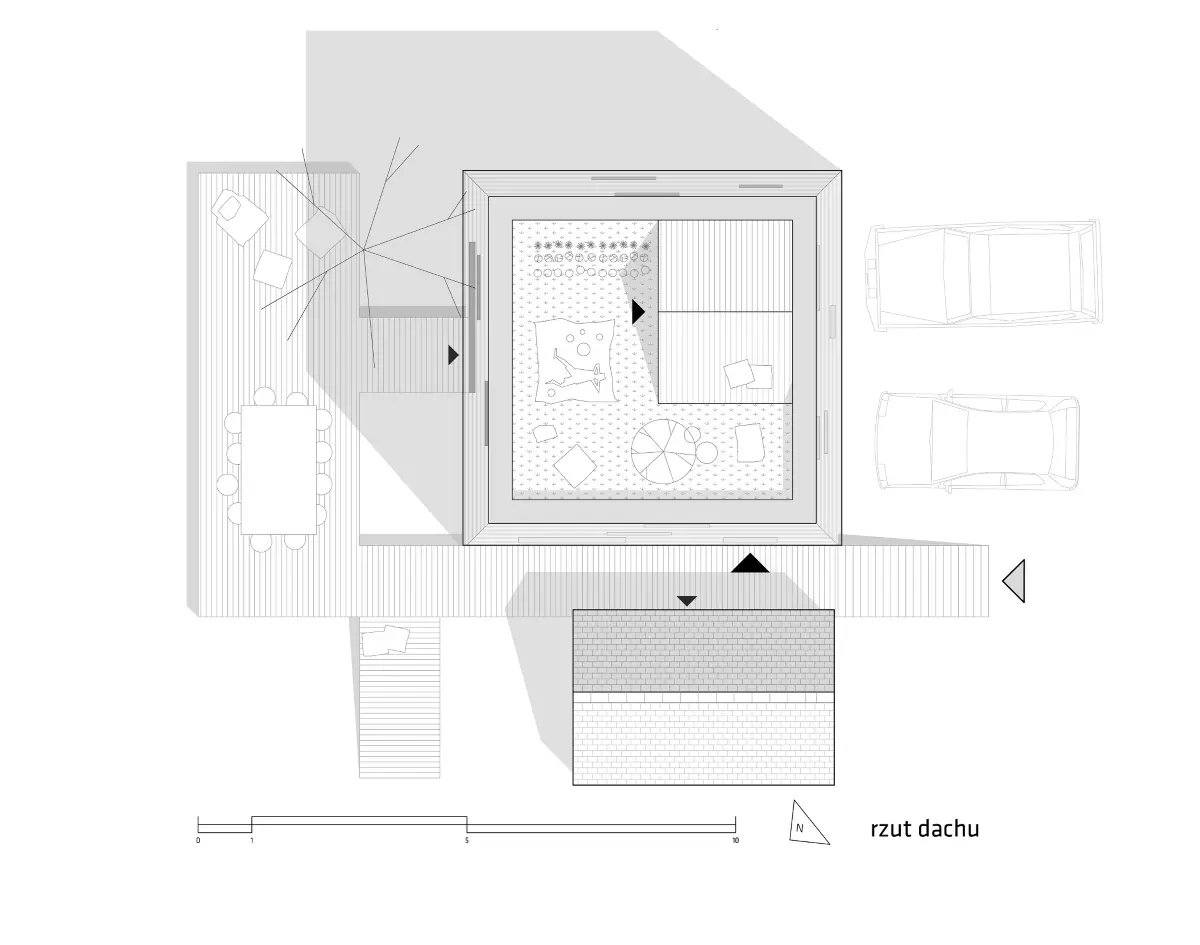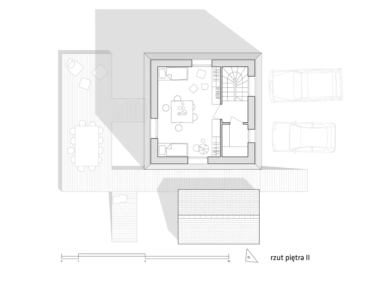 Pszczyna to niewielkie miasto w południowej Polsce. Właśnie tutaj powstaje niezwykły koncept rodzinnego mikrogospodarstwa, którego centrum stanowi wieża mieszkalna. Zarówno jej bryła, jak i rozwiązania formalne, zainspirowane są przez nieistniejący już kościółek św. Jadwigi. Część mieszkalna zaprojektowana jest na planie kwadratu o wymiarach 7×7 metrów. Na parterze znajduje się strefa dzienna, będąca miejscem spotkań rodzinnych. Pierwsze piętro mieści sypialnię rodziców oraz pracownie hobbystyczną. Natomiast drugie piętro to królestwo dzieci z sypialnią i przestrzenią do zabawy na antresoli. Postanowiono nawet wykorzystać płaski dach, gdzie powstanie ogród z uprawą ziół. Tuż obok wieży stoi niewielki domek z dwuspadowym dachem, który przez twórcę projektu nazywany jest ogrodem tlenowym. Ma to być miejsce dla roślin dających tlen, a jednocześnie pełnić wszystkie funkcje mieszkalne. Przestrzeń może być wykorzystywana do pracy, ale też do odpoczynku i kontemplacji wśród zieleni. Ogród tlenowy będzie również domem dla gości, a nawet miejscem kwarantanny w czasach koronawirusa. Inspiracją dla wnętrza był ocean i płetwale uwielbiane przez wszystkich domowników. Stąd kolorystyka utrzymana w czerni, ciemnym błękicie oraz morskiej zieleni.