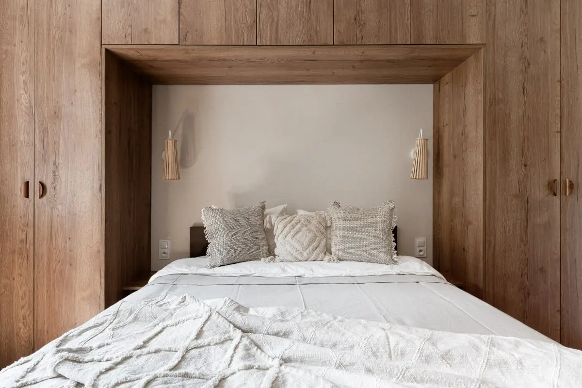 Sypialnię rodziców utrzymano w neutralnej, biało-beżowej tonacji. Nieco rustykalny, kojący charakter wnętrza podkreślają plecione tekstylia w naturalnej kolorystyce. Nie zabrakło również mnóstwa przestrzeni do przechowywania, dzięki szafie z lustrem w zabudowie. Główna łazienka, utrzymana jest w podobnej stylistyce i kolorystyce. Ściany pokrywają białe trójwymiarowe płytki imitujące kamień. W łazience wydzielono przestrzeń na prysznic typu walk-in. Dobrano też niewielkie podblatowe umywalki o łagodnych liniach wykończenia. W strefie WC zastosowano produkty od jednego producenta – Geberit. Architektka zdecydowała się na miskę WC Mode Pure marki Koło, będącą częścią oferty Geberit oraz stelaż podtynkowy i przycisk marki Geberit. Tak skompletowany zestaw jest gwarancją bezpieczeństwa i trwałości na lata.