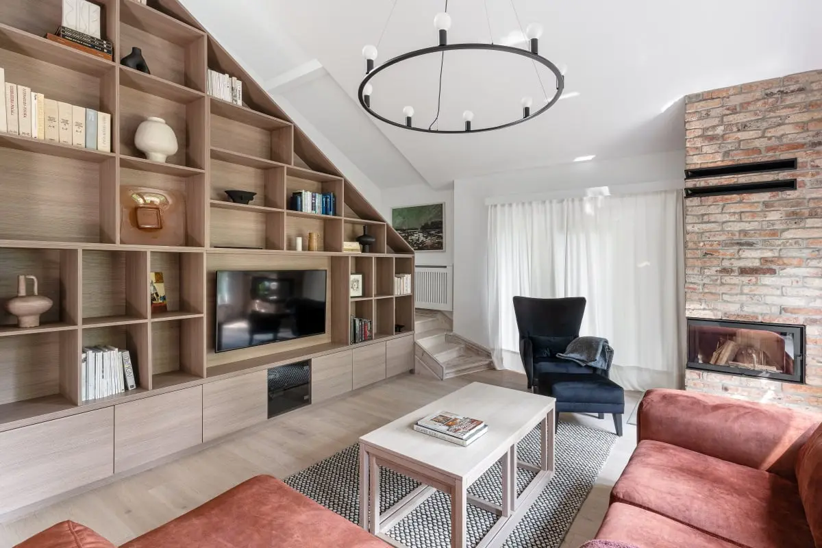 W salonie wokół telewizora umieszczono wysoki otwarty regał, który jednocześnie maskuje biegnące na piętro schody. Inwestorzy zyskali więc mnóstwo miejsca na ustawienie swoich pamiątek. W rogu salonu znajduje się tradycyjny kominek, który obłożono cegłą z rozbiórki. Centralnym punktem strefy wypoczynkowej jest obszerna, wygodna kanapa obita welurem w kolorze cegły. Architektka dobrała do niej kontrastujący czarny fotel z podnóżkiem. Przykuwającymi wzrok akcentami jest duży, okrągły żyrandol podwieszony na wysokim suficie i abstrakcyjny obraz, zawieszony wysoko na ścianie. Z salonem sąsiaduje jadalnia połączona z kuchnią. Kolor obić krzeseł wokół stołu koresponduje ze strefą wypoczynkową. Z kolei ściany utrzymano w eleganckiej, granatowej kolorystyce, a urozmaica ją tapeta z motywem kwiatowym, którą położono w sztukaterii. Sentymentalny charakter wnętrza podkreślają dwie eleganckie witrynki przeszkleniami. Wyeksponowano w nich ceramiczną zastawę stołową w klimacie retro.