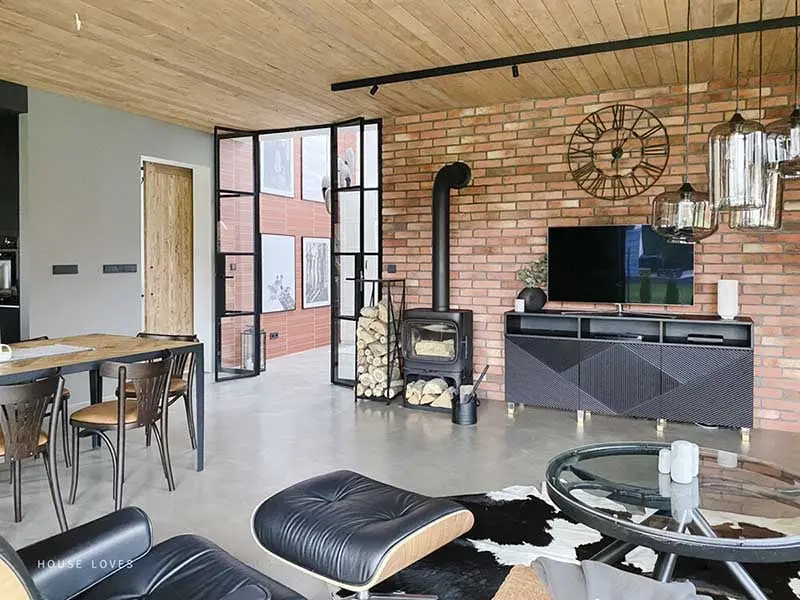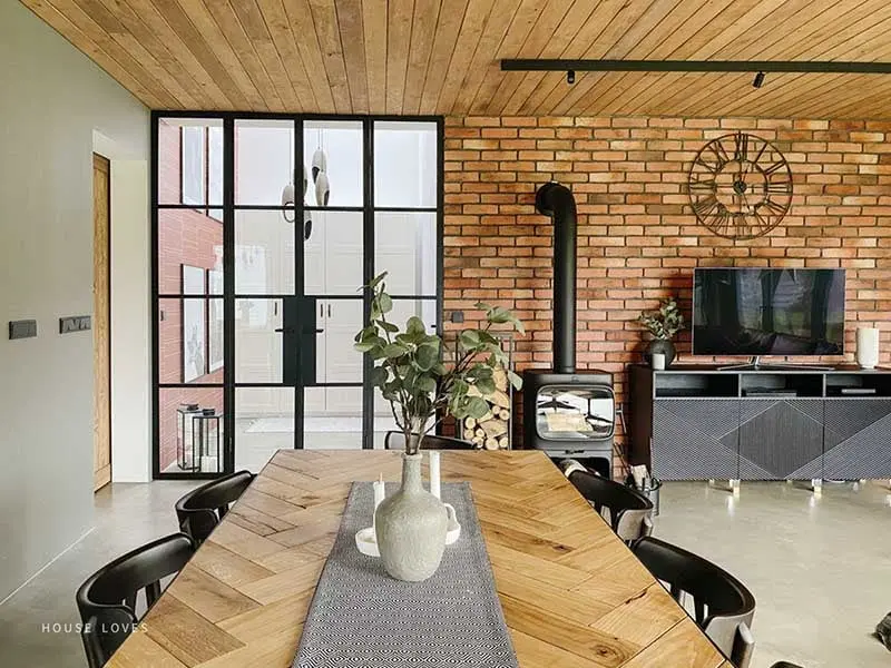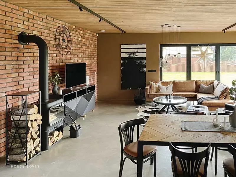 Warto przypomnieć, że wnętrze powstało dla siostry Karoliny, która od podstaw buduje swój pierwszy dom. Miało się w nim znaleźć wszystko, co uwielbia inwestorka: loftowe lampy, drewniane belki, betonowe podłogi i ciemne kolory. Właśnie dlatego królują tutaj ciepłe odcienie brązu i karmelu, zestawione ze ścianą pokrytą płytkami imitującymi czerwoną cegłę. Kolorystyka ta idealnie współgra z rustykalnym dębem oraz czarnymi dodatkami. Bardzo ciekawym elementem wnętrza, który przykuwa wzrok jest wolnostojący kominek w typie tzw. kozy. Warto również zwrócić uwagę na strefę kuchni z wyjątkową wyspą pokrytą drewnem. Natomiast w roli łącznika pomiędzy salonem i kuchnią, występuje stół jadalniany z blatem w jodełkę, do którego zostały dobrane krzesła A-788 Fan marki Fameg.
