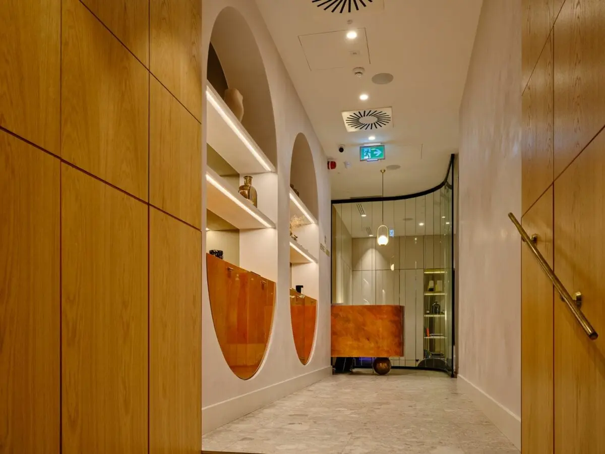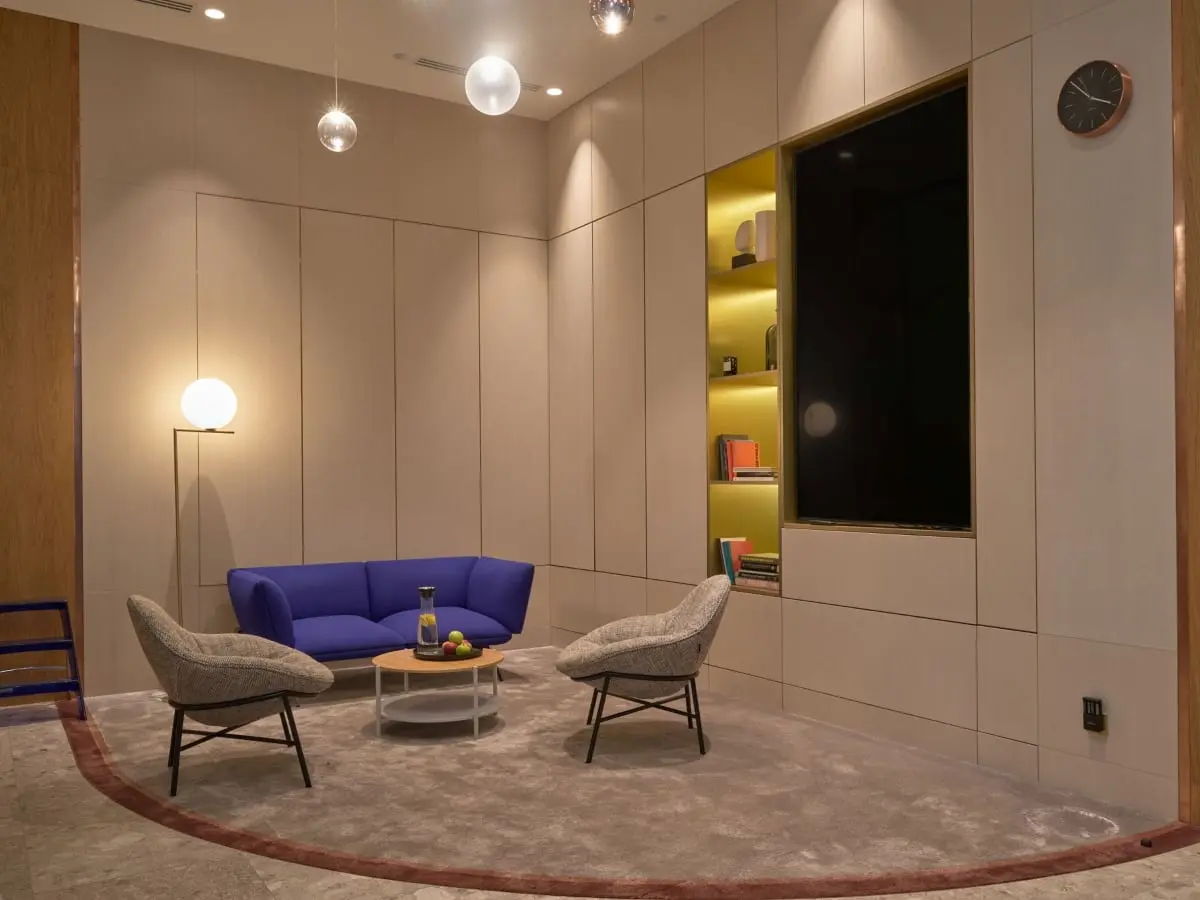 Projektanci zdefiniowali zastaną przestrzeń w sposób funkcjonalny: od układu pomieszczeń, przez perfekcyjnie zaplanowane oświetlenie, do doboru mebli i materiałów, starając się uzyskać atmosferę o dużym oddziaływaniu emocjonalnym. Atutem tego miejsca jest stonowana, jasna kolorystyka, bazująca na naturalnych kolorach, które pojawiają się na elementach drewna, tynku czy kamienia i przeplatającego się między nimi mosiądzu. Poszczególne strefy wyróżniają się mocniejszymi akcentami kolorystycznymi, z dominacją fioletu i zieleni. Kolor pojawia się także na abstrakcyjnych obrazach, wiszących zarówno w strefach wspólnych jak i gabinetowych.