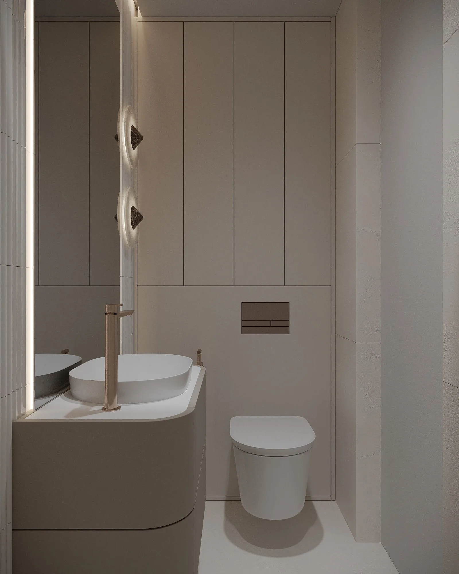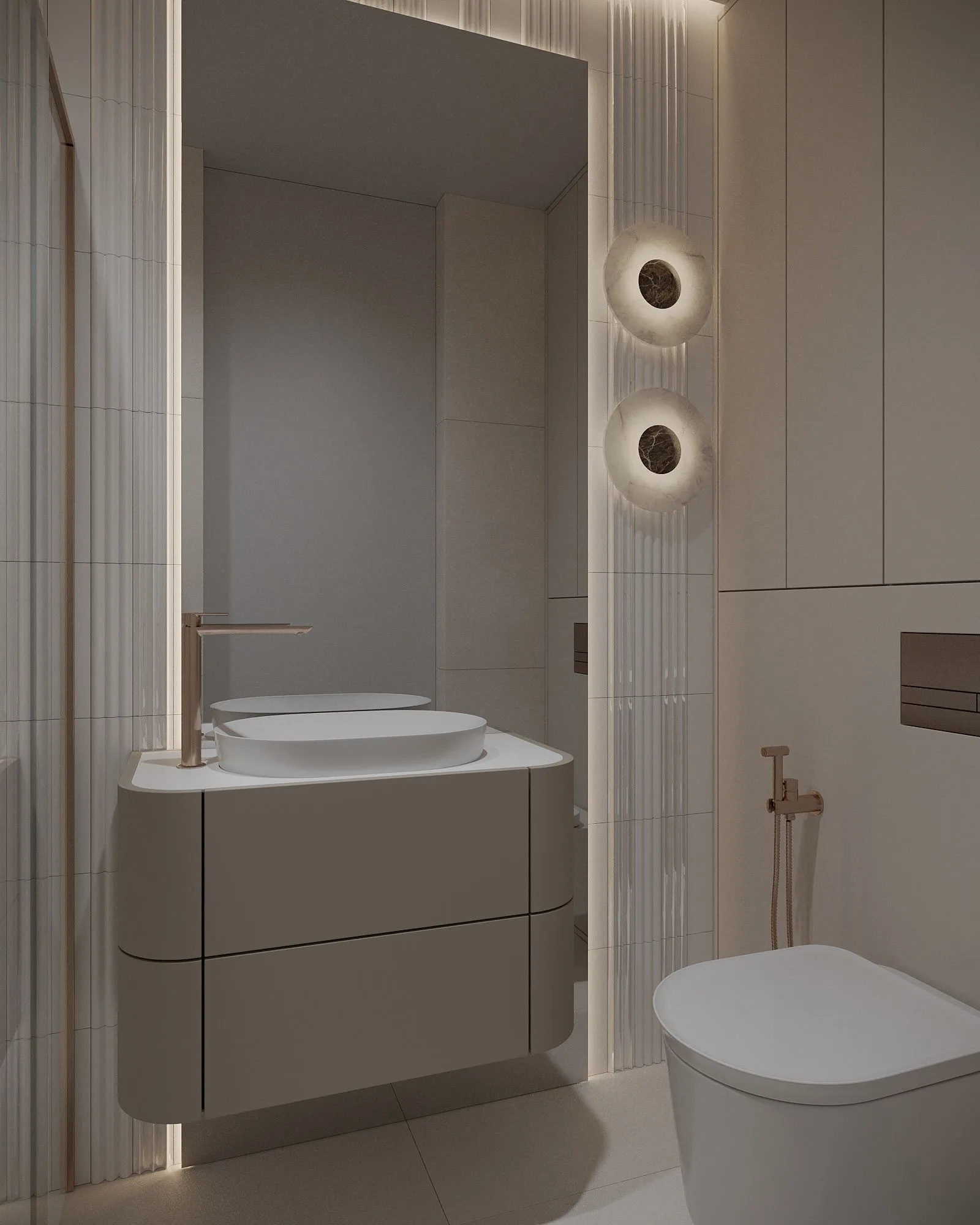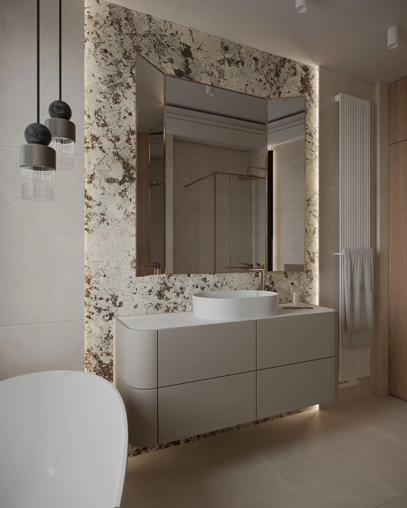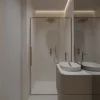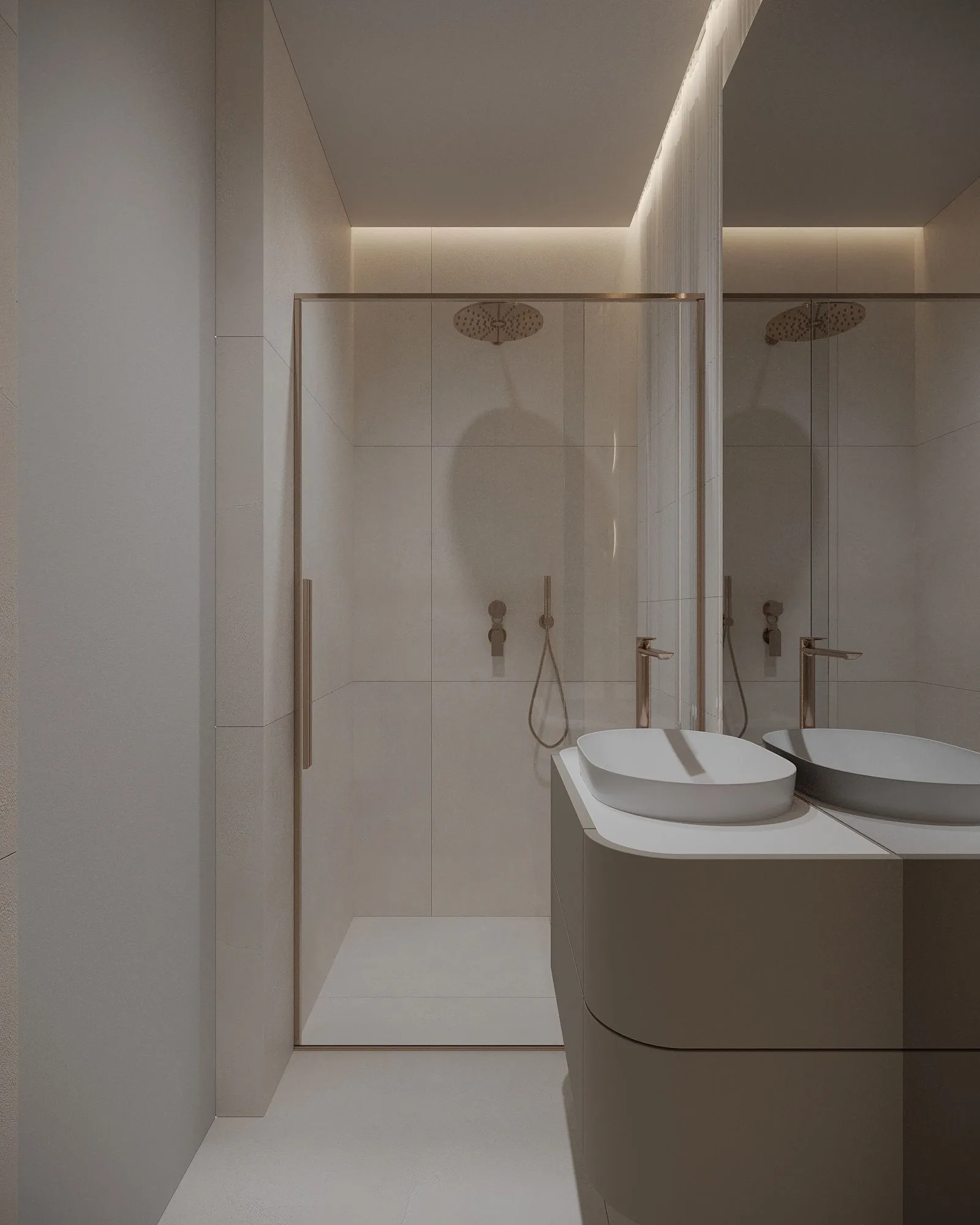Łazienki wyciszają tę narrację. Utrzymane w beżach i kamiennych okładzinach, działają jak prywatne strefy regeneracji. Ich siła nie tkwi w efekciarstwie, lecz w harmonii proporcji, czystości materiałowej i subtelności rozwiązań. To przestrzenie, które pozwalają odetchnąć — fizycznie i wizualnie.