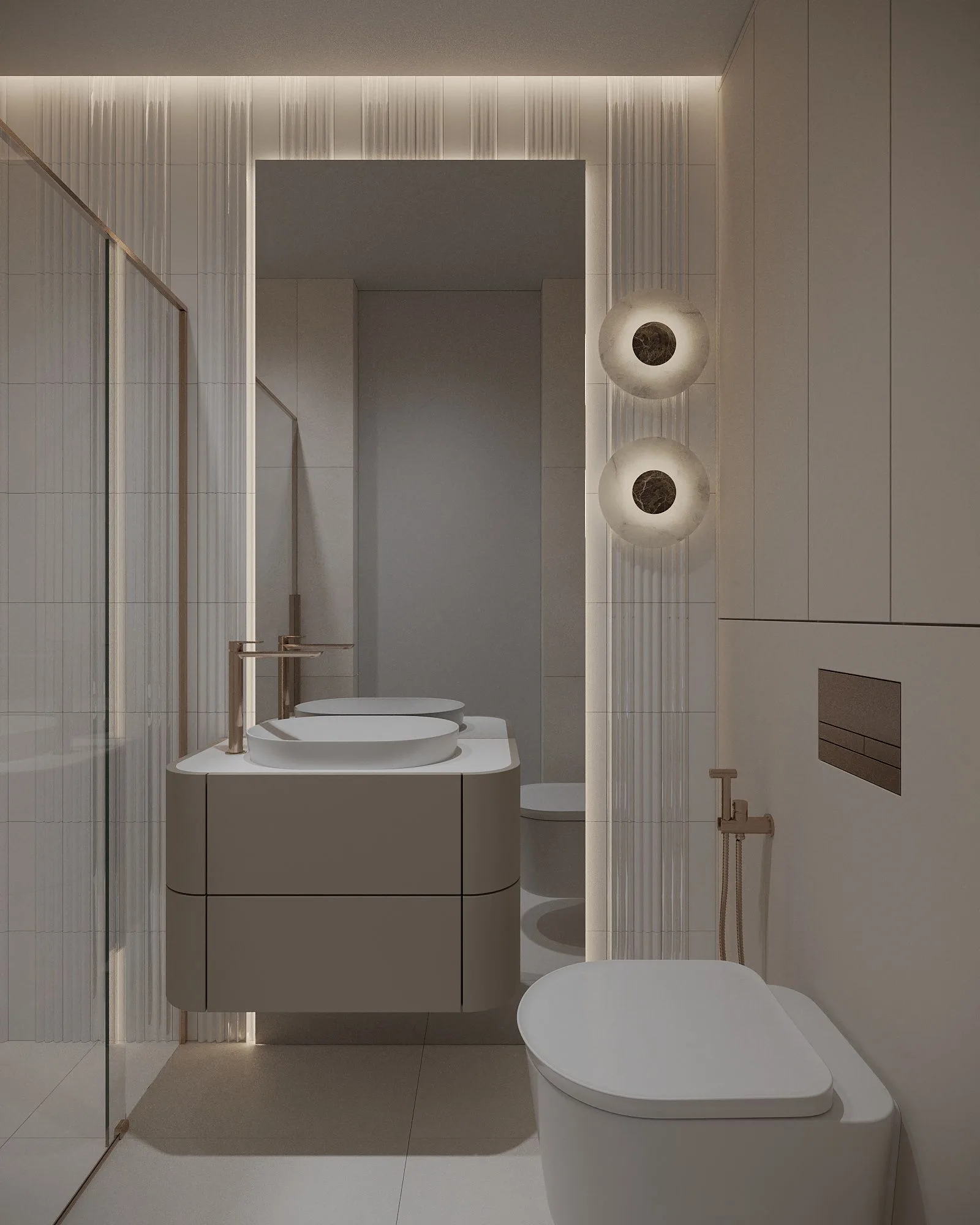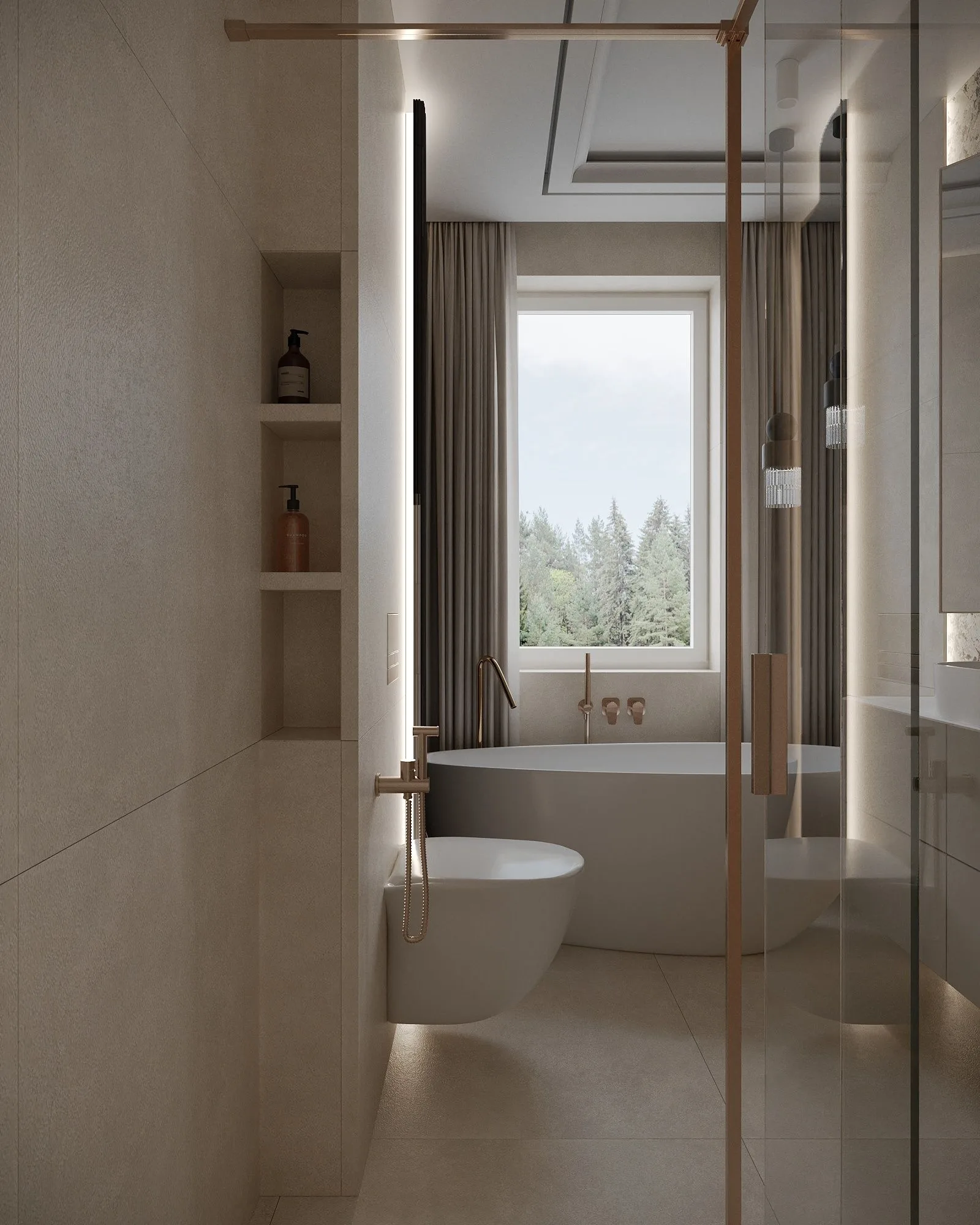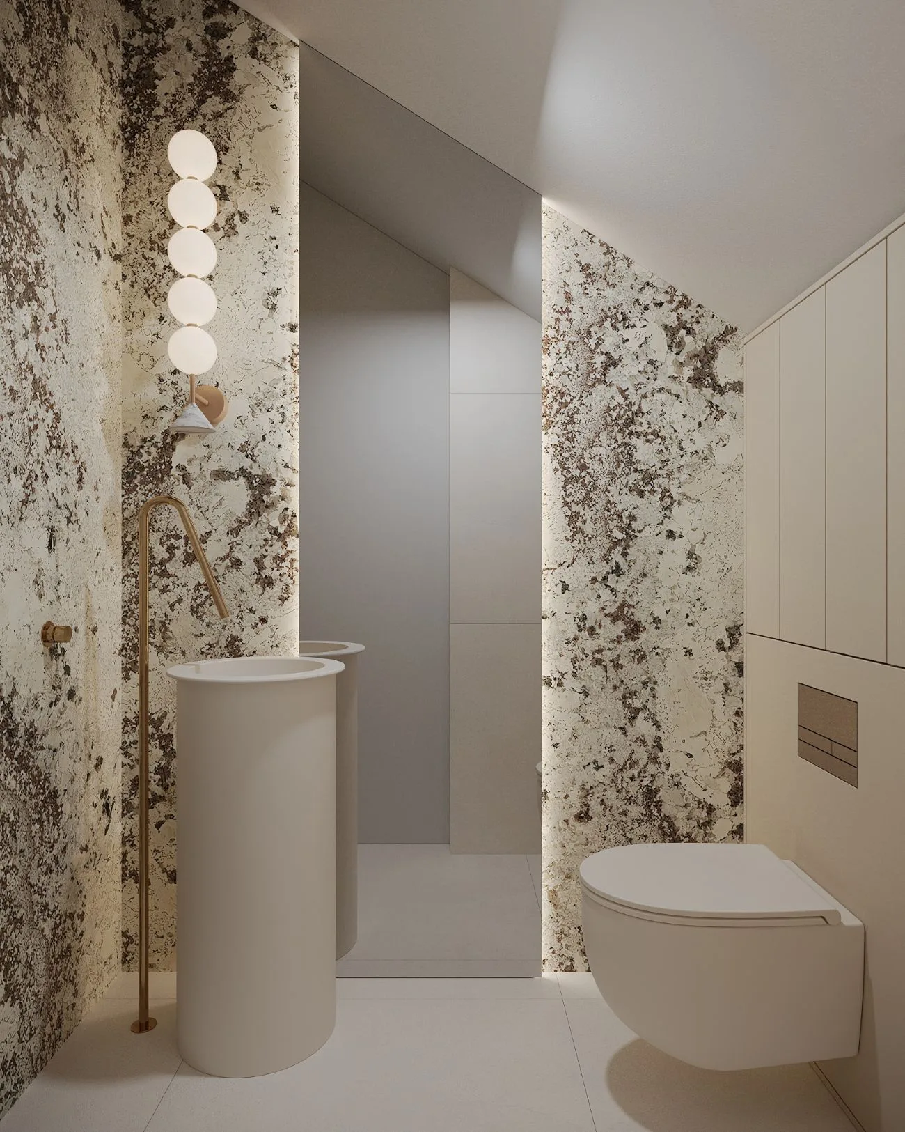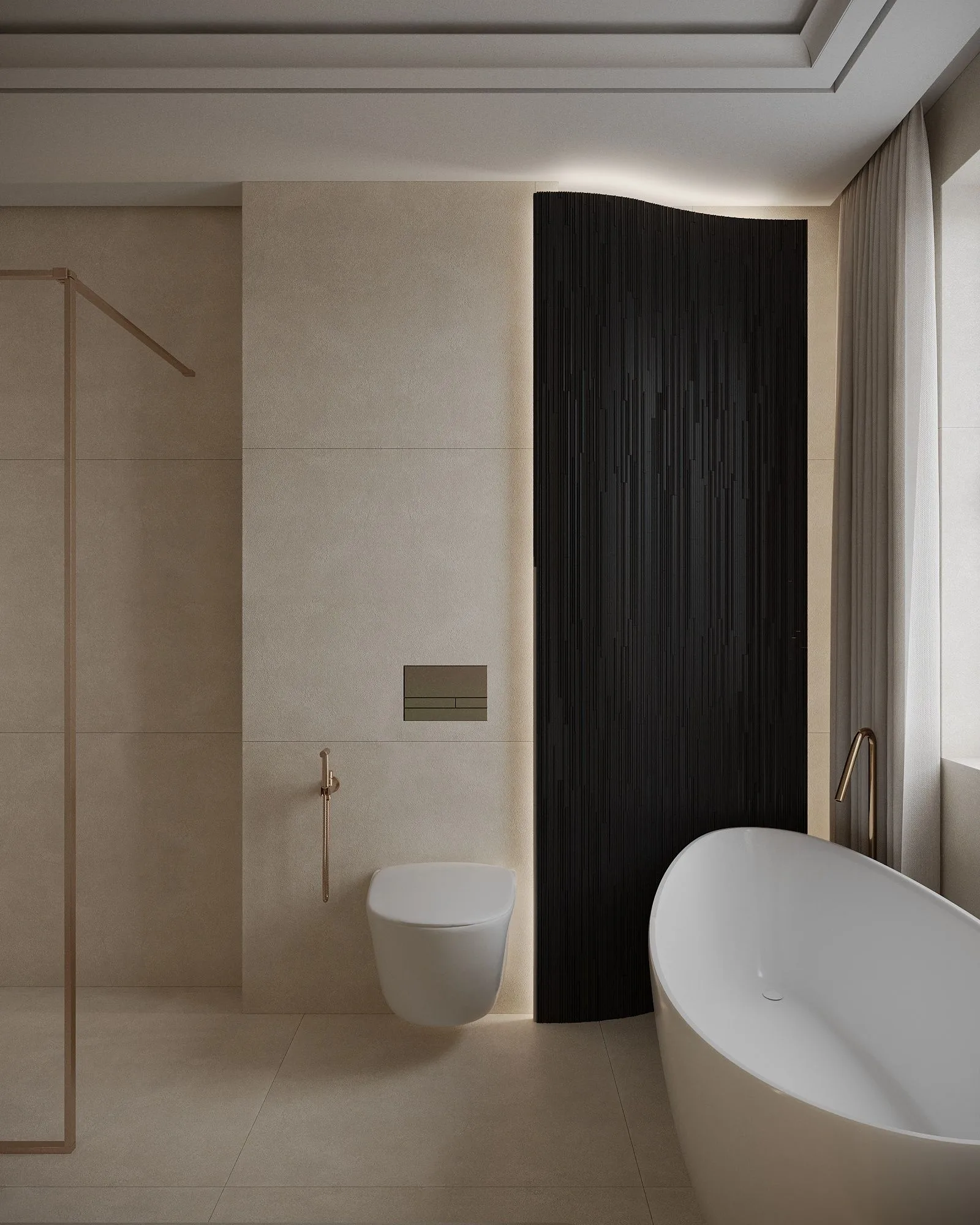 Łazienki wyciszają tę narrację. Utrzymane w beżach i kamiennych okładzinach, działają jak prywatne strefy regeneracji. Ich siła nie tkwi w efekciarstwie, lecz w harmonii proporcji, czystości materiałowej i subtelności rozwiązań. To przestrzenie, które pozwalają odetchnąć — fizycznie i wizualnie.