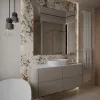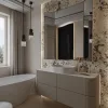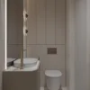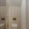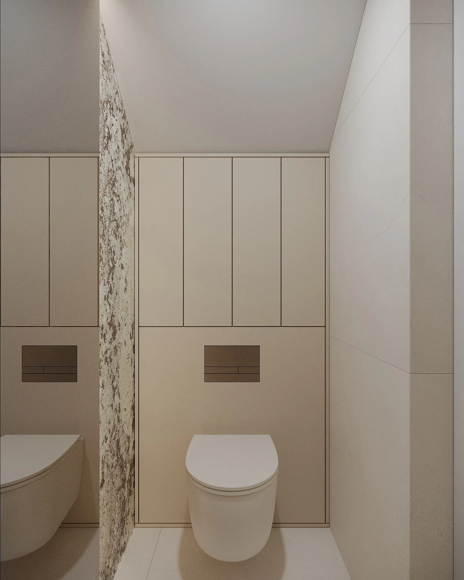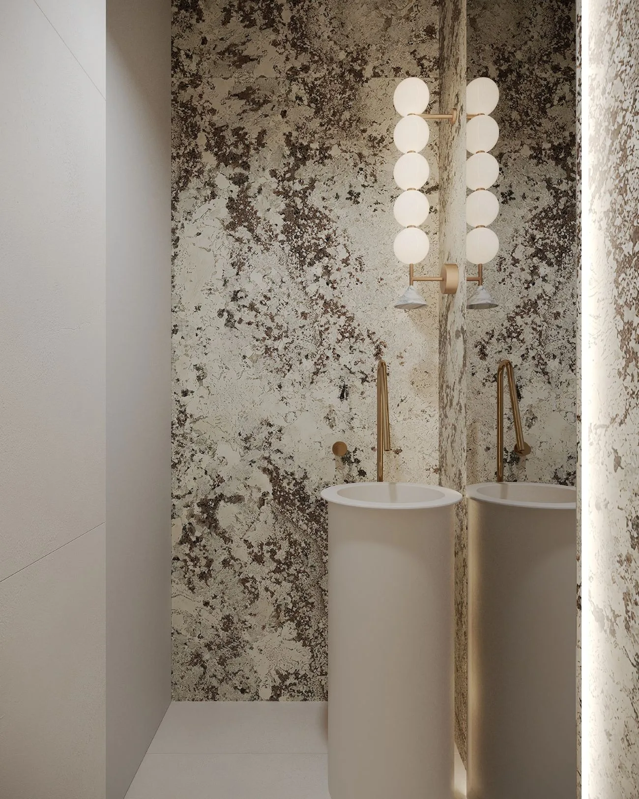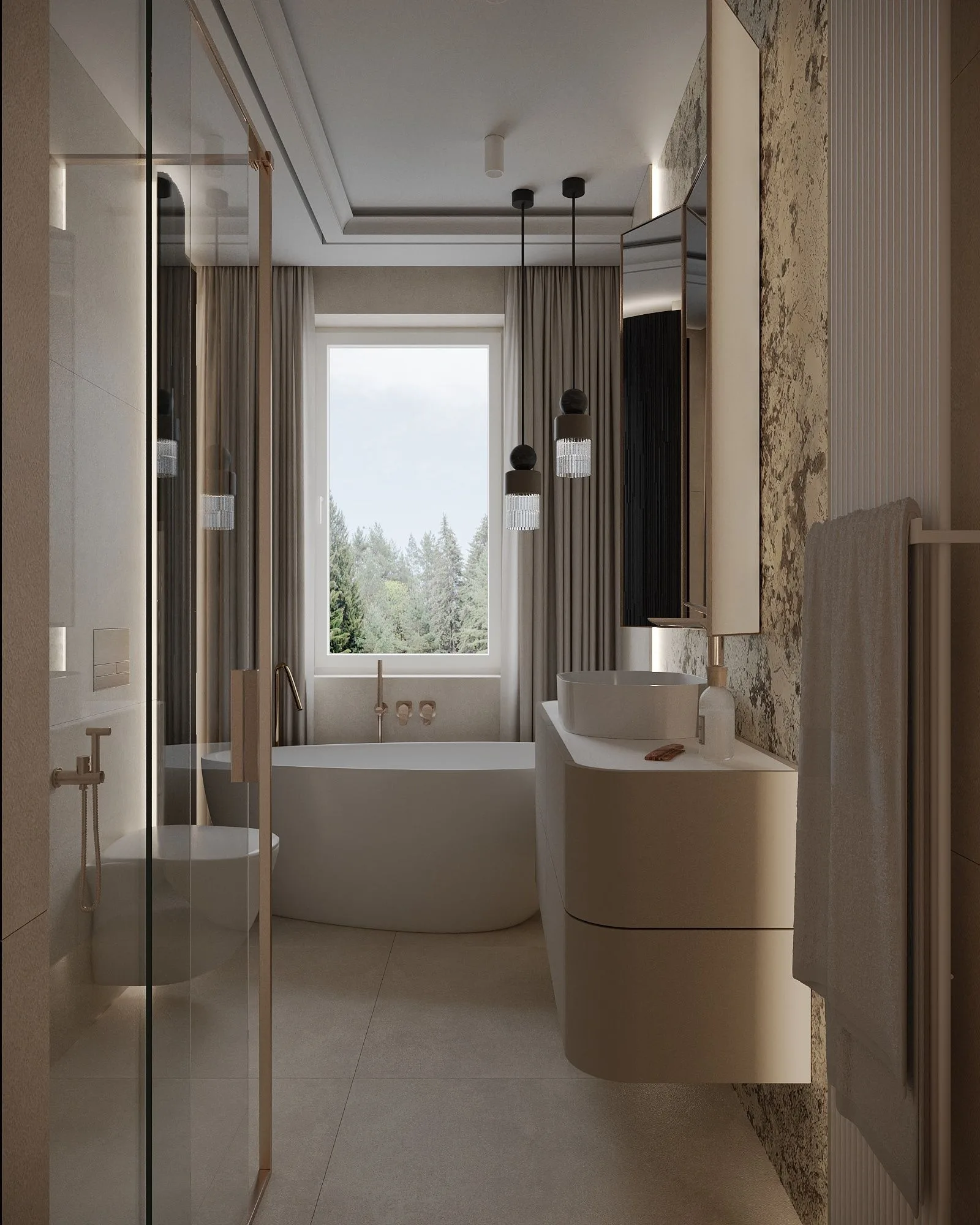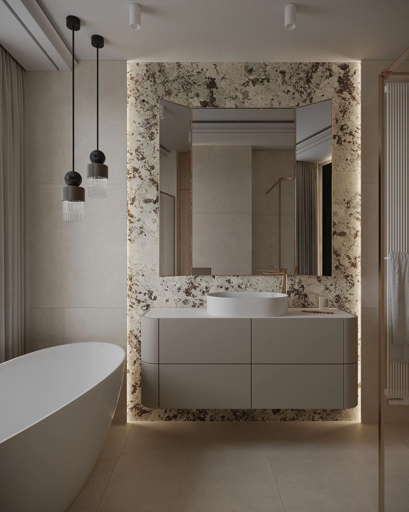 Łazienki wyciszają tę narrację. Utrzymane w beżach i kamiennych okładzinach, działają jak prywatne strefy regeneracji. Ich siła nie tkwi w efekciarstwie, lecz w harmonii proporcji, czystości materiałowej i subtelności rozwiązań. To przestrzenie, które pozwalają odetchnąć — fizycznie i wizualnie.