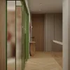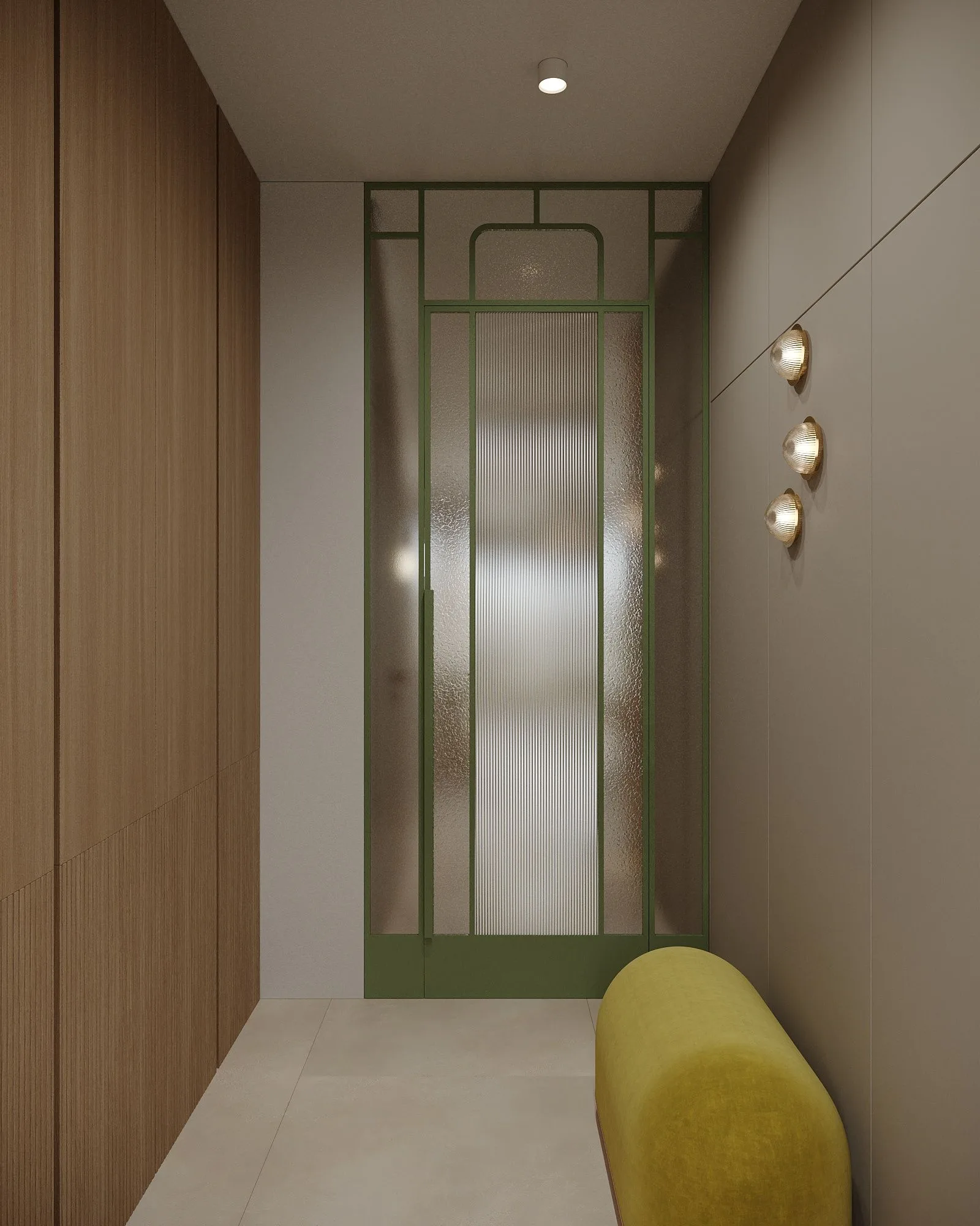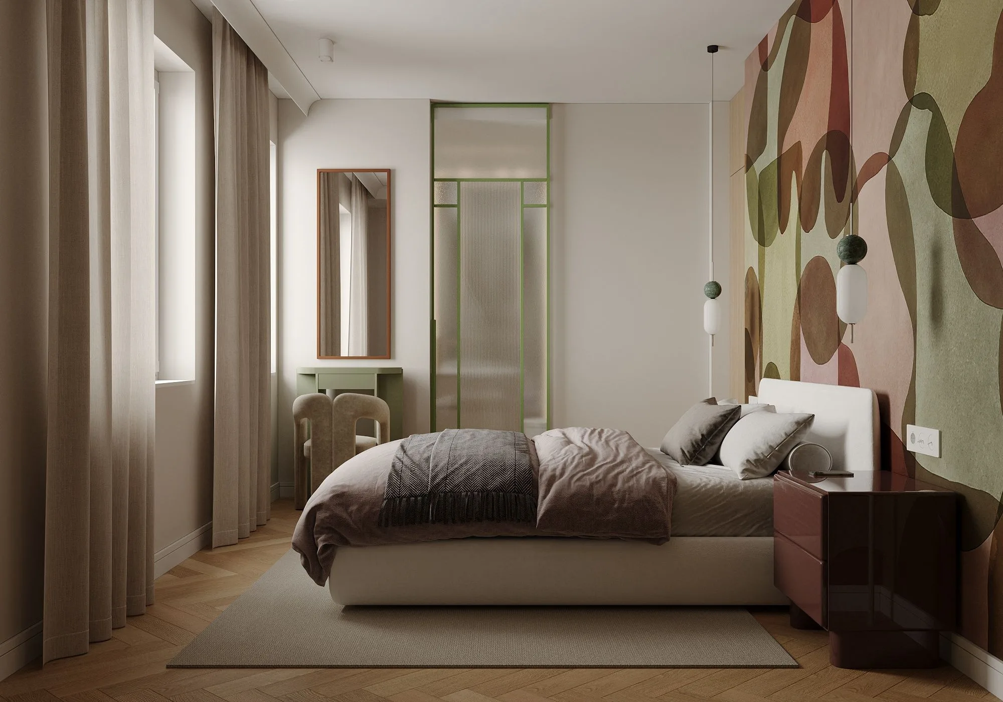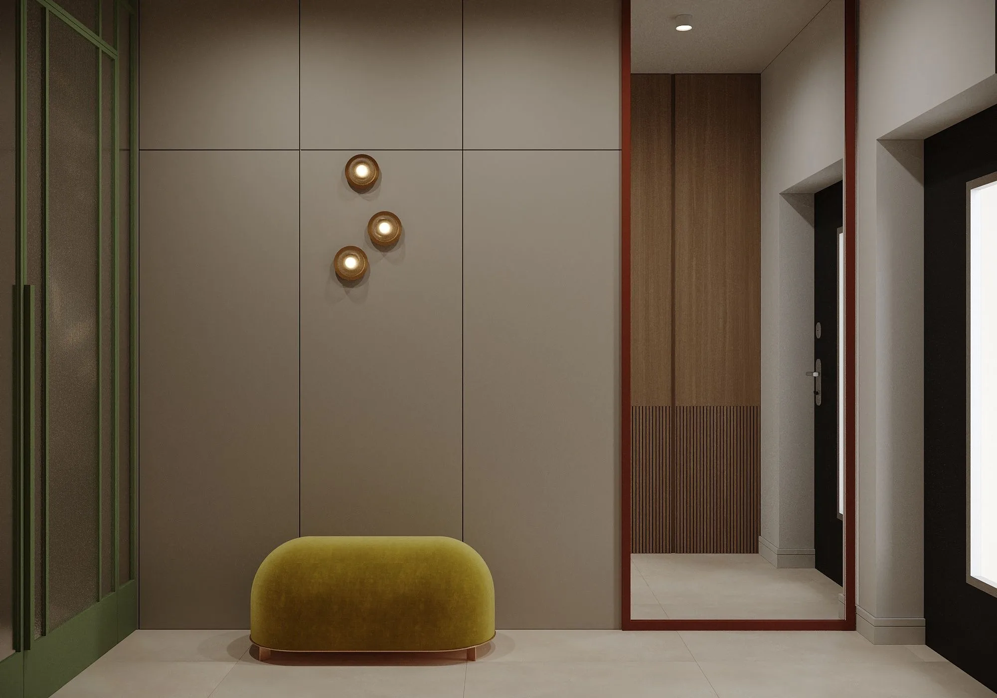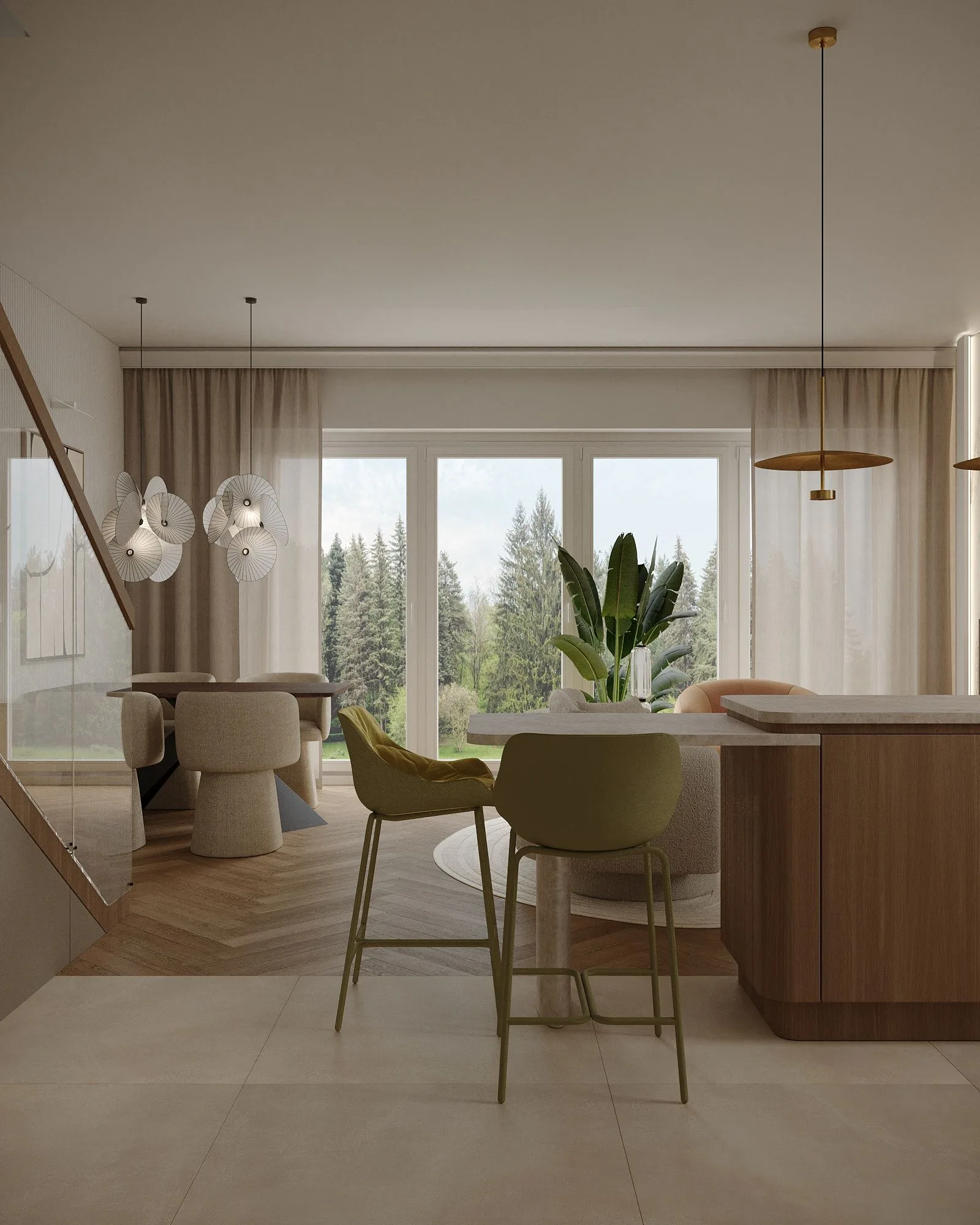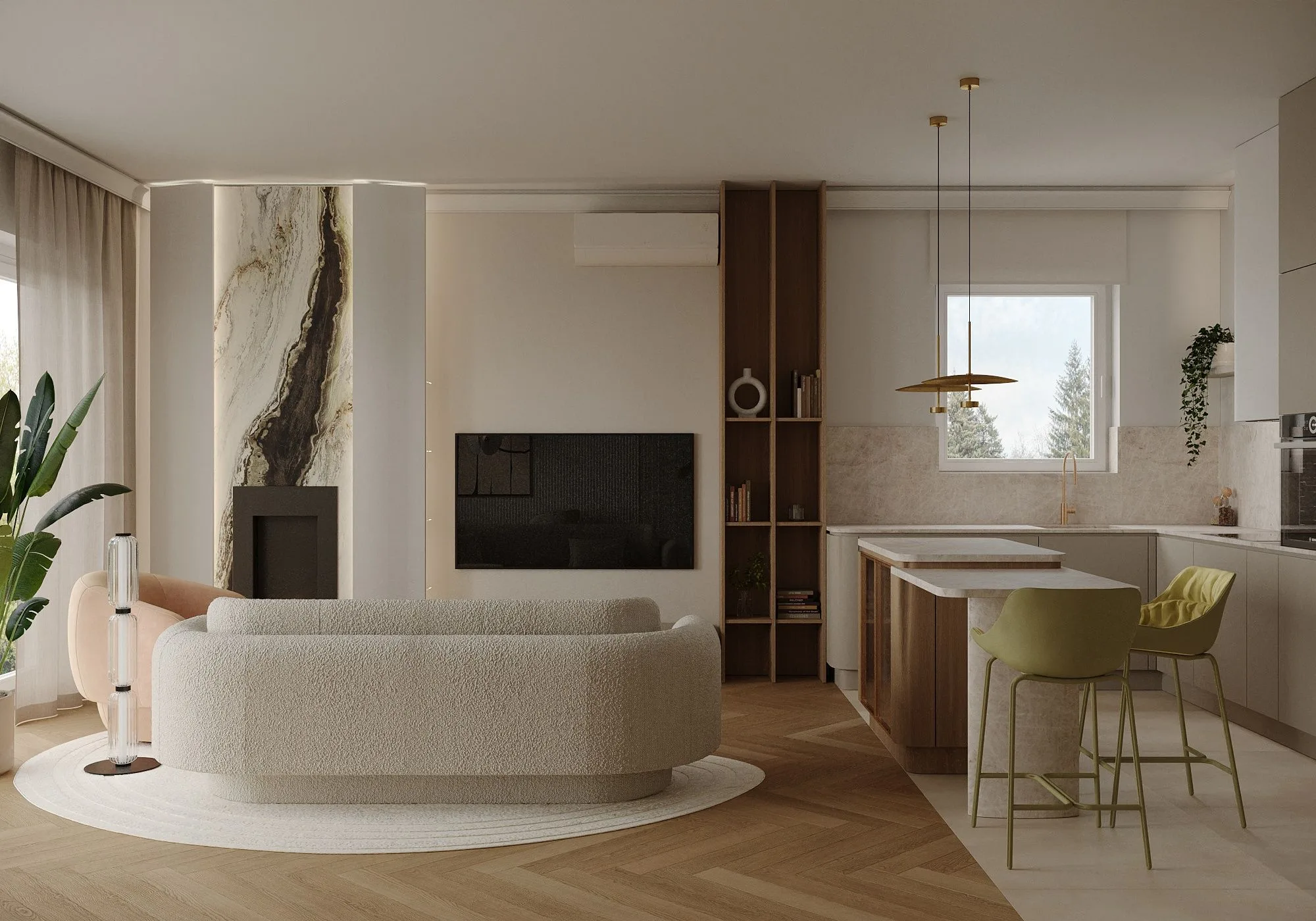 Zastosowana paleta materiałowa została skomponowana z wyjątkową konsekwencją. Dąb, wielkoformatowe płyty kamienne, bouclé i aksamit, dopełnione mosiężnymi detalami oraz prowadzone przez trzy wyraziste barwy — burgund, oliwkę i koniakowy brąz — tworzą przestrzeń rzadką w swoim wyważeniu. To projekt, który nie ulega chwilowym modom, lecz buduje własny, dojrzały język.