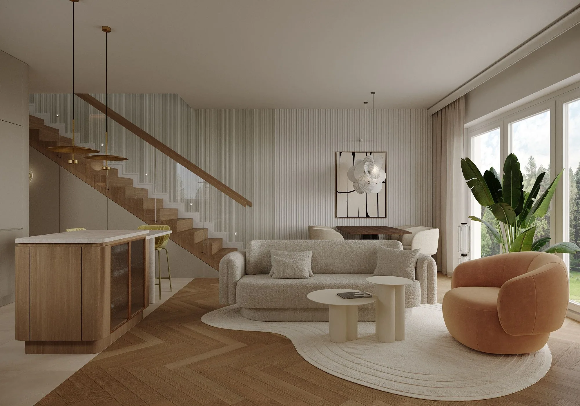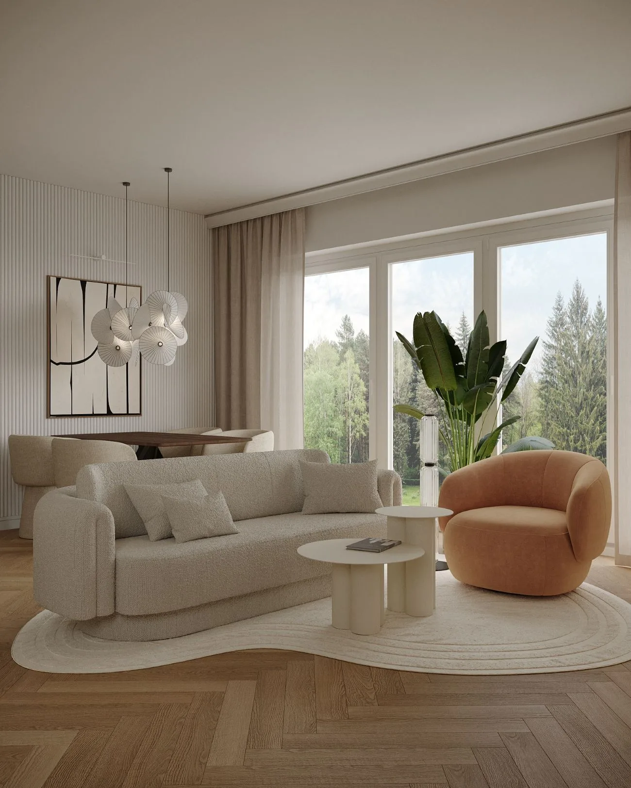 W części wypoczynkowej miękkość form zyskuje jeszcze bardziej zmysłowy wymiar. Zaoblona sofa oraz koniakowy fotel o organicznej sylwecie współtworzą krajobraz codziennego odpoczynku. Nie dominują przestrzeni, ale ją dopełniają — otwierając wnętrze na ogród i wzmacniając relację pomiędzy domem a tym, co znajduje się poza nim. To salon, który nie jest jedynie reprezentacyjny. On naprawdę zaprasza, by zwolnić.