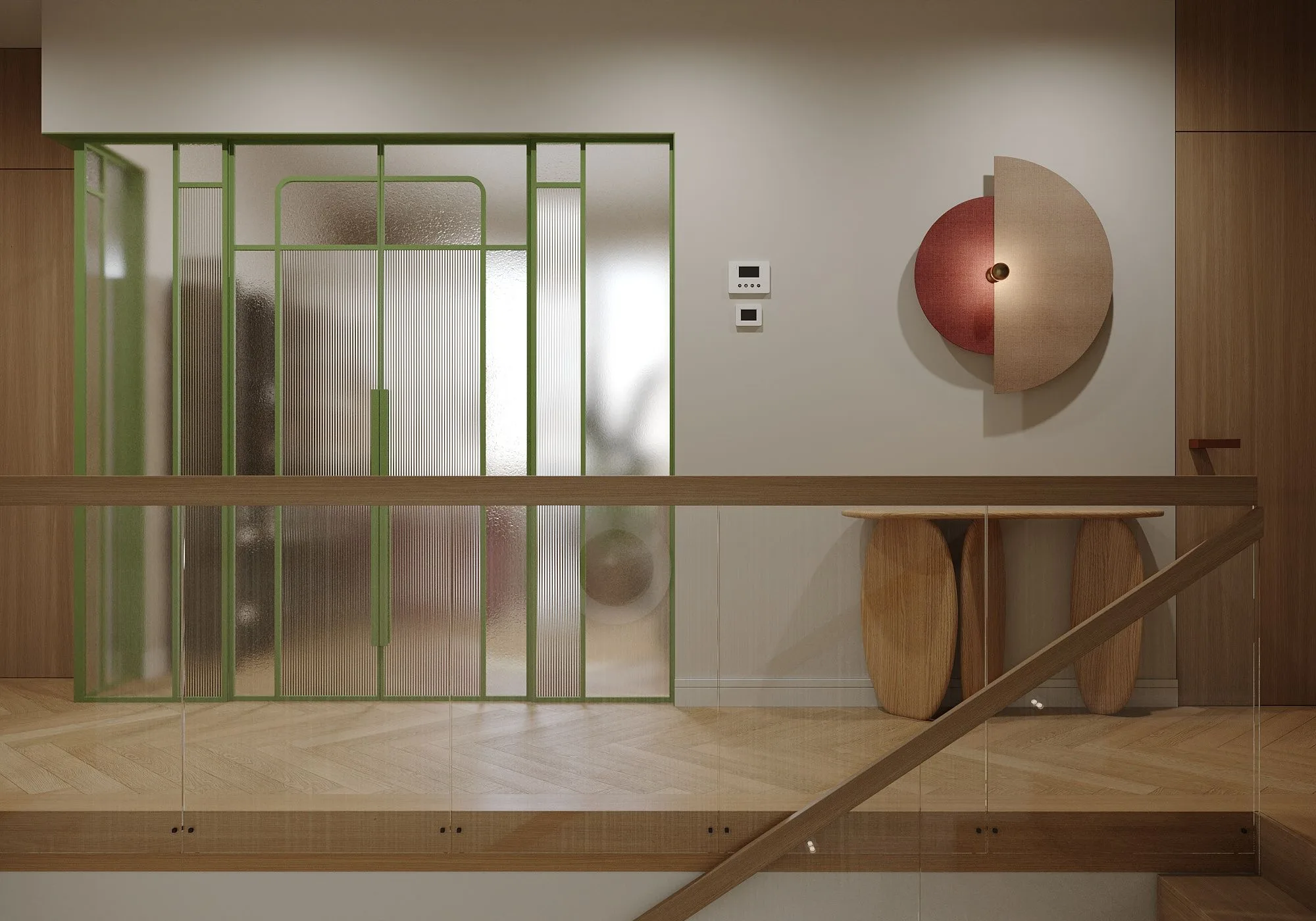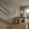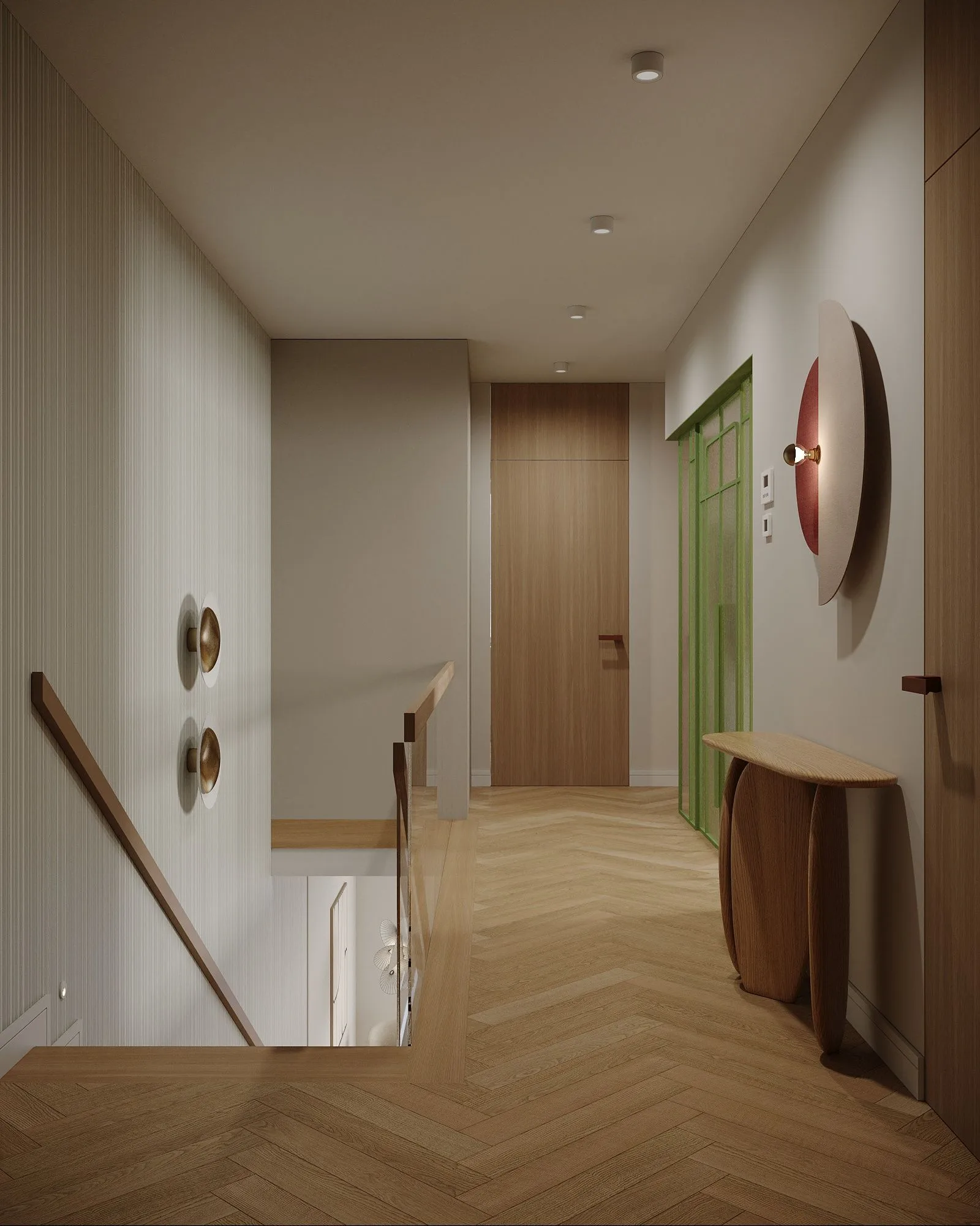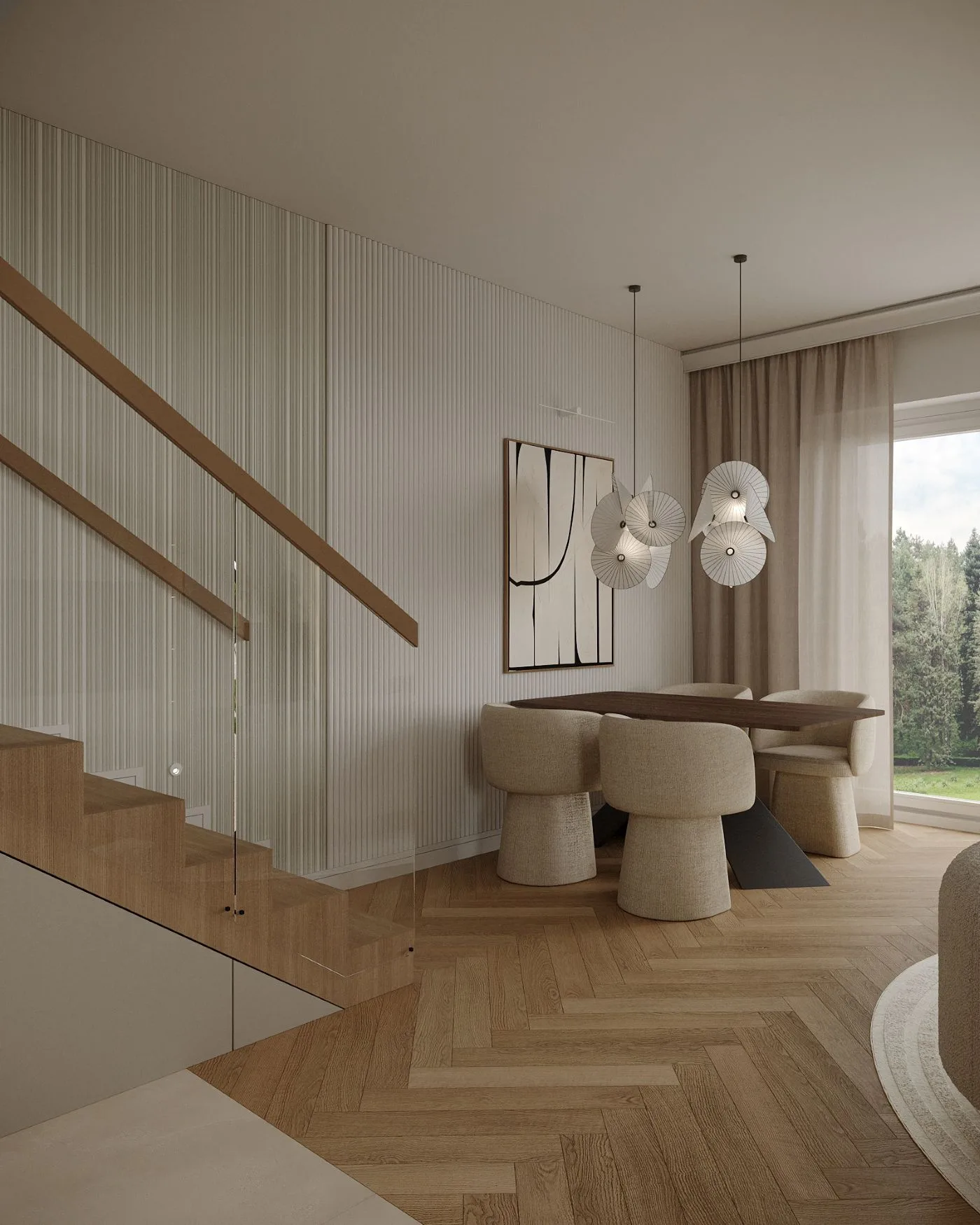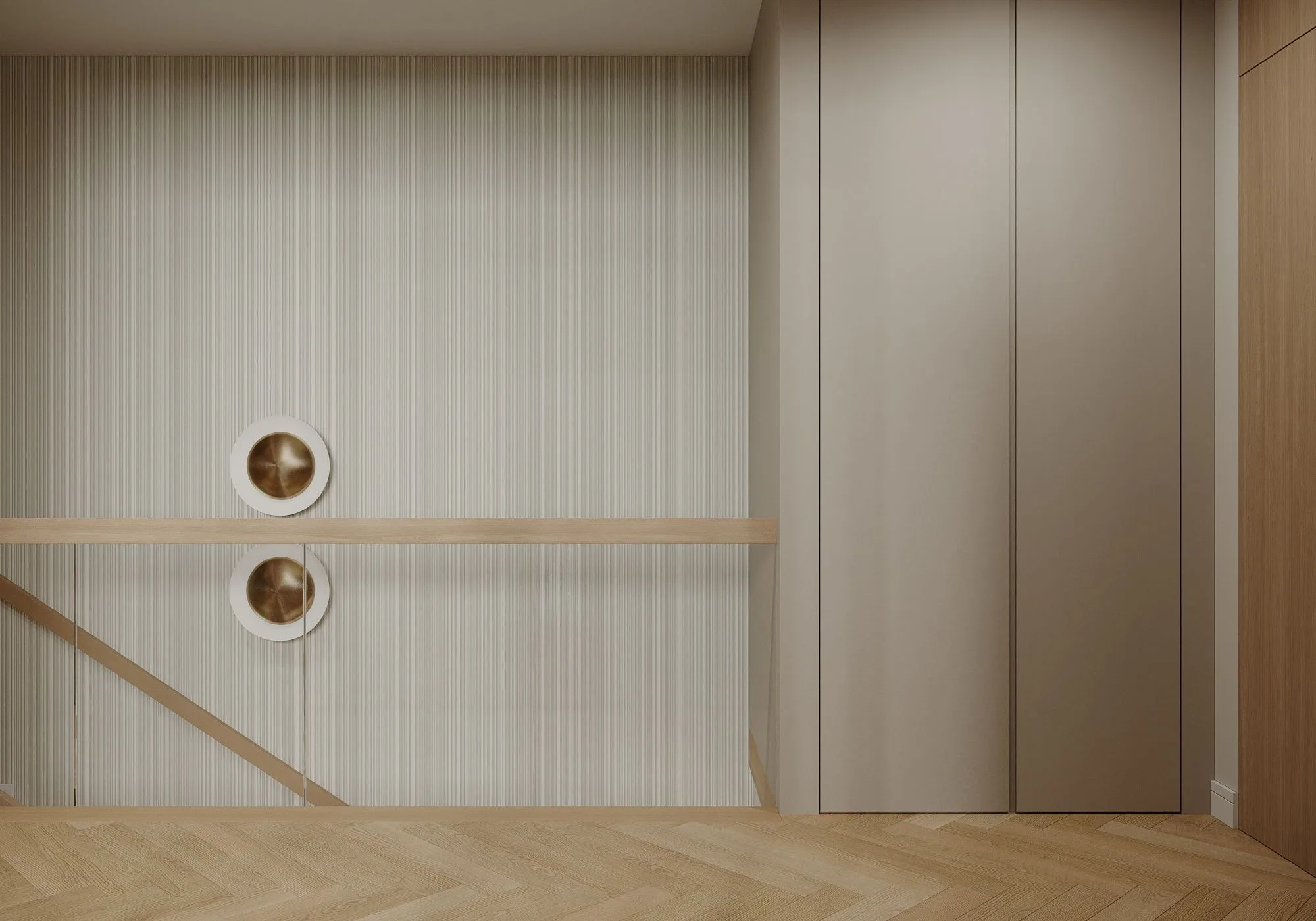 Komunikacja pionowa została potraktowana z równą uwagą jak główne strefy domu. Klatka schodowa, wykończona tapetą, z podświetlonymi drewnianymi stopniami i nowoczesną, przeszkloną balustradą, staje się pełnoprawnym doświadczeniem przestrzennym. Nie jest jedynie przejściem pomiędzy kondygnacjami, ale miejscem, w którym światło, faktura i detal współtworzą atmosferę. Architektura prowadzi tu użytkownika w sposób płynny, niemal scenograficzny, nie tracąc przy tym swojej funkcjonalnej klarowności.