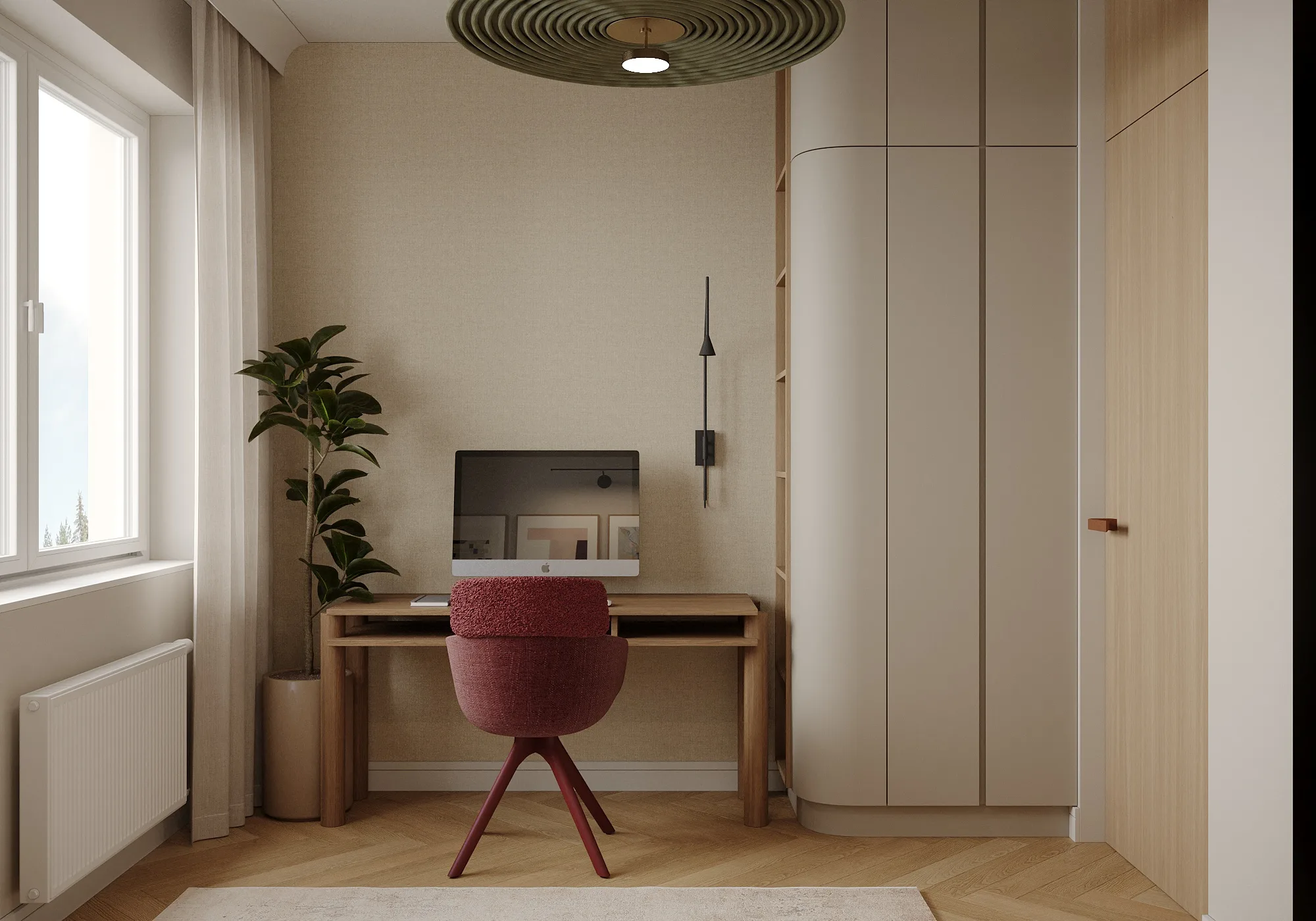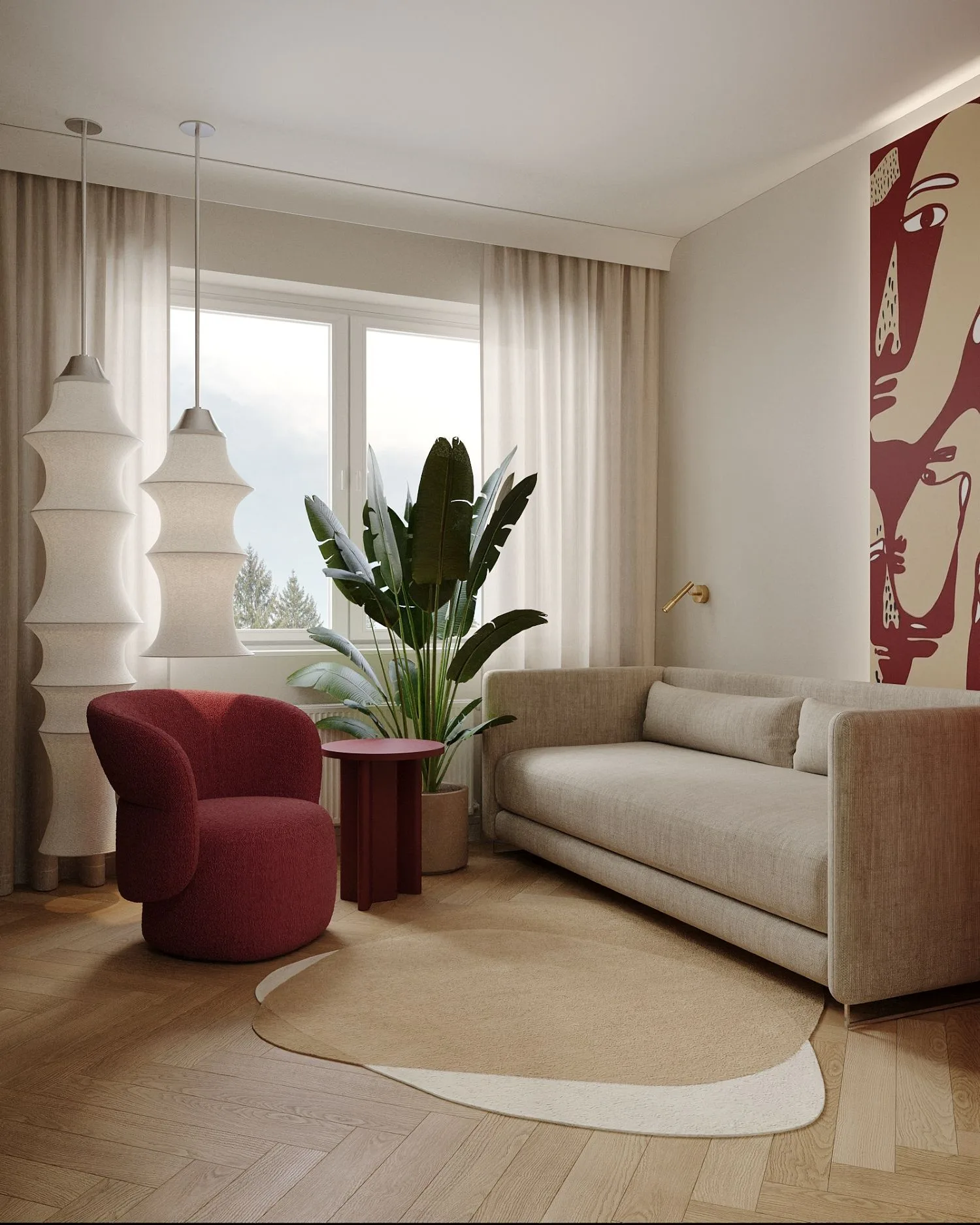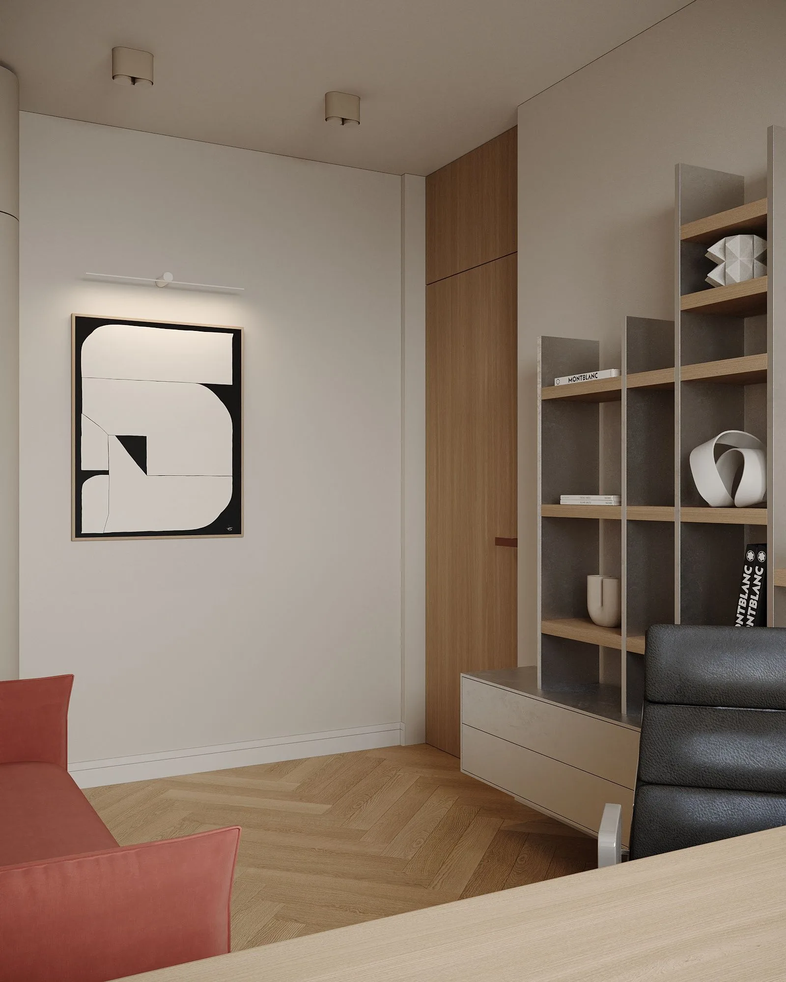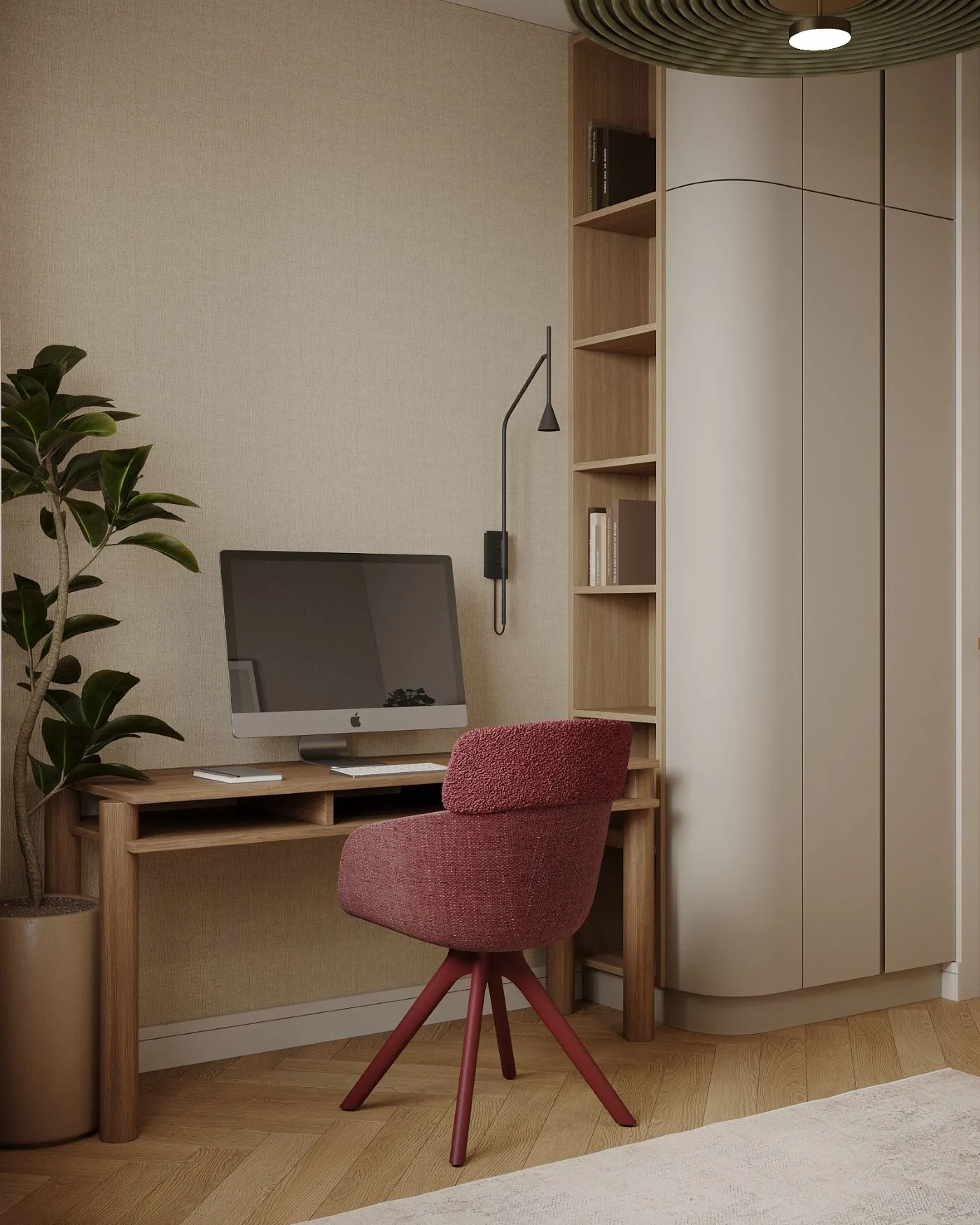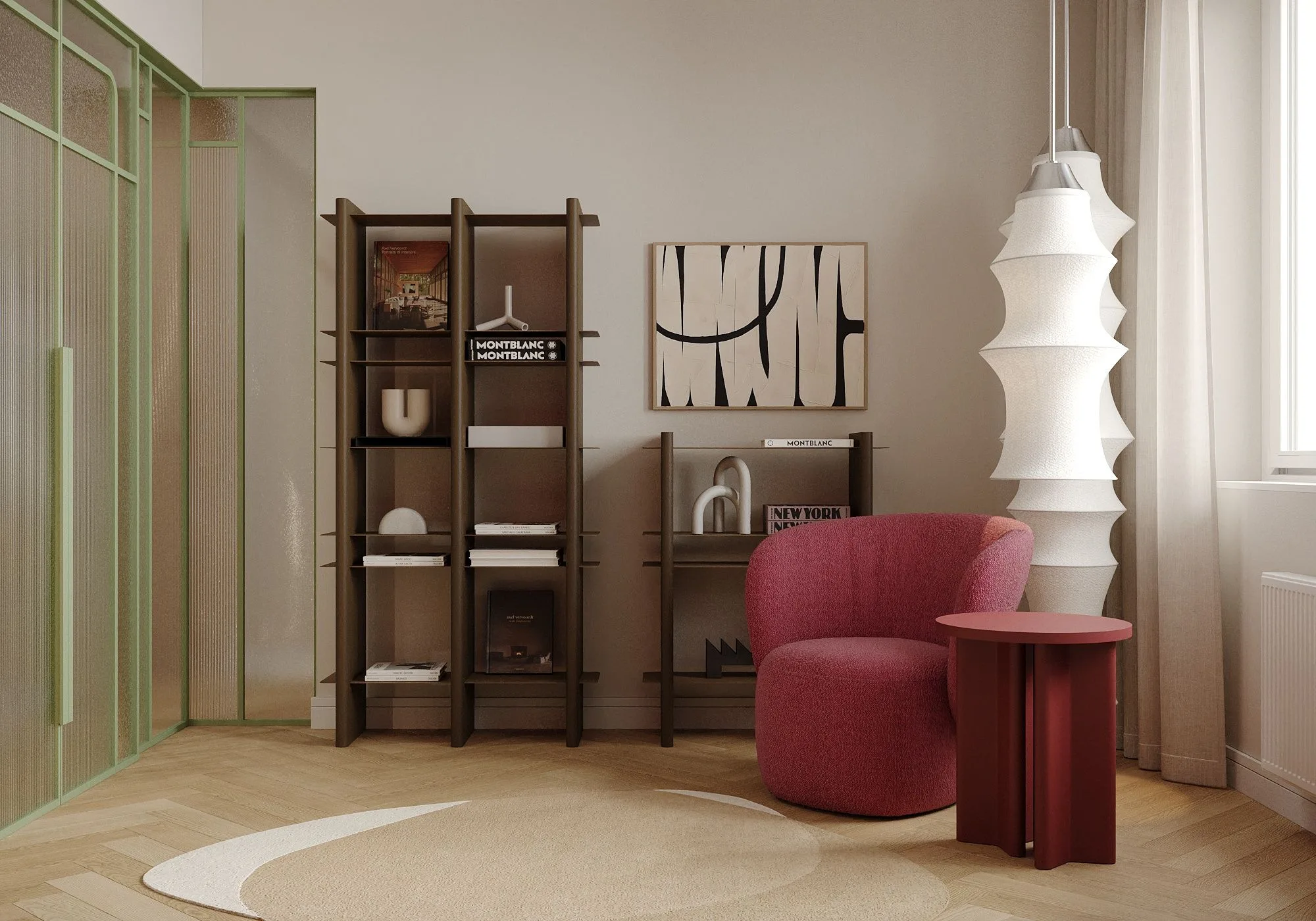 Bazę kompozycji stanowią beże i naturalne drewno, które wprowadzają do wnętrza spokój oraz ponadczasowy porządek. Na tym tle pojawiają się barwy bardziej odważne — burgund, szałwia i nasycone nuty pomarańczu. Nie funkcjonują jednak jako dekoracyjny gest oderwany od całości. Zostały wpisane w architekturę wnętrza z dużą dyscypliną, stając się nośnikiem emocji, głębi i wizualnego napięcia. Całość dopełniają mosiężne akcenty, które subtelnie rozświetlają kompozycję i nadają jej wyrafinowany ton.