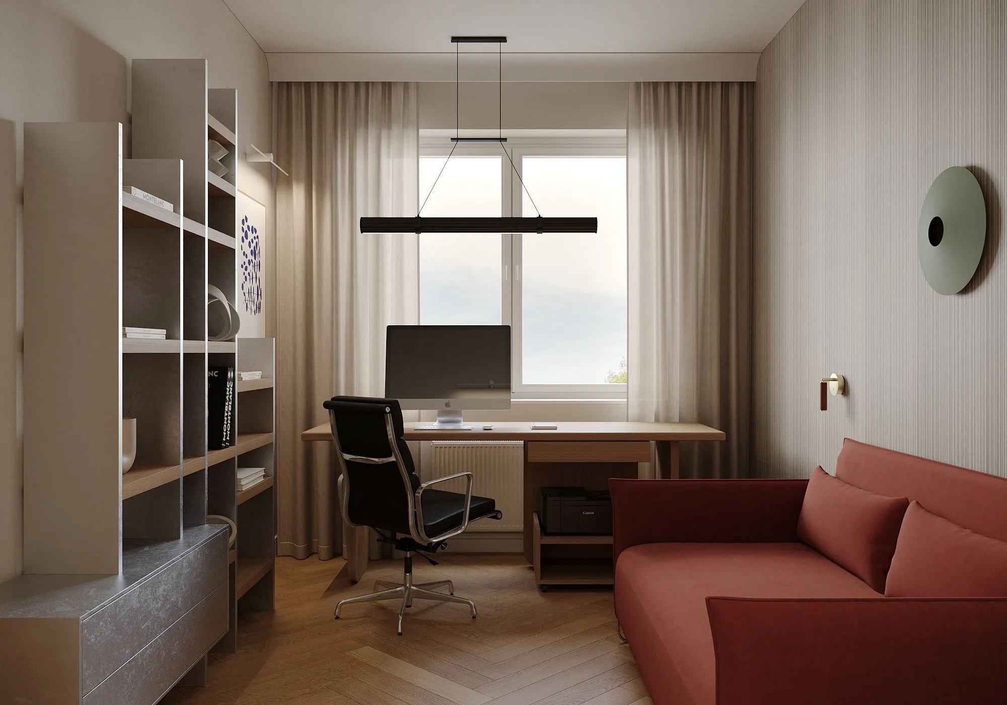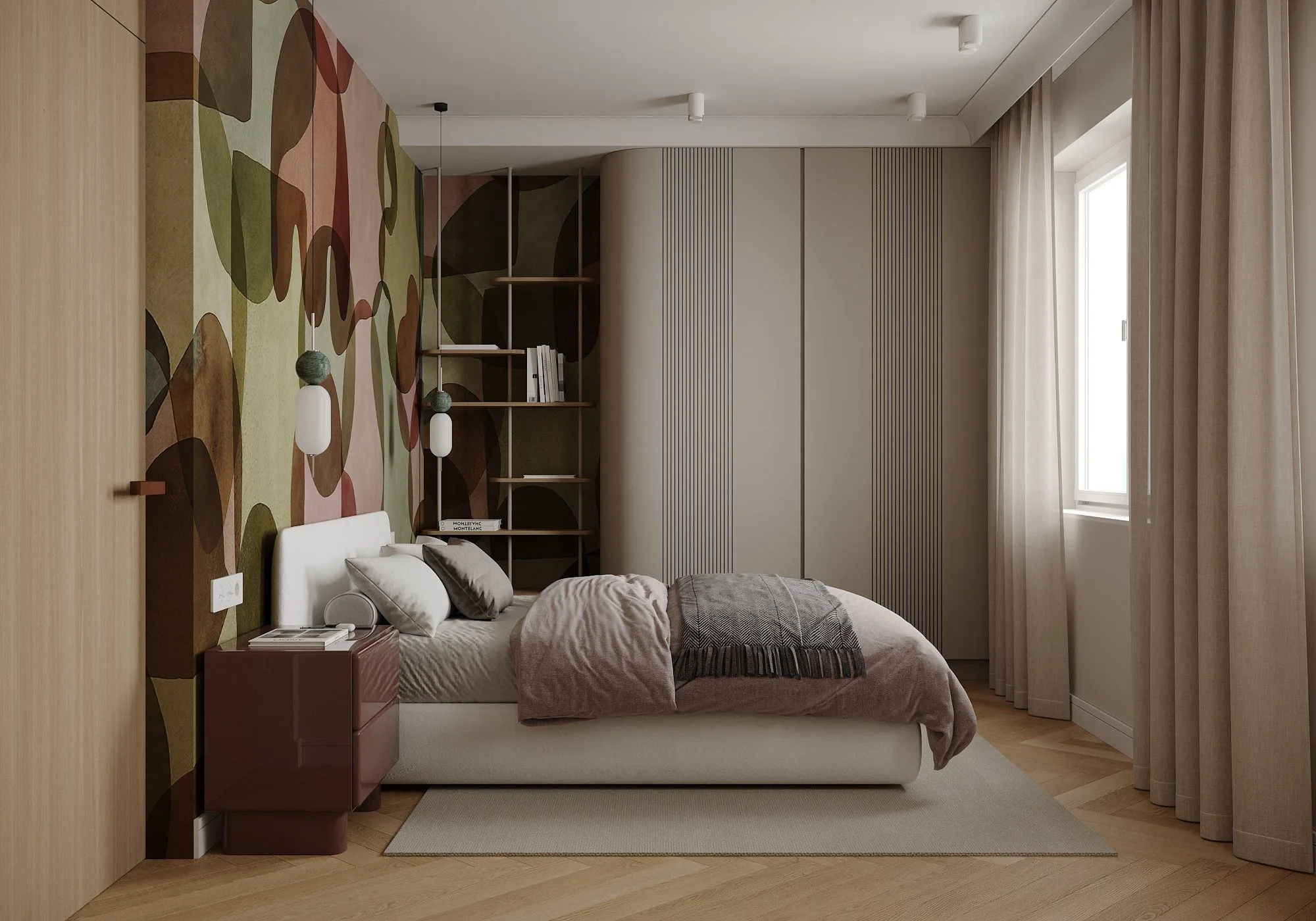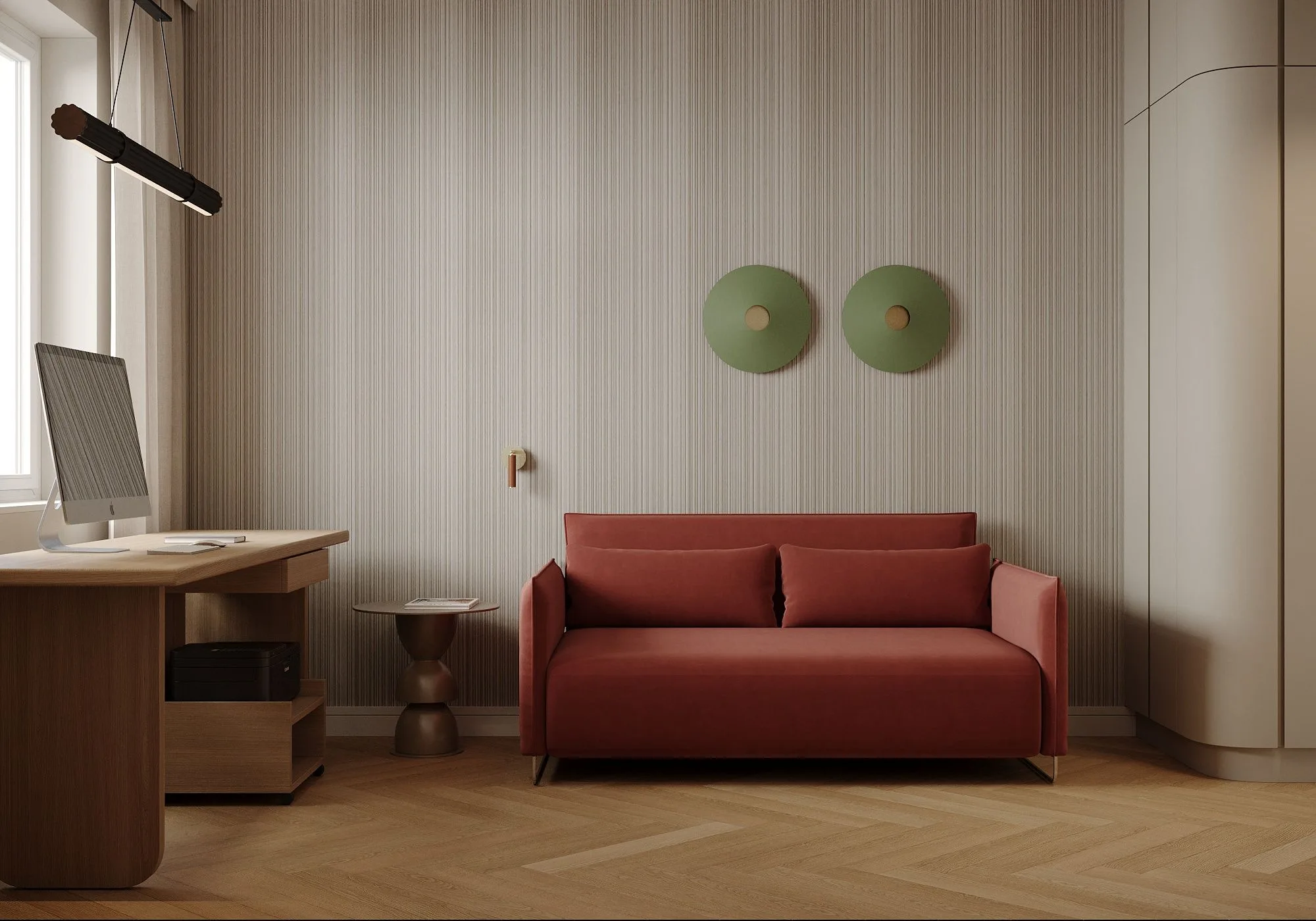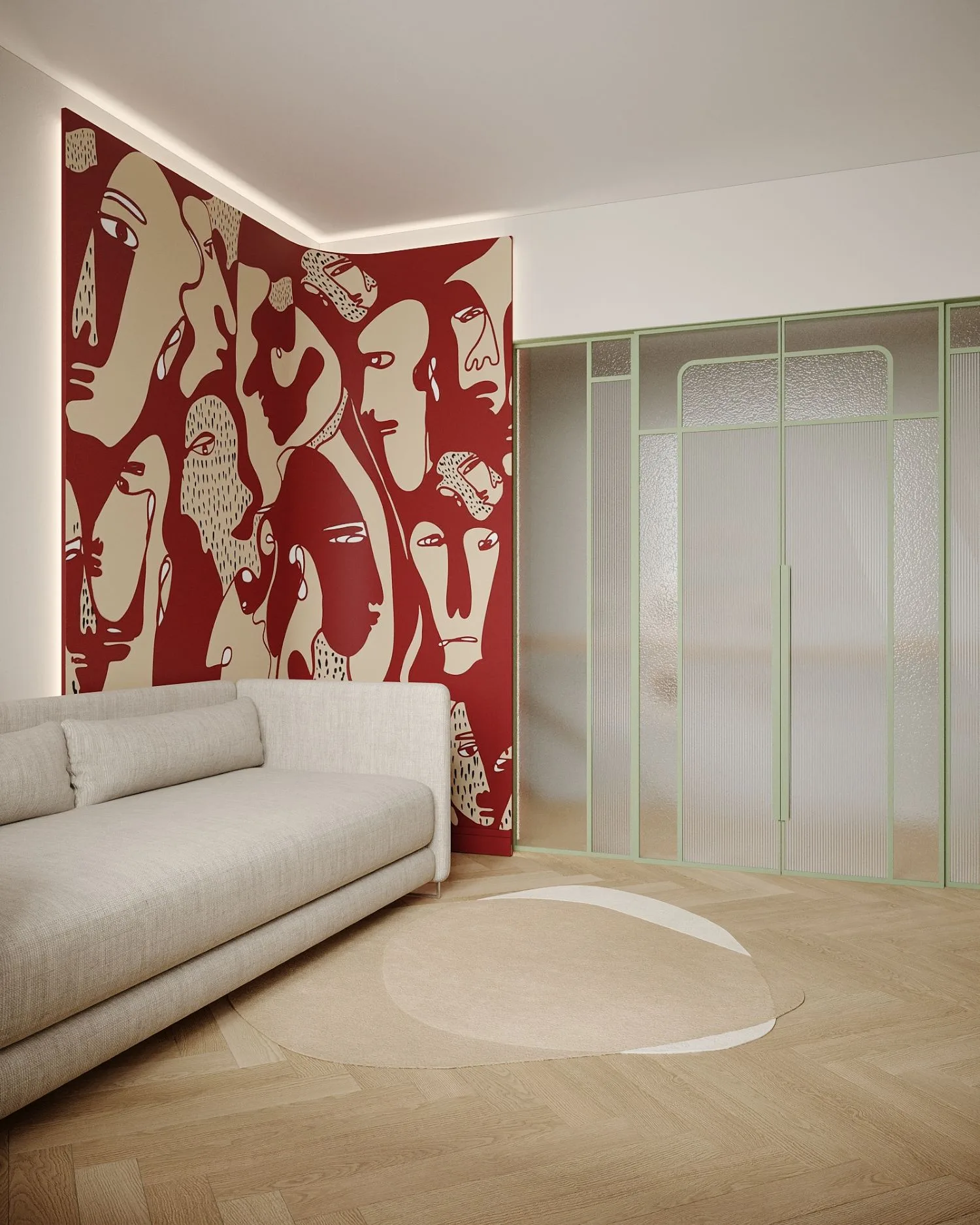 Bazę kompozycji stanowią beże i naturalne drewno, które wprowadzają do wnętrza spokój oraz ponadczasowy porządek. Na tym tle pojawiają się barwy bardziej odważne — burgund, szałwia i nasycone nuty pomarańczu. Nie funkcjonują jednak jako dekoracyjny gest oderwany od całości. Zostały wpisane w architekturę wnętrza z dużą dyscypliną, stając się nośnikiem emocji, głębi i wizualnego napięcia. Całość dopełniają mosiężne akcenty, które subtelnie rozświetlają kompozycję i nadają jej wyrafinowany ton.