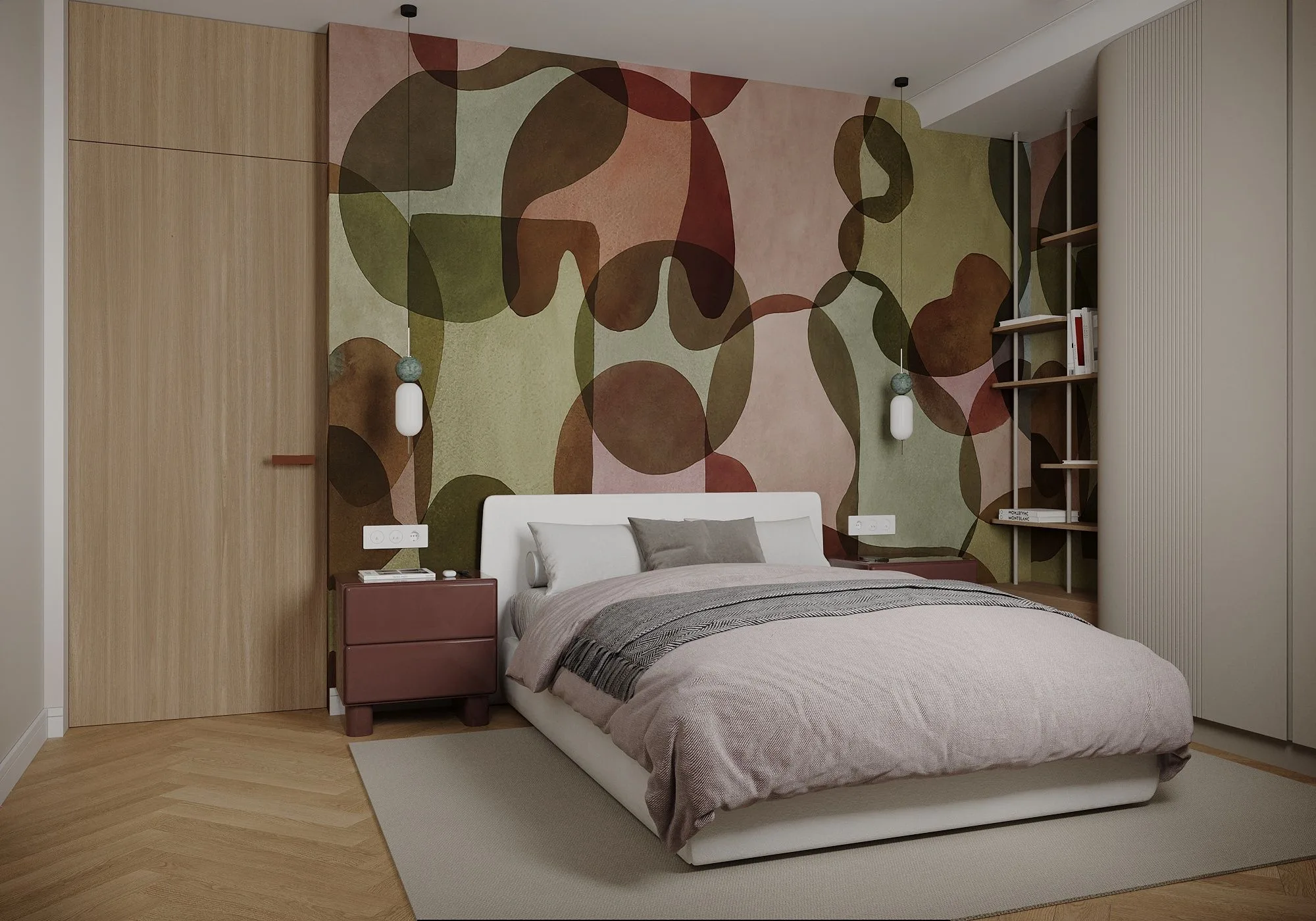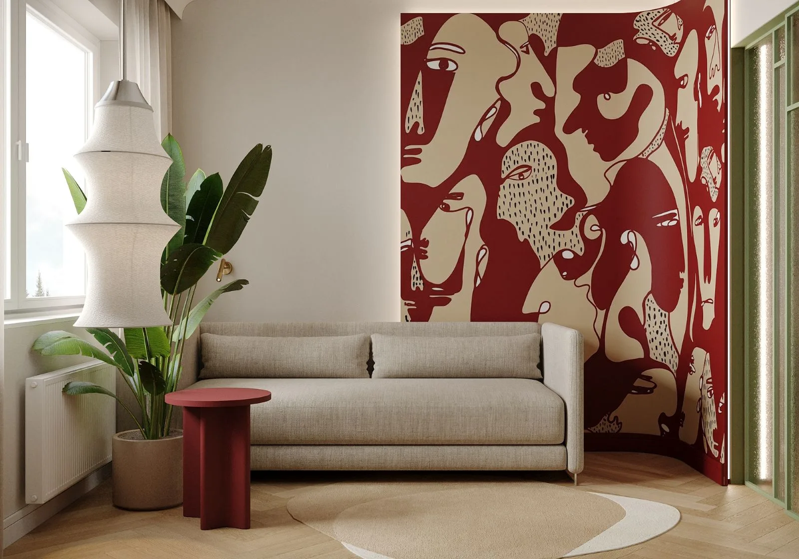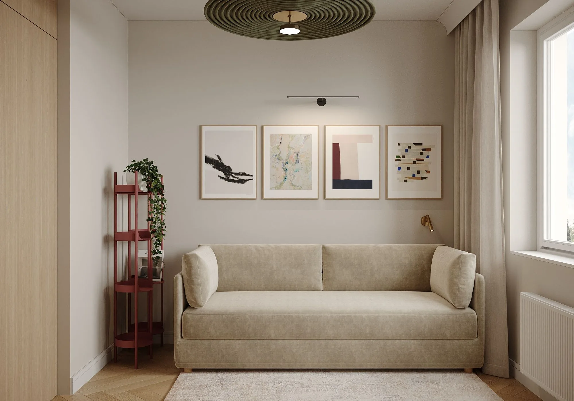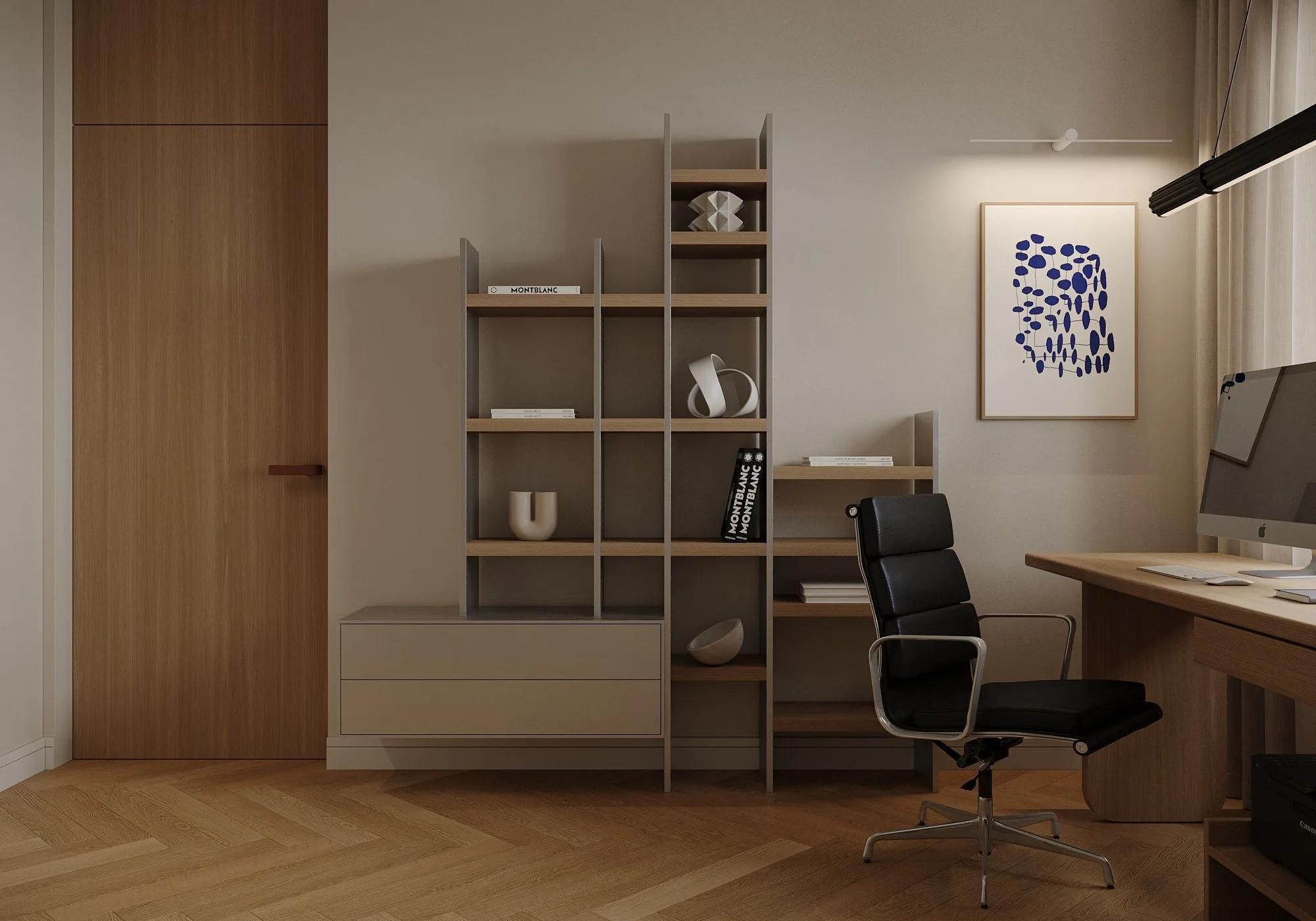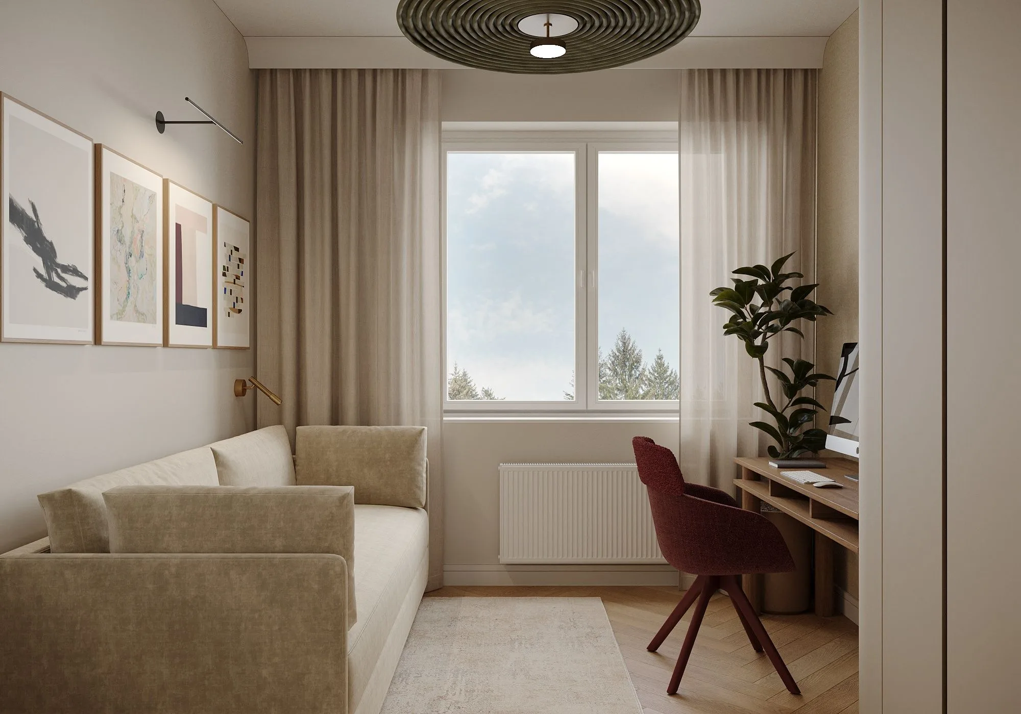 Bazę kompozycji stanowią beże i naturalne drewno, które wprowadzają do wnętrza spokój oraz ponadczasowy porządek. Na tym tle pojawiają się barwy bardziej odważne — burgund, szałwia i nasycone nuty pomarańczu. Nie funkcjonują jednak jako dekoracyjny gest oderwany od całości. Zostały wpisane w architekturę wnętrza z dużą dyscypliną, stając się nośnikiem emocji, głębi i wizualnego napięcia. Całość dopełniają mosiężne akcenty, które subtelnie rozświetlają kompozycję i nadają jej wyrafinowany ton.