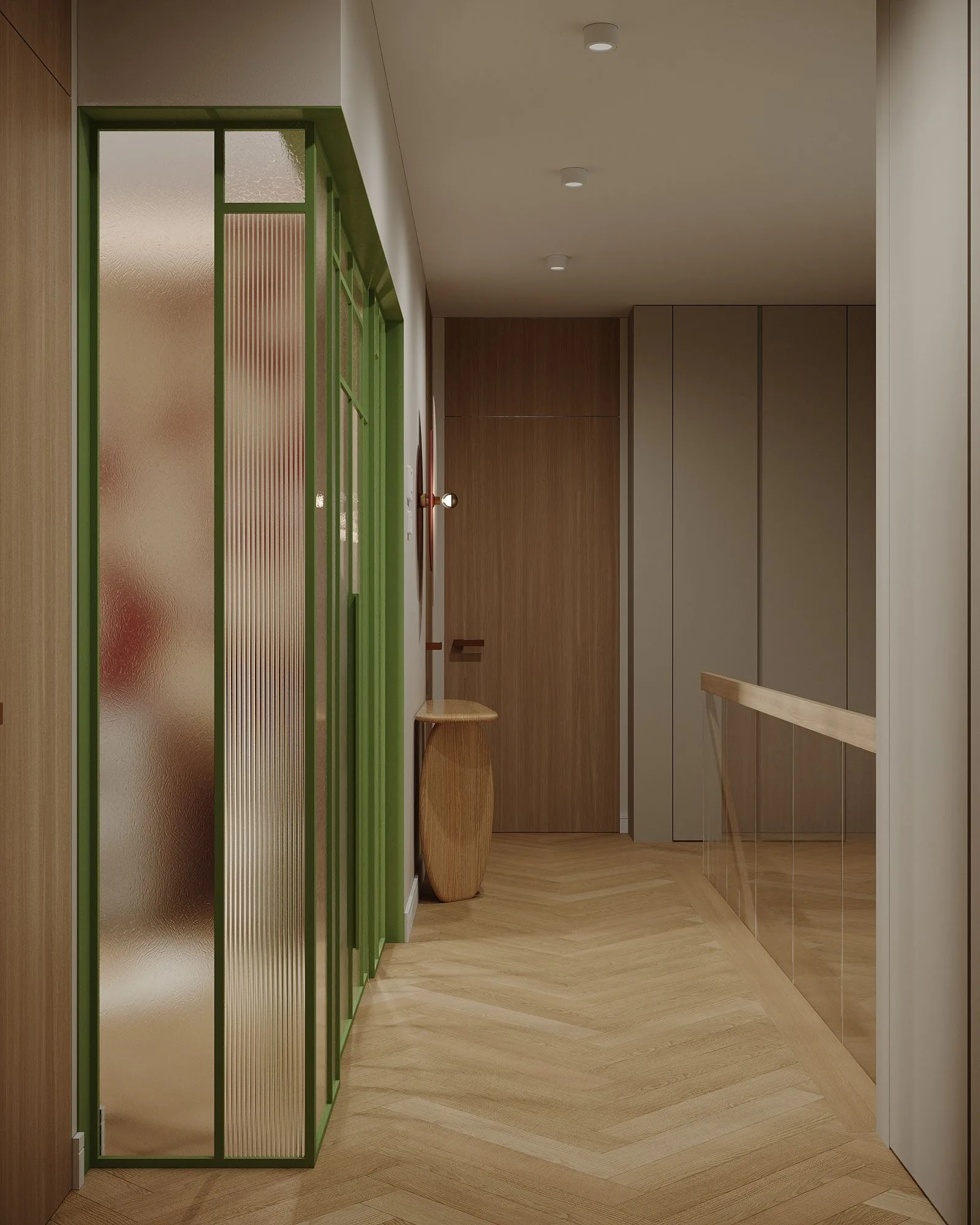 Na piętrze projekt nabiera bardziej osobistego, introspektywnego charakteru. Strefa prywatna została pomyślana jako sekwencja wnętrz zróżnicowanych nastrojem, lecz spójnych materiałowo. Przeszklona biblioteka z burgundową tapetą emanuje głębią i intymnością. Gabinet, w którym dominuje chromowana zabudowa meblarska, wnosi bardziej współczesny, lekko chłodny kontrapunkt. Sypialnia natomiast staje się przestrzenią najbardziej zmysłową — odważną, lecz nie krzykliwą. Spotykają się tu nasycone kolory, ornamentowe szkło i naturalne drewno, tworząc wnętrze wielowarstwowe, eleganckie i bardzo świadome w swojej kompozycji.