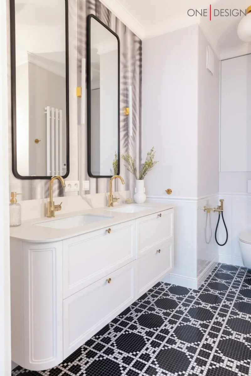 Druga łazienka zwraca uwagę piękną mozaiką na podłodze. Jej klasyczny sznyt podkreślają płytki imitujące boazerię. Nad nimi pojawiła się tapeta z subtelnym tropikalnym wzorem utrzymanym jednak w szarej tonacji. Elegancji wnętrzu nadają złote baterie oraz marmurowy blat z funkcjonalnymi wpuszczanymi weń umywalkami. Aranżację dopieszcza stylizowany grzejnik.