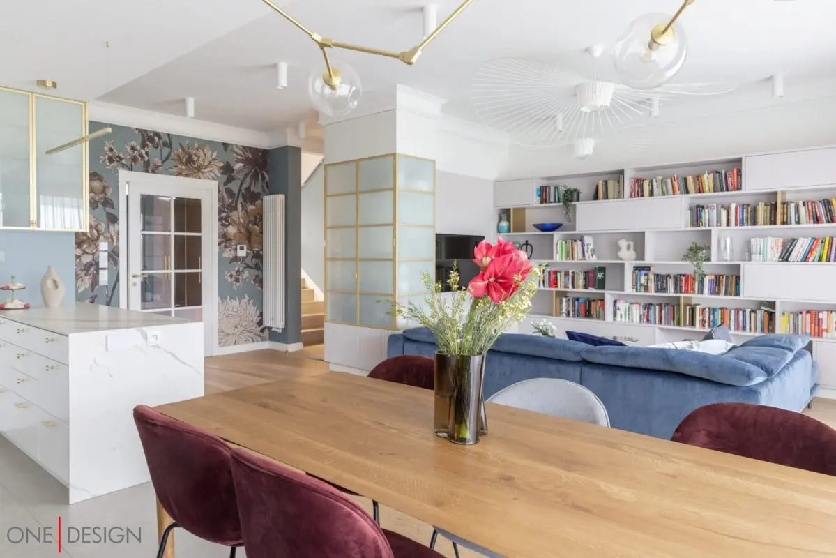 Aranżacja jest utrzymana w stonowanej palecie barw. Dominujące tu biel i błękit uszlachetnia złoto oraz marmur. Przeciwwagą dla stonowanej palety kolorów są bakłażanowe krzesła w jadalni. Całość tonują szare płytki na podłodze w kuchni. Ciekawym zabiegiem są również ryflowane powierzchnie na froncie wyspy, które korespondują z formą grzejników dekoracyjnych. Przytulności wnętrzu nadaje drewno. Elementem przykuwającym wzrok jest tapeta w przeskalowane kwiaty, która wprowadza do nowoczesnego domu nutę klimatu retro.