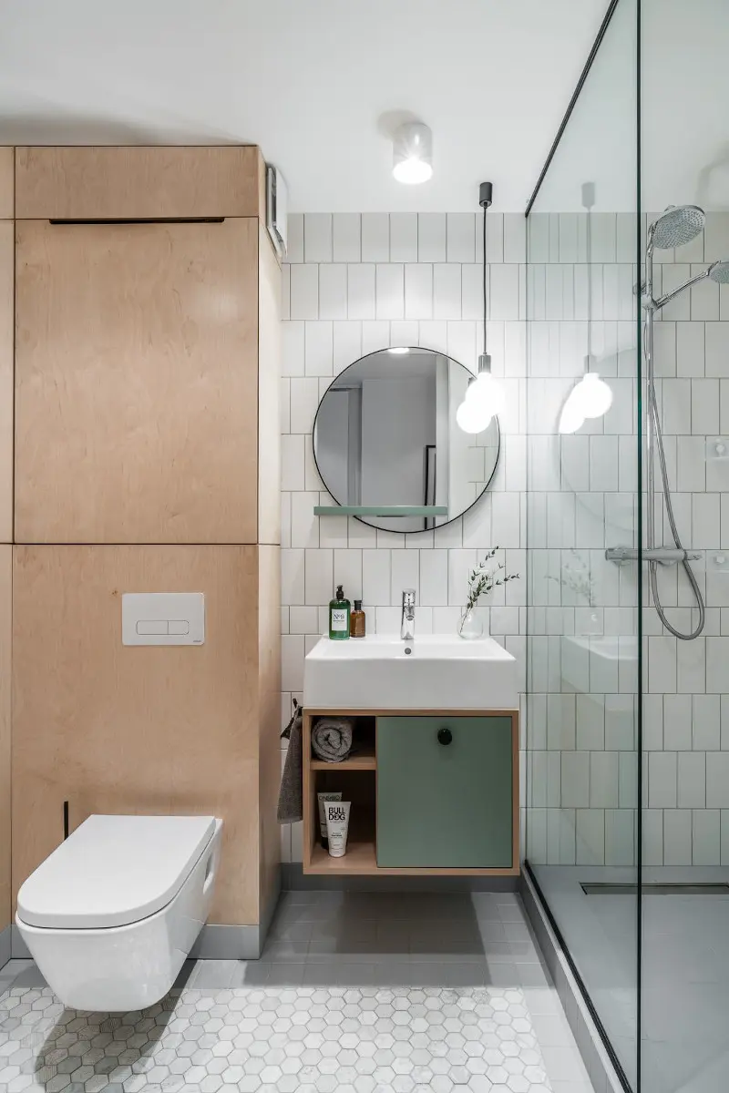 Łazienka jest spójna kolorystycznie z resztą mieszkania. Zanurzeniu się w harmonii sprzyja ograniczona do minimum liczba przedmiotów. Sprawdzone rozwiązania uzupełnia spokojna baza białych i szarych płytek, ocieplona sklejką wyeksponowaną na dużej powierzchni szaf oraz wspomnianych wcześniej elementach w kolorze zielonym.