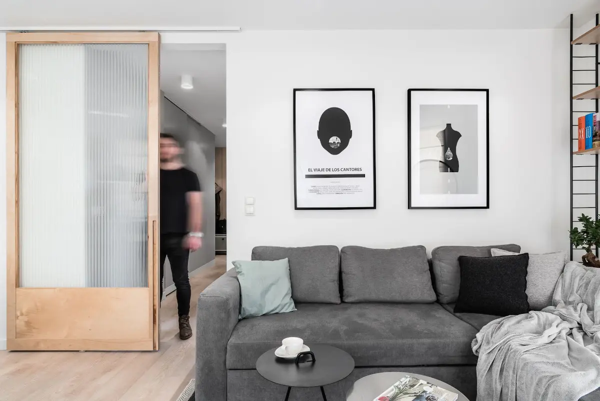 Zdecydowano się na powiększenie otworów drzwiowych do pełnej wysokości pomieszczenia. Wszędzie zastosowano przesuwne drzwi. Na co dzień są otwarte dla domowników, by nie utrudniać im swobodnego poruszania się po domu a także przepływu światła. W pokoju dziennym pełnoprawny element aranżacji stanowią drzwi ze sklejki. Wejścia do pozostałych pomieszczeń wykonano z płyty MDF lakierowanej w kolorze ścian, po których się poruszają. Nie mają klamek i uchwytów, tak by jeszcze bardziej uwypuklić ich unikatowy charakter.