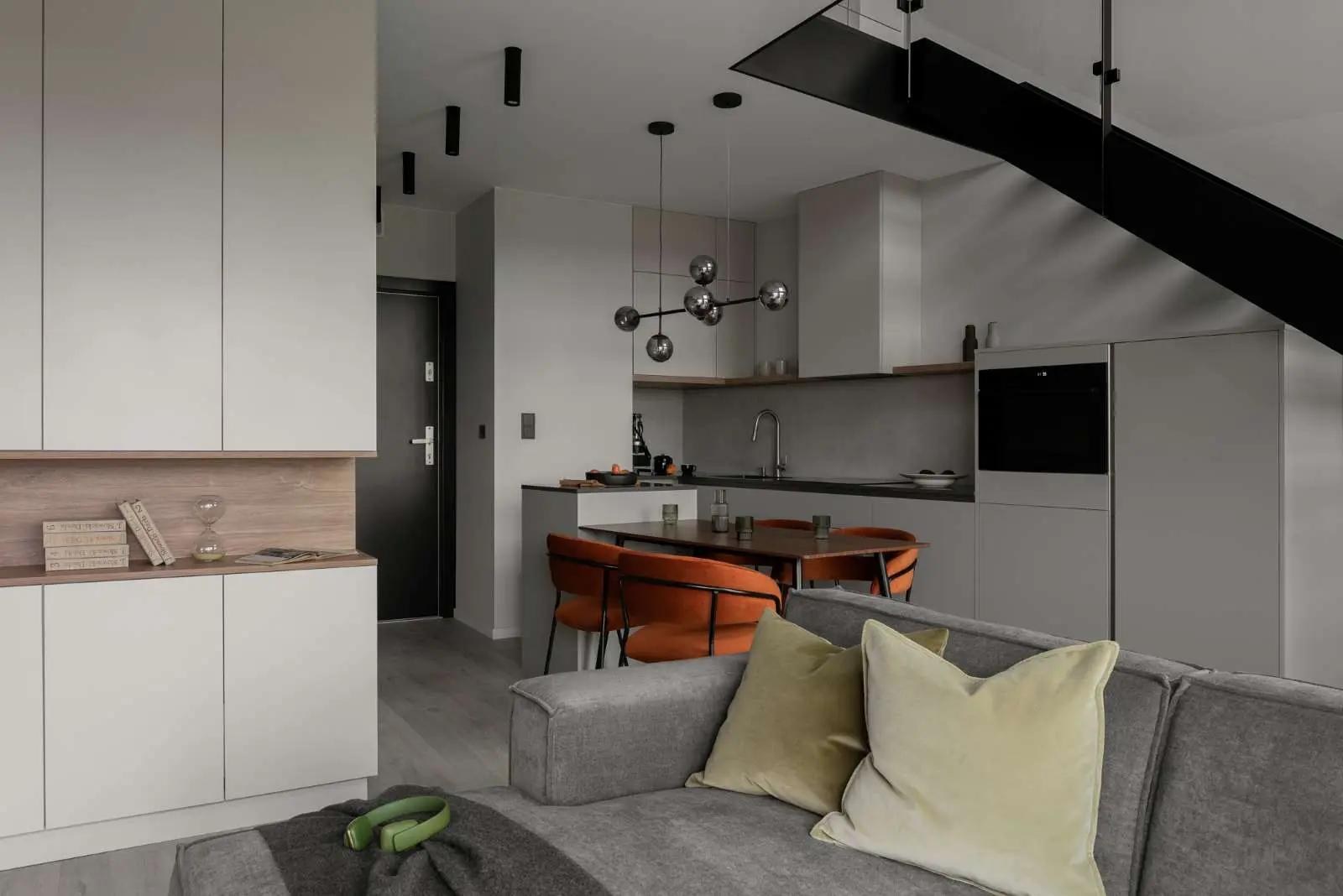 W apartamencie nie brakuje czerni i antracytów, ale to głównie w postaci metalowej konstrukcji schodów, elementów oświetlenia, kamiennych blatów czy dekoracji okiennych. Stylizując przestrzeń projektantka dodała oliwkowe detale, które podbiły zielony pigment w zastosowanych we wnętrzu szarościach. Dlaczego takie kolory? Szarości o zielonym zabarwieniu nie są tak oczywiste i chłodne jak tradycyjne typu NCS S 2000N. Dodatkowo świetnie korespondują z rdzawymi i oliwkowymi detalami. Mimo że wnętrze jest wyraźnie męskie i lekko industrialne zależało na odbiorze całości jako przytulnej i klimatycznej przestrzeni.