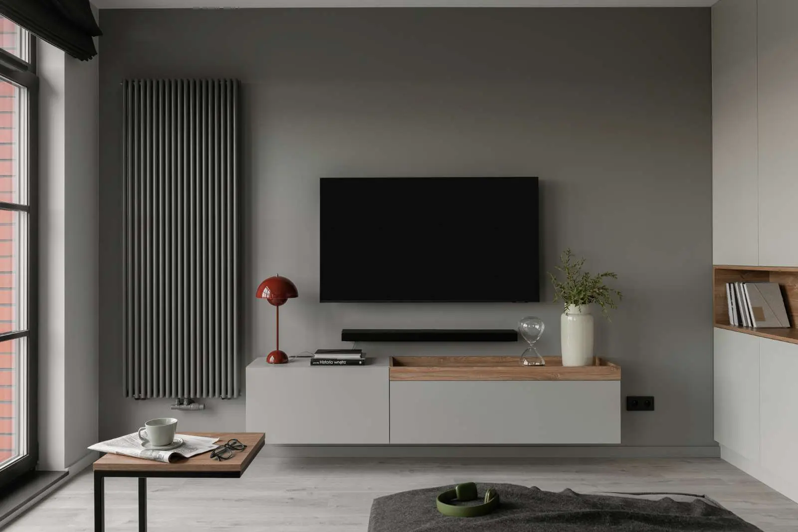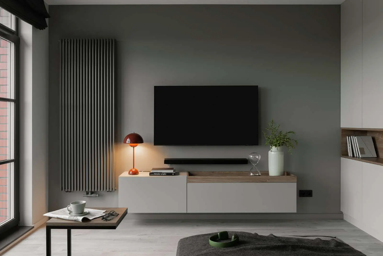 W projekcie architekt zastosowała paletę ciepłych szarości z zielonym pigmentem, która została urozmaicona rdzawymi detalami w postaci łóżka i krzeseł. Podłoga miała tworzyć dla wnętrza jednolitą bazę w tonacji jaśniejszych ścian. Wyraźnie akcenty to drewniane detale dąb zabarwionym na orzech.