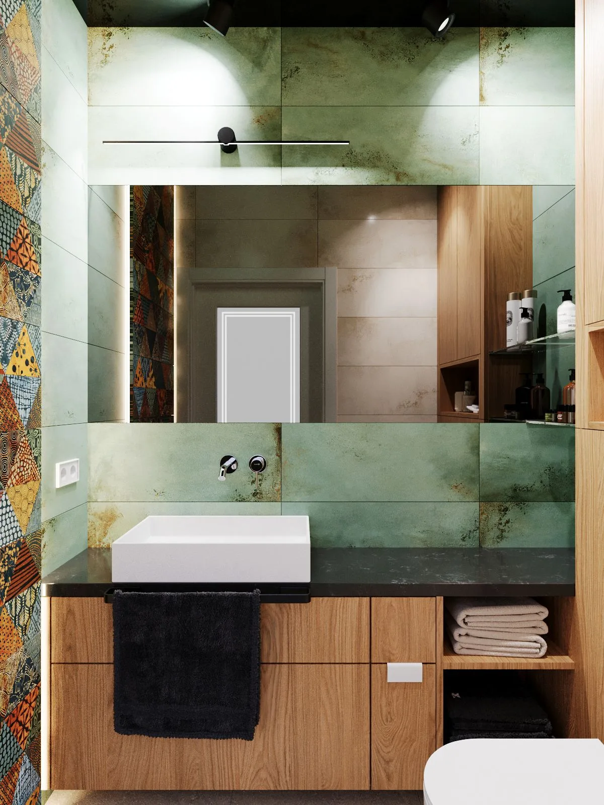 Równie konsekwentnie podjęto decyzje materiałowe. Inwestorom zależało na prostocie i praktyczności, ale rozumianej w szlachetny sposób — bez przypadkowości, bez sezonowych zachwytów. Pojawia się więc drewno i ceramiczna mozaika na podłodze, barwione tynki, kamień na blatach i ścianach w toalecie oraz łazience. Meble mają fornirowane fronty, a metalowe ramy porządkują bryłę i podkreślają konstrukcję półek czy wybranych korpusów. To zestaw, który pięknie się starzeje: odporny na codzienność, a jednocześnie wyrazisty i elegancki.