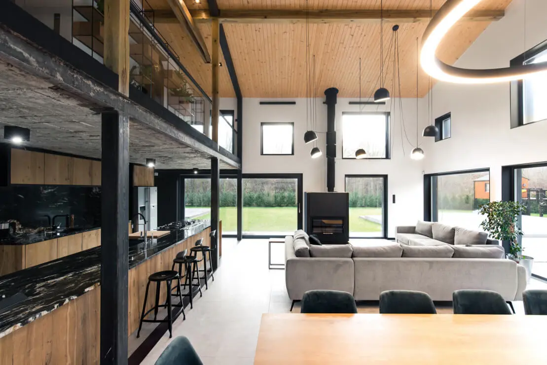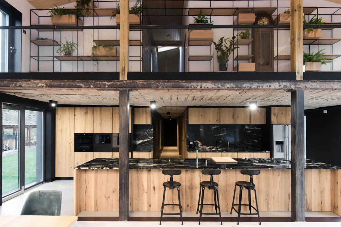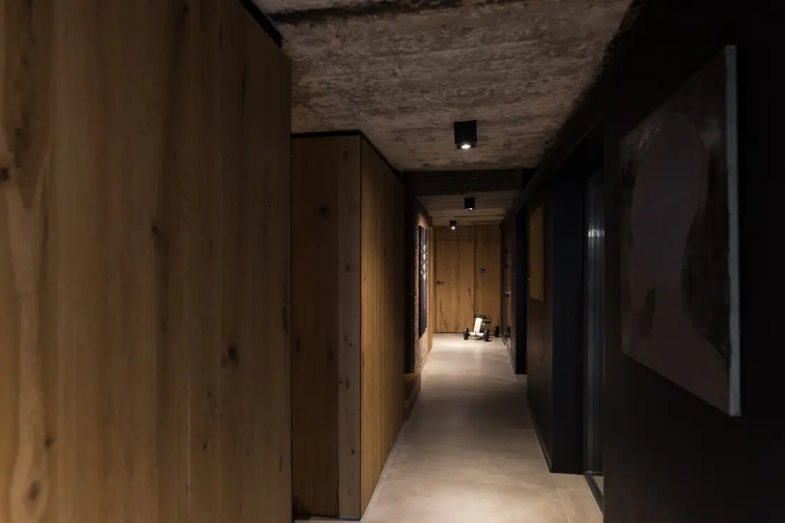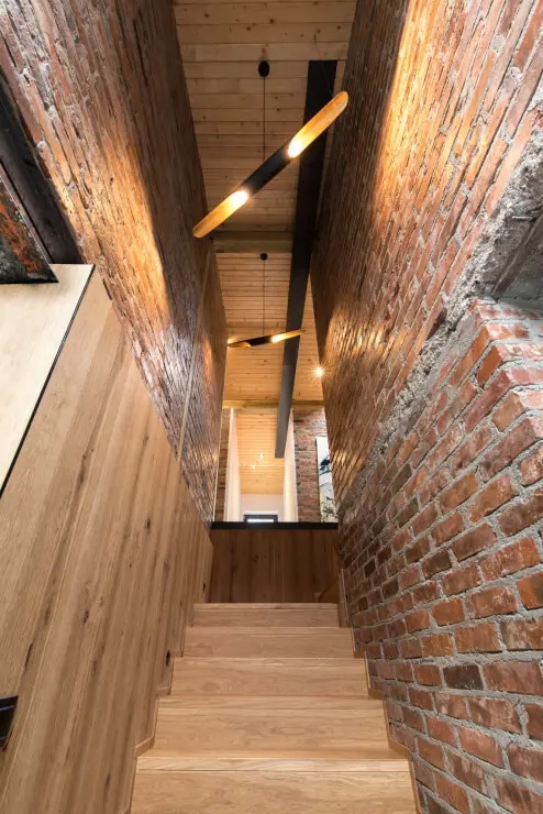 Z budynków gospodarskich udało się zachować betonową konstrukcję budynku wraz z częścią cegieł i elementów stalowych. Użyte we wnętrzu minimalistyczne materiały takie jak gładkie, piękne naturalne drewno i ciemny polerowany granit świetnie kontrastują.