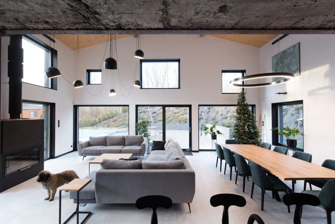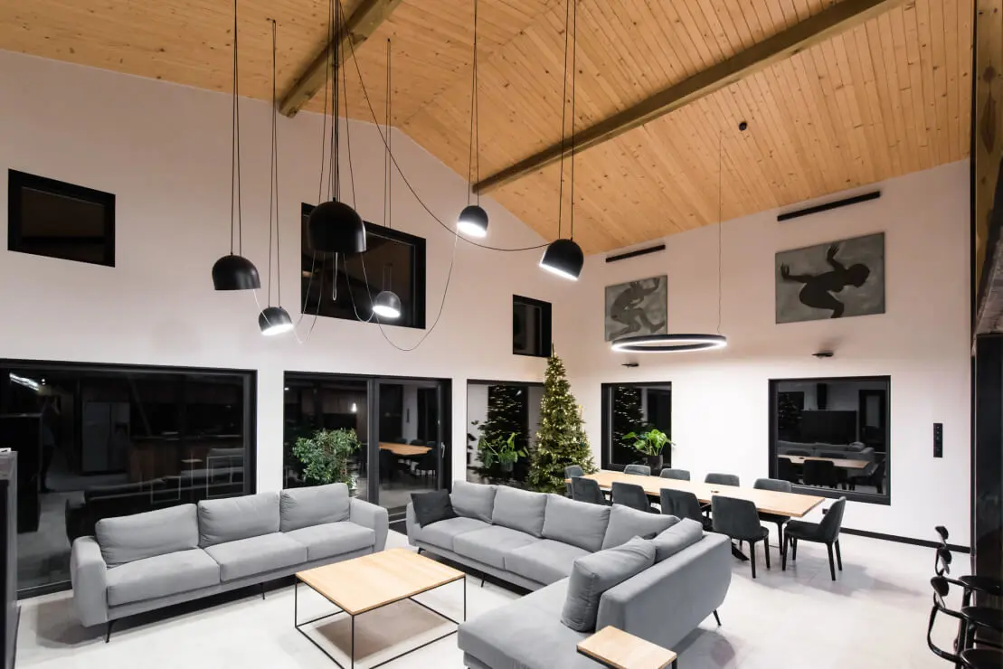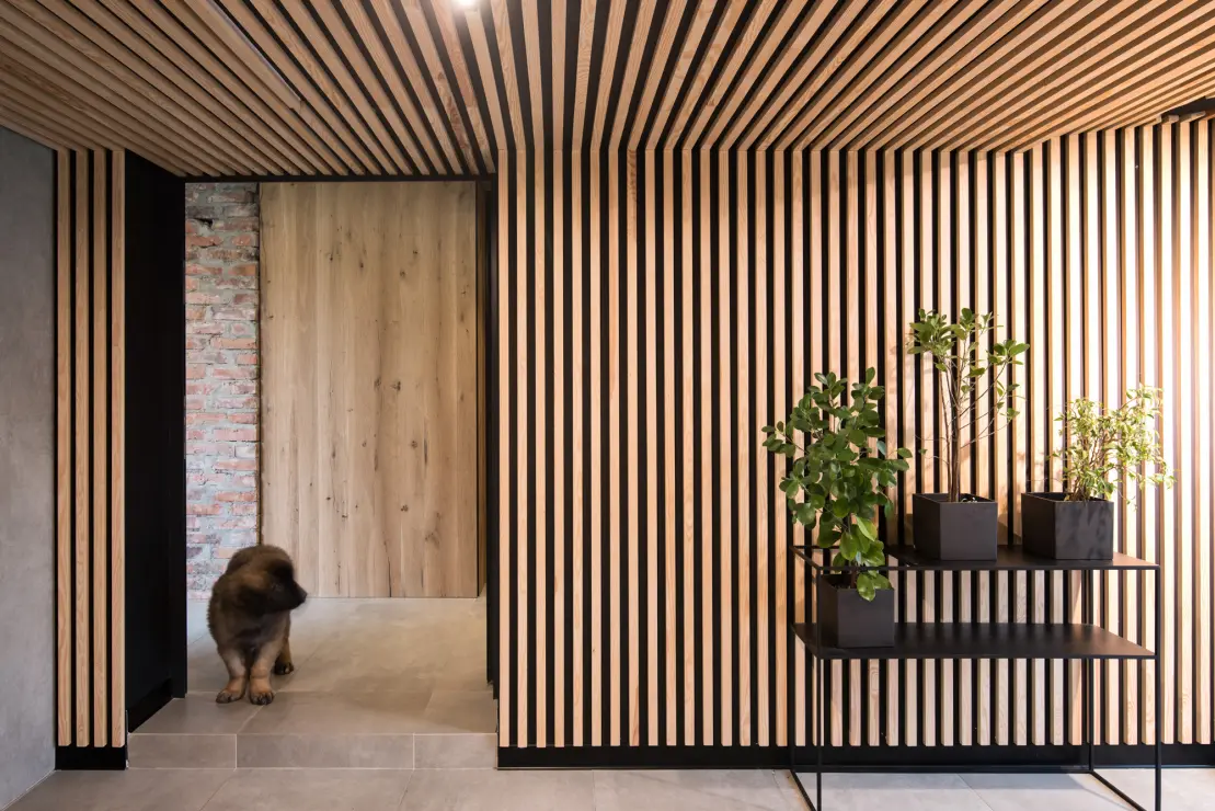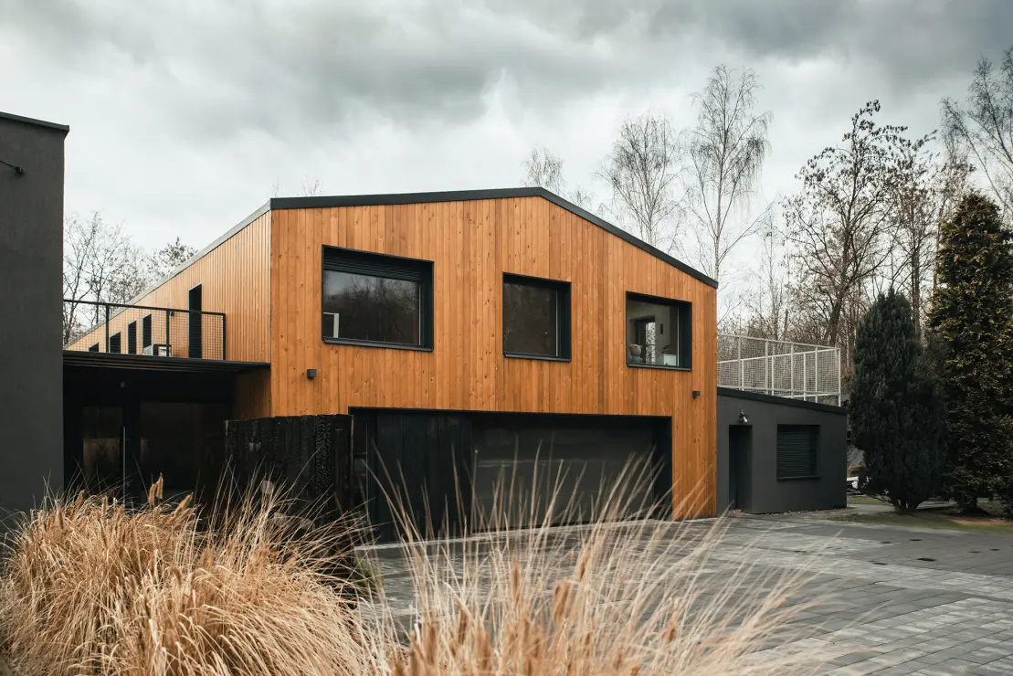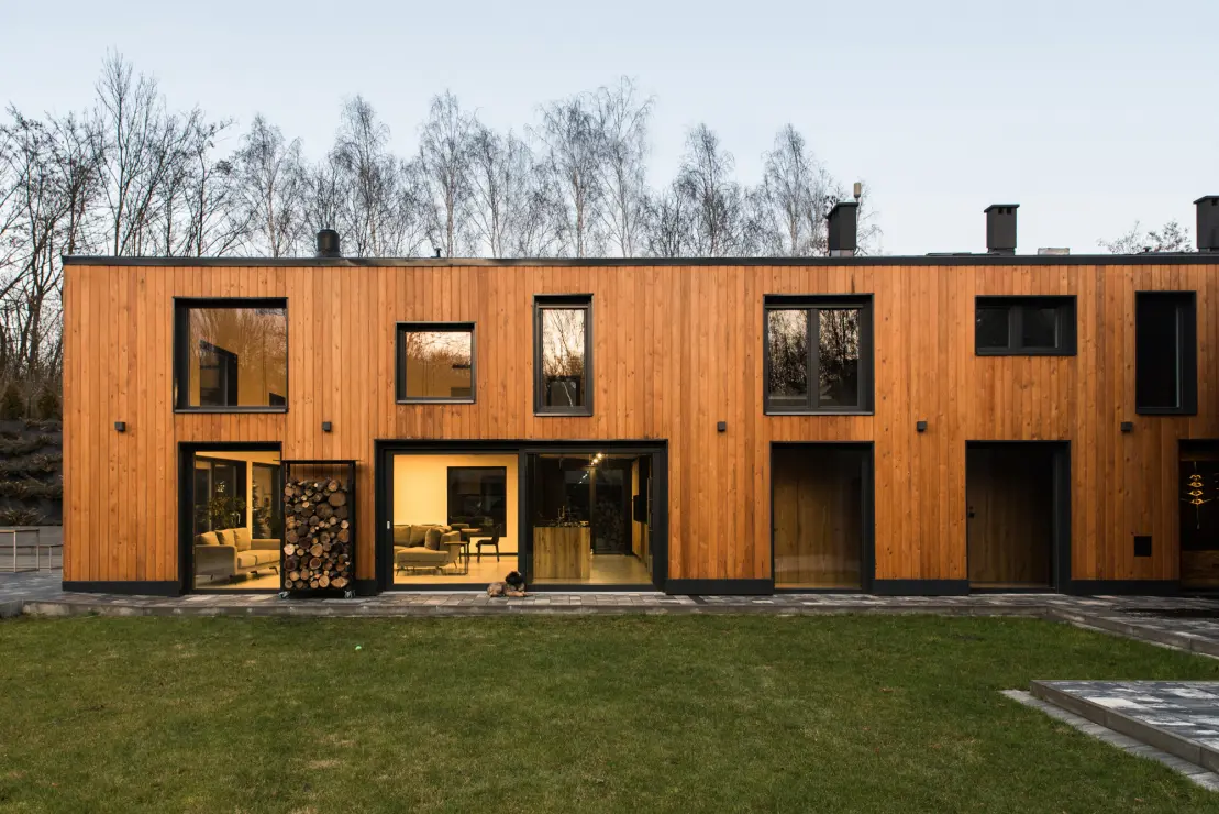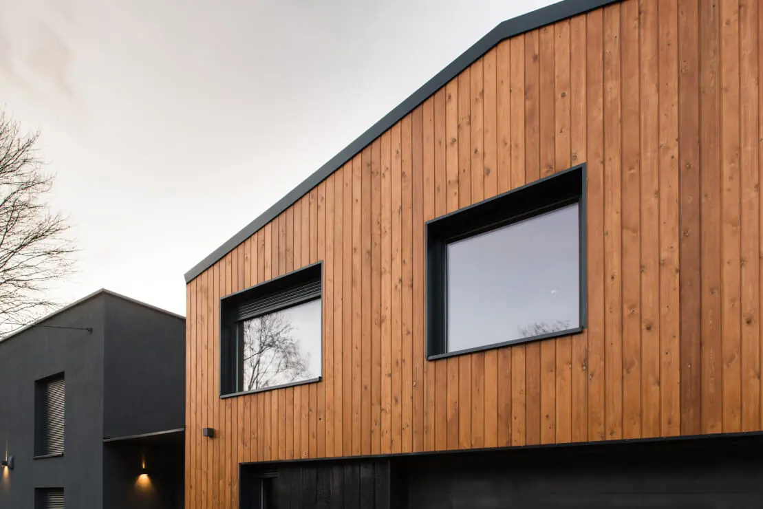Elewacja została wykonana z drewna z nieregularnymi otwarciami, aby maksymalnie doświetlić wnętrze. Sąsiadujący ze stodołą dom typu kostka, został zaaranżowany na dom gościnny, a elewację pomalowano na szary kolor.