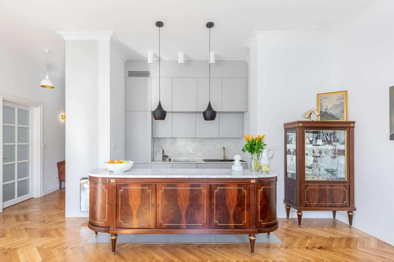 We wnęce, w której dawniej mieściła się łazienka, wkomponowana została cała kuchenna zabudowa z szarymi, pozbawionymi uchwytów szafkami. Piękna stylowa wyspa z kamiennym blatem znakomicie prezentuje się na ich tle. W kącie stanęła stylowa witryna prezentująca kolorowe szkło.