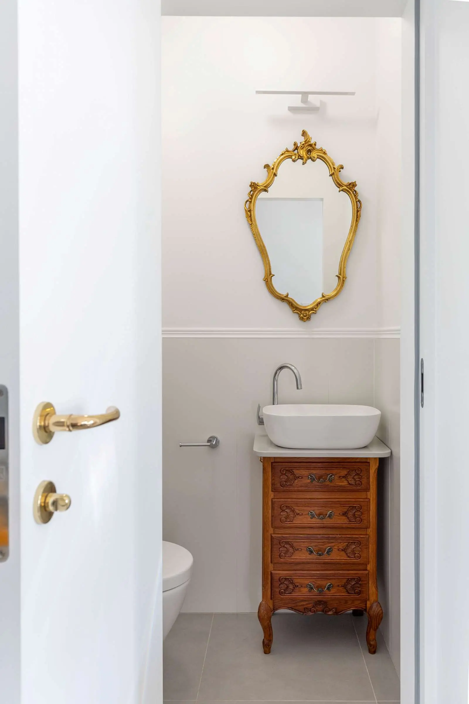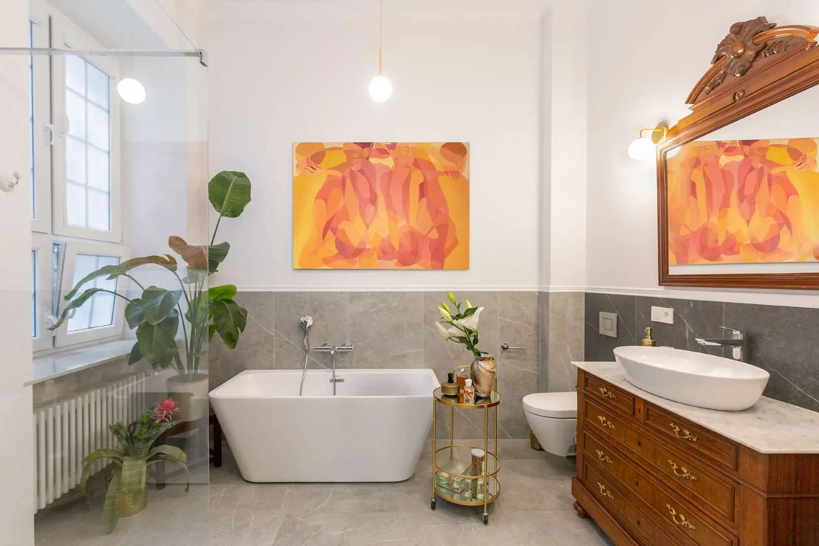 W starym mieszkaniu brakowało łazienki z prawdziwego zdarzenia. Na szczęście metraż pozwalał na wygospodarowanie nowej pięknej przestrzeni, która zamieniła się w prawdziwy salon kąpielowy. Wanna wolnostojąca przyścienna wspaniale komponuje się ze stylowymi meblami oraz dużym lustrem w drewnianej rzeźbionej ramie. Szare płytki z delikatnym żyłkowaniem stanowią ciekawe harmonijne tło dla całej kompozycji.