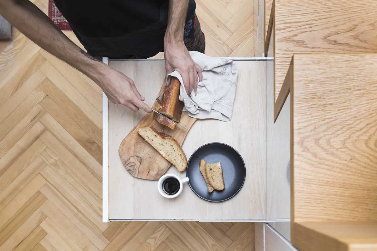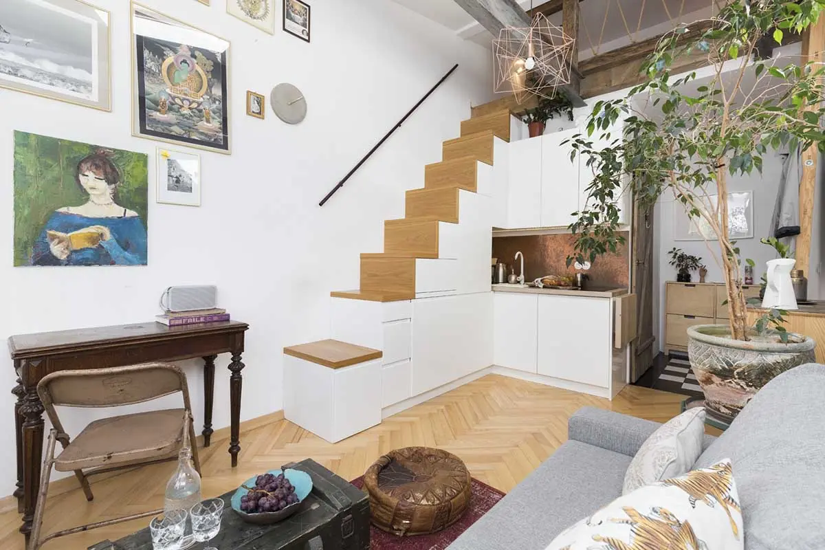 Już na wstępie architekt Małgosia Bielecka, utrzymywała że nad łazienką i holem powstanie antresola z sypialnią. Dzięki temu powstała dodatkowa przestrzeń, ale też ciekawy punkt widokowy na mieszkanie. Pojawiło się jednak pytanie o sposób wchodzenia na antresolę. Schody zabrałyby zbyt dużo miejsca, a drabina nie jest rozwiązaniem wygodnym. Ostatecznie powstał projekt mebla, który łączy w sobie funkcję schodów z zabudową kuchenno-gospodarczą. W szafkach ukryta została pralka, mikrofala, lodówka, szafa oraz schowki na naczynia i środki czystości. Pierwszy schodek jest niezależny i może być używany jako dodatkowe siedzisko.