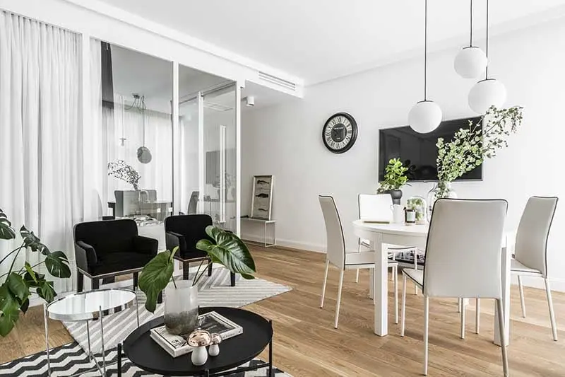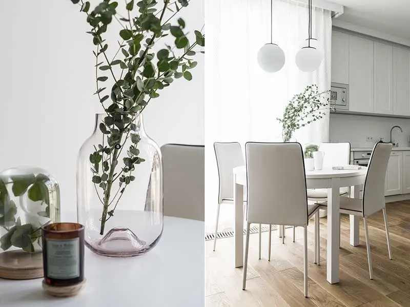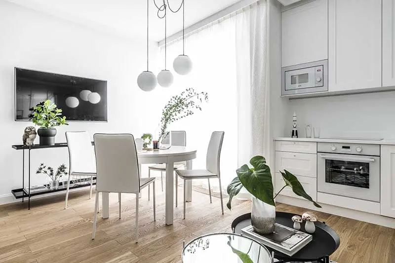Doskonałe tło dla jadalni i salonu stanowi stonowana, minimalistyczna kuchnia skąpana w skandynawskiej bieli. Jej powściągliwość wyrażona zastosowaniem neutralnej kolorystyki i prostych form pozbawionych zdobień, sprawia że znakomicie komponuje się z reprezentatywną częścią mieszkania i jednocześnie nie zakłóca aranżacji.