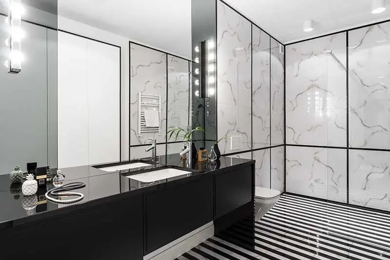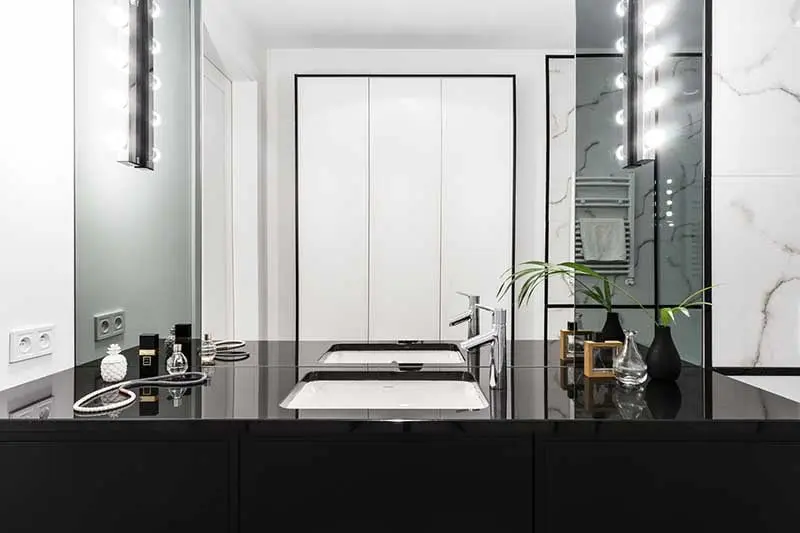 Dobrze temu wnętrzu robi również duże lustro podświetlone z obu stron specjalnymi lampami, a także wysoko – połyskowy blat. Wszystko to wpływa na optyczne powiększenie pomieszczenia. Zastosowany odpływ liniowy również oszczędza miejsce i sprawia, że i tak charakterna łazienka staje się nieprzesadzona i w dobrym tonie.