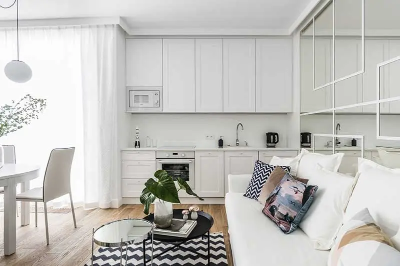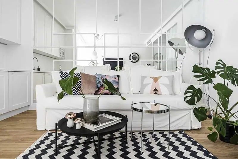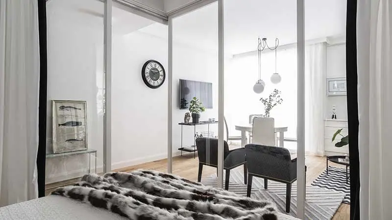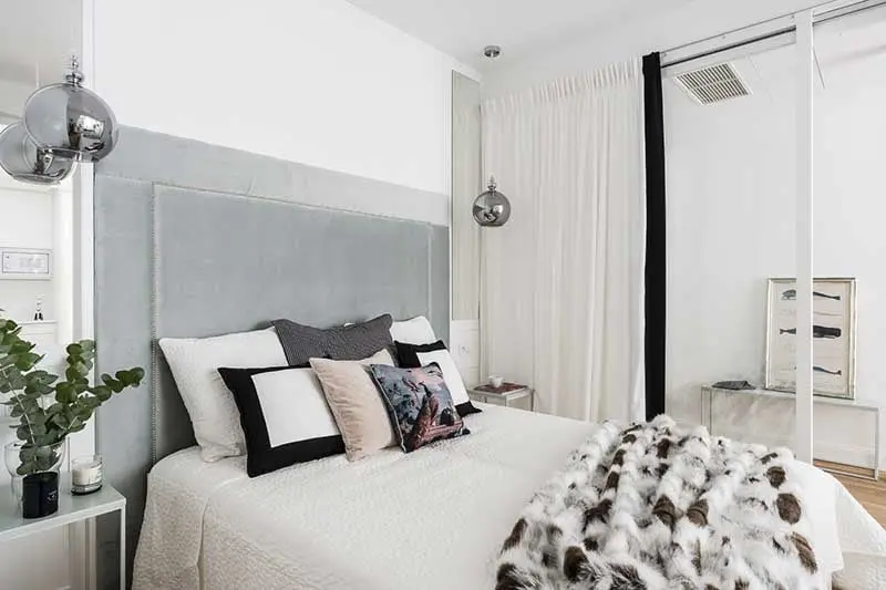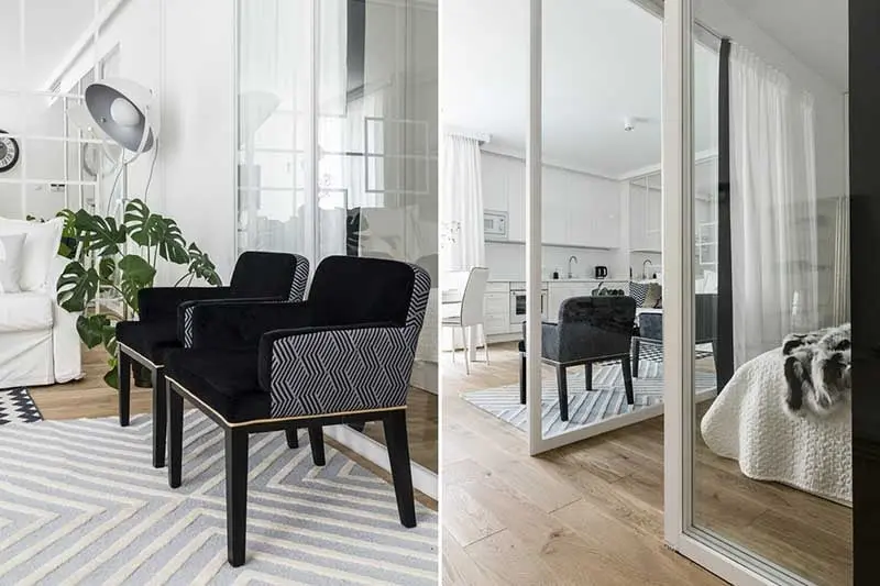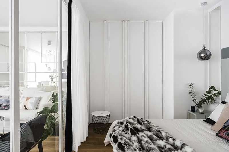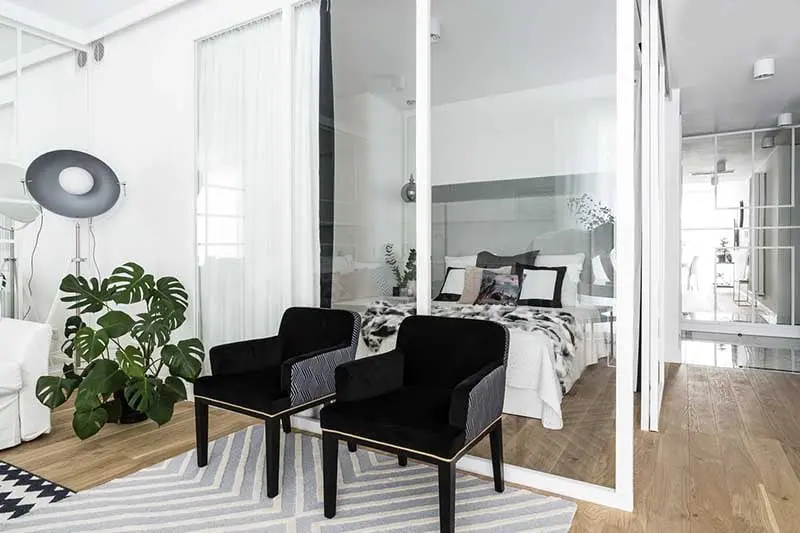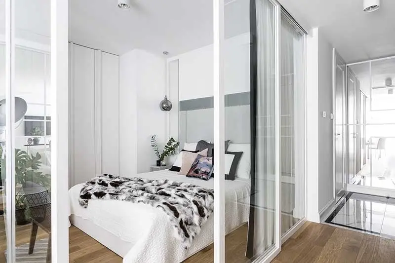 Wartym podpatrzenia trikiem, szczególnie przy mniejszym metrażu, jest oddzielnie sypialni od reszty mieszkania przeszkleniem. Taki zabieg symbolicznie rozgranicza prywatną przestrzeń i przy okazji nie zmniejsza optycznie wnętrza, a przezroczysta ,,ściana” zapewnia dobre naświetlenie sypialni.