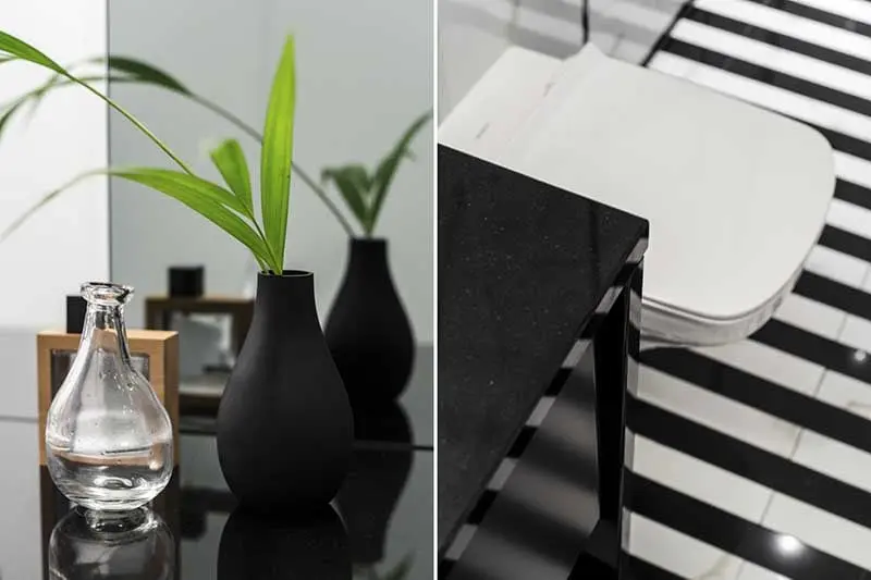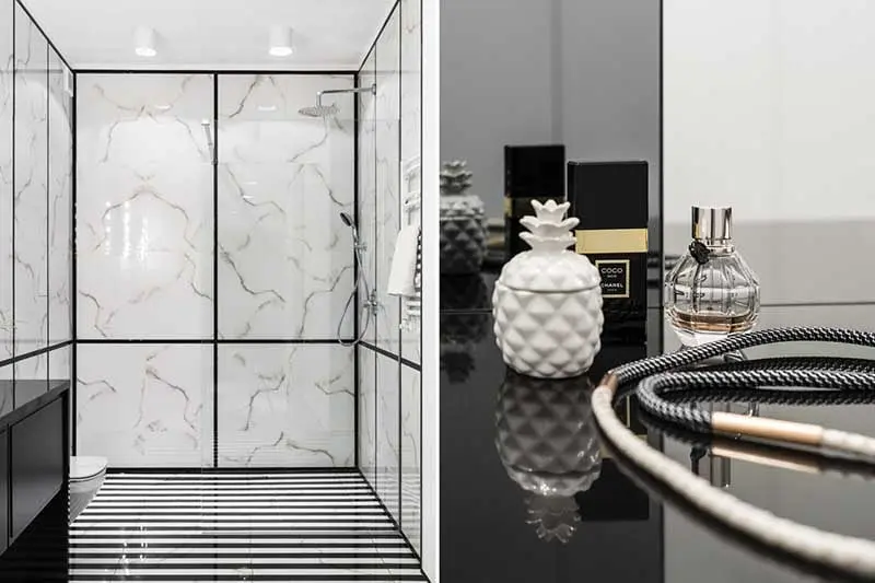 Moim ulubionym pomieszczeniem w tym domu, jest łazienka. Mój zachwyt wynika przede wszystkim z nieoczywistego połączenia luksusowej marmurowej faktury na ścianie z czarno – białą podłogą. Jest to dosyć niespotykane zestawienie, ale musicie przyznać, że wygląda to niezwykle dobrze?