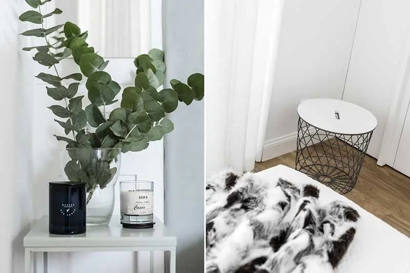 Wnętrze, pomimo niewielkich gabarytów, jest niezwykle funkcjonalne i stylowe. Znalazło się tutaj pokaźne łóżko doprawione charakternymi tekstyliami i tapicerowaną ścianą, szafa wnękowa, która dzięki swojej minimalistycznej formie wygląda tak jakby była częścią ściany, a także stolik nocny, na którym oczywiście swoje miejsce znalazły kwiaty. Wiecie, że niektóre gatunki są szczególnie polecane do sypialni?