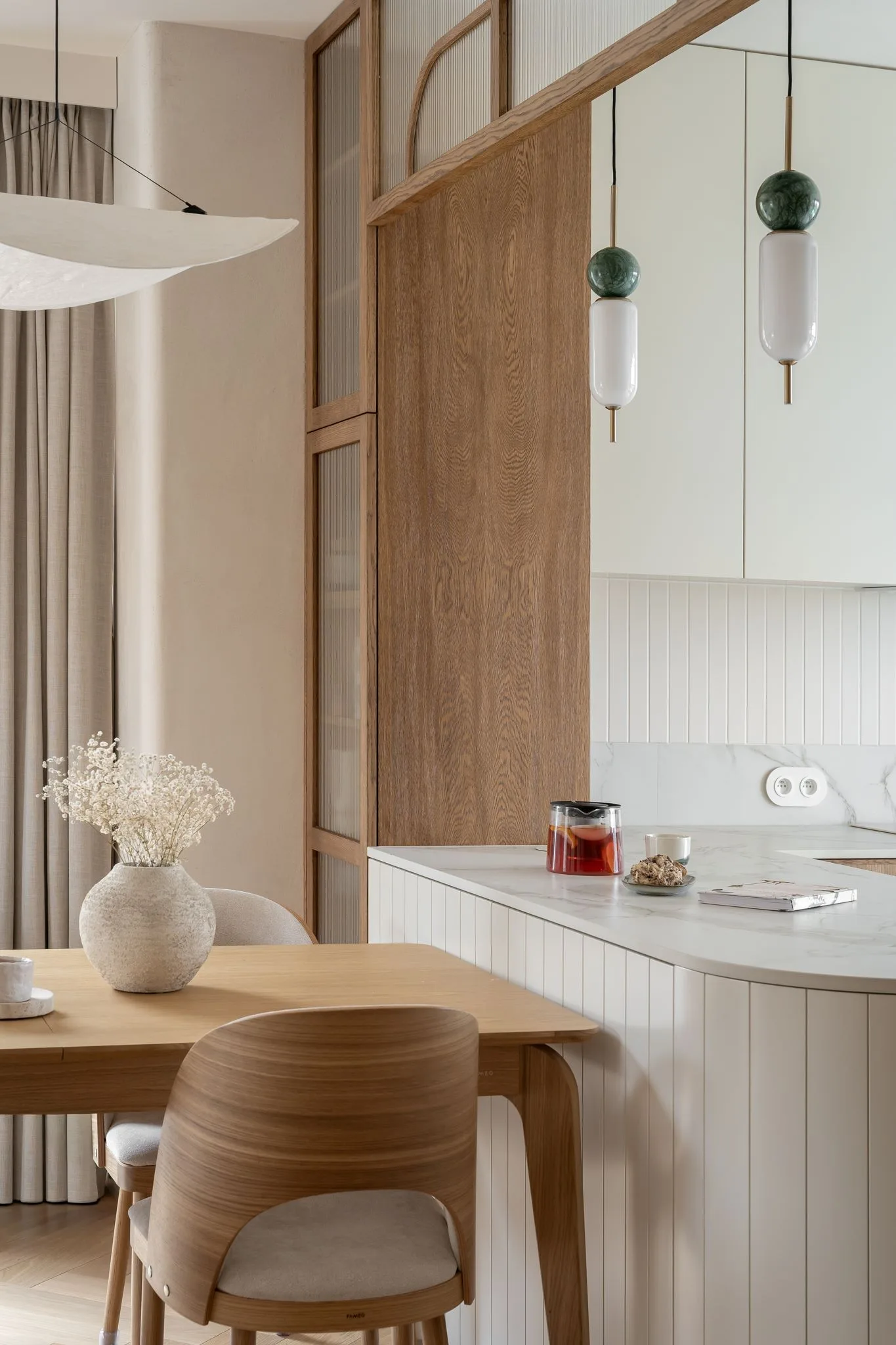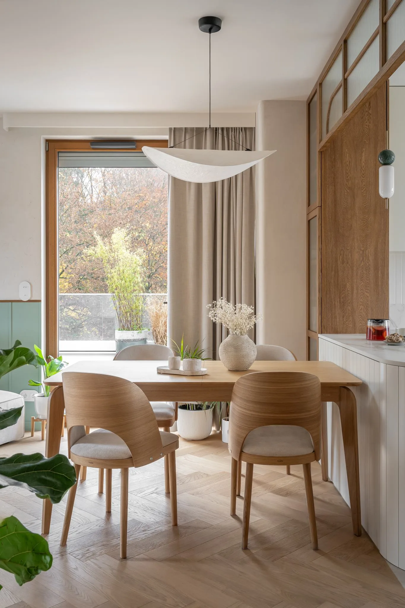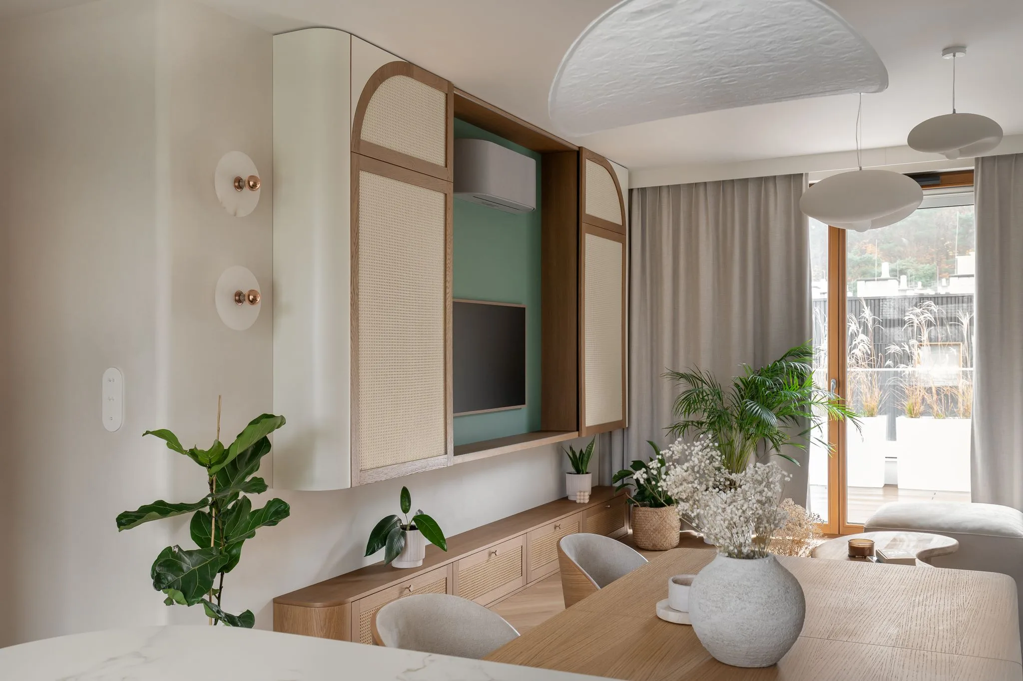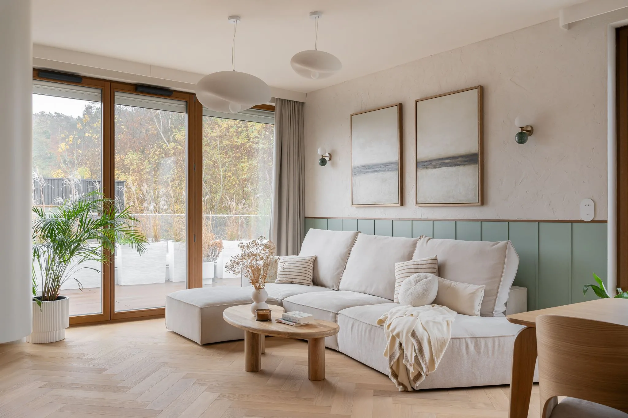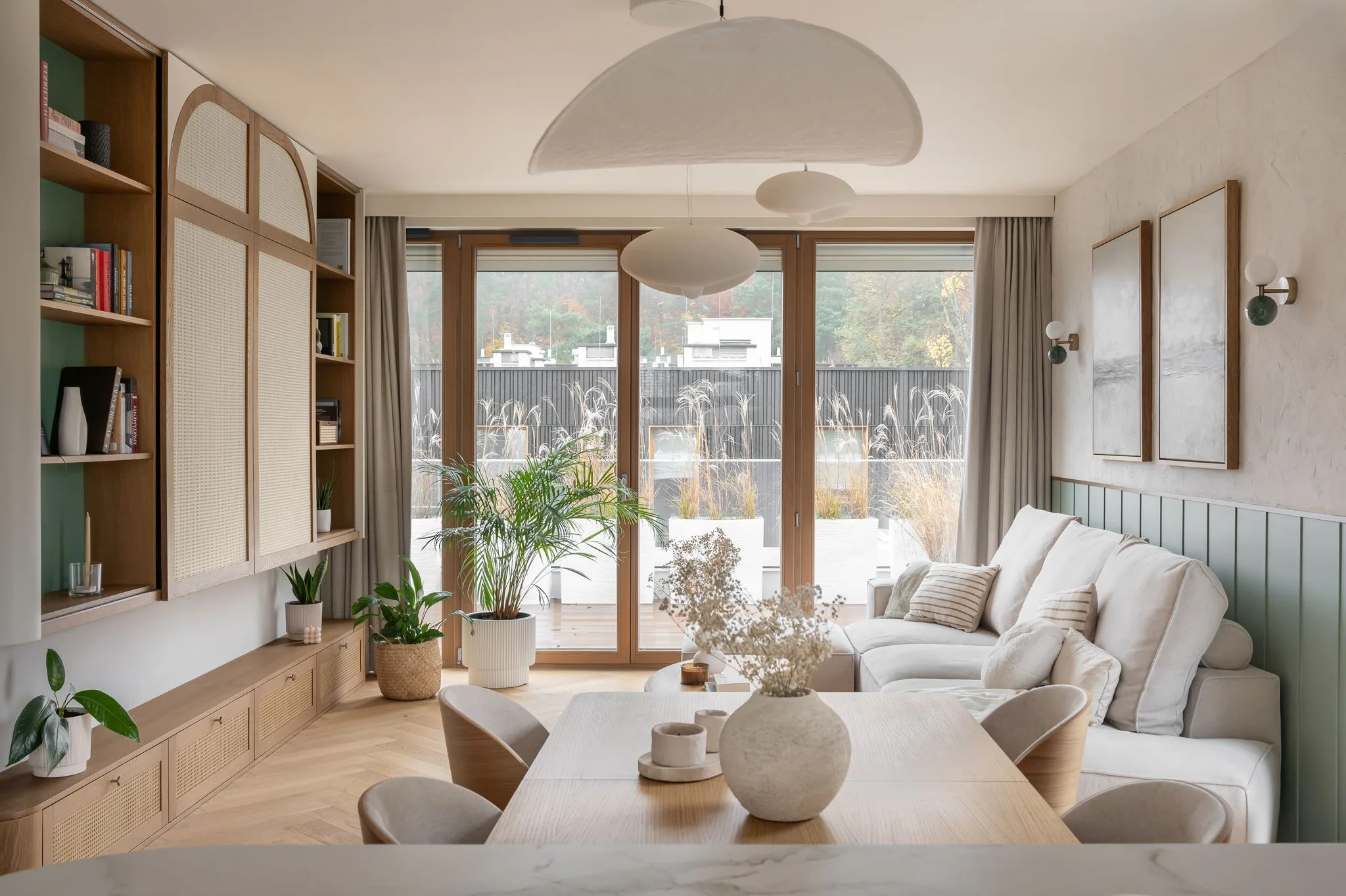 Wnętrze zachwyca subtelną paletą barw – dominują odcienie beżu, taupe oraz naturalne drewno, uzupełnione o delikatne akcenty kolorystyczne. Starannie dobrane materiały, takie jak drewno, spieki, naturalne tynki i tkaniny, nadają przestrzeni przytulności i elegancji. Detale, takie jak ceramiczne dodatki czy zielone rośliny, wprowadzają harmonię i podkreślają bliskość natury.
