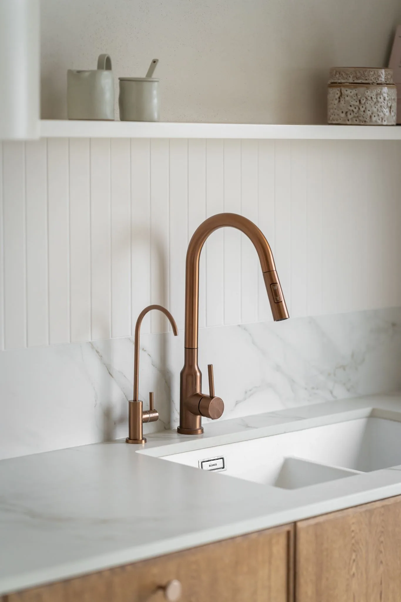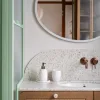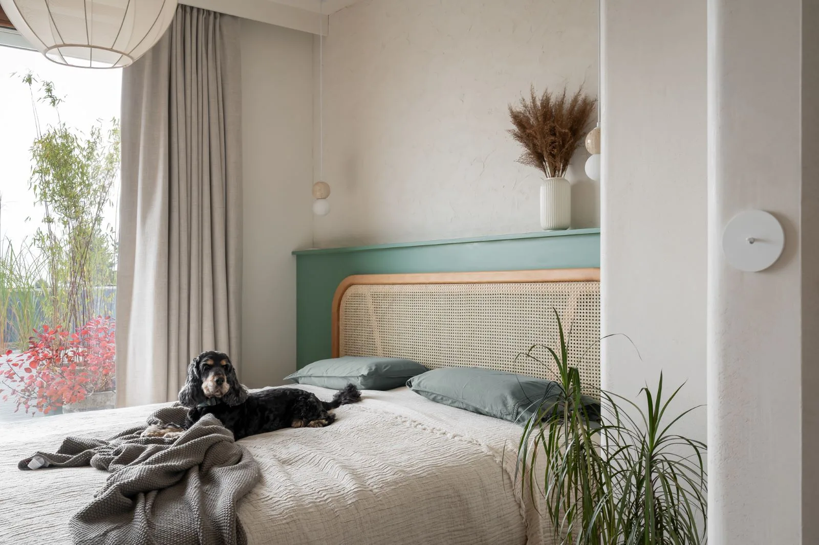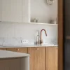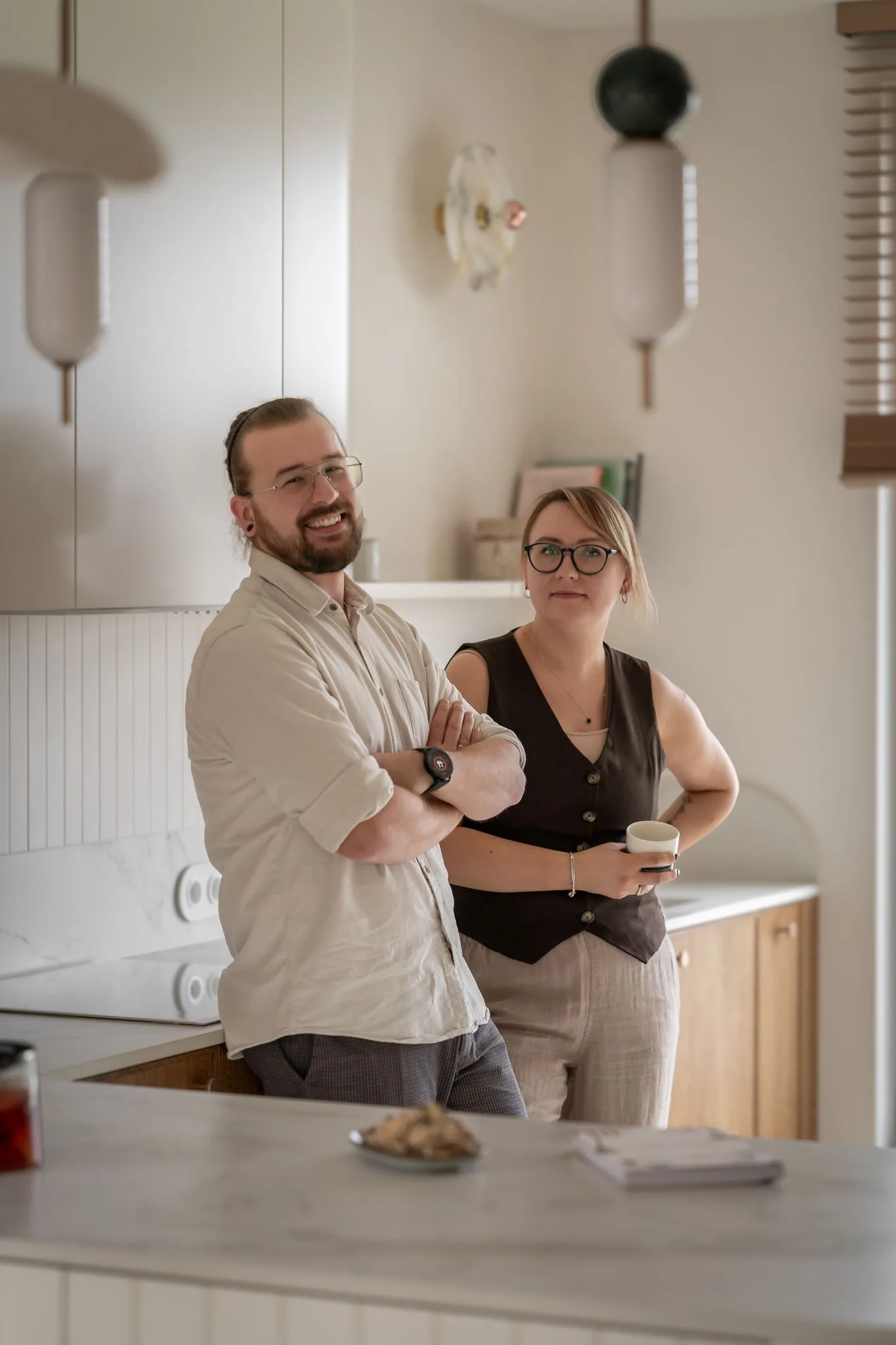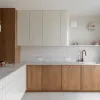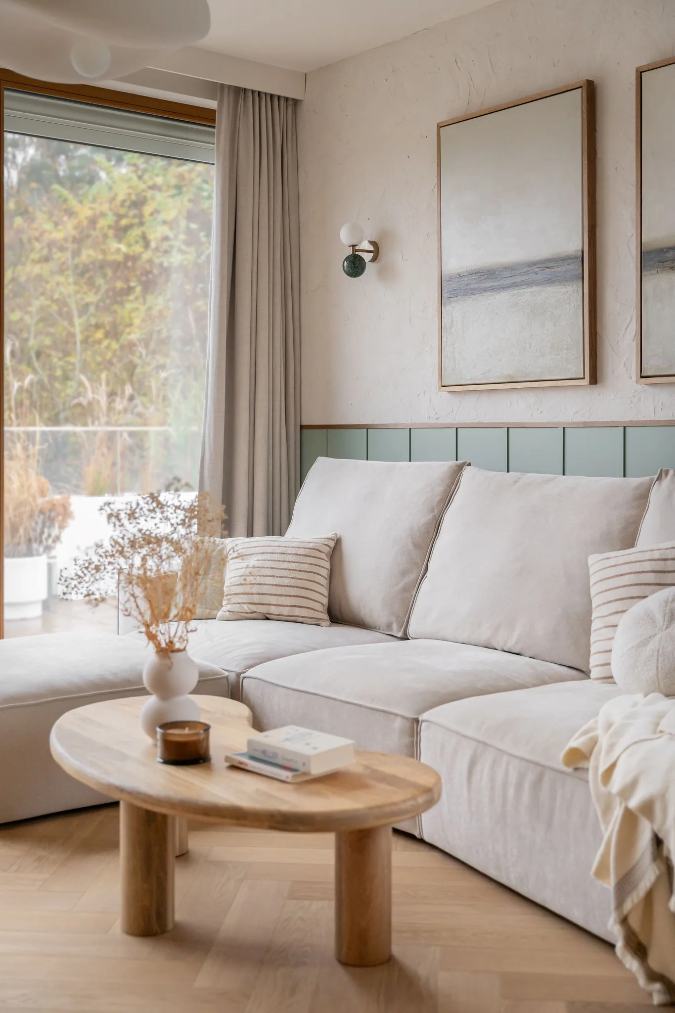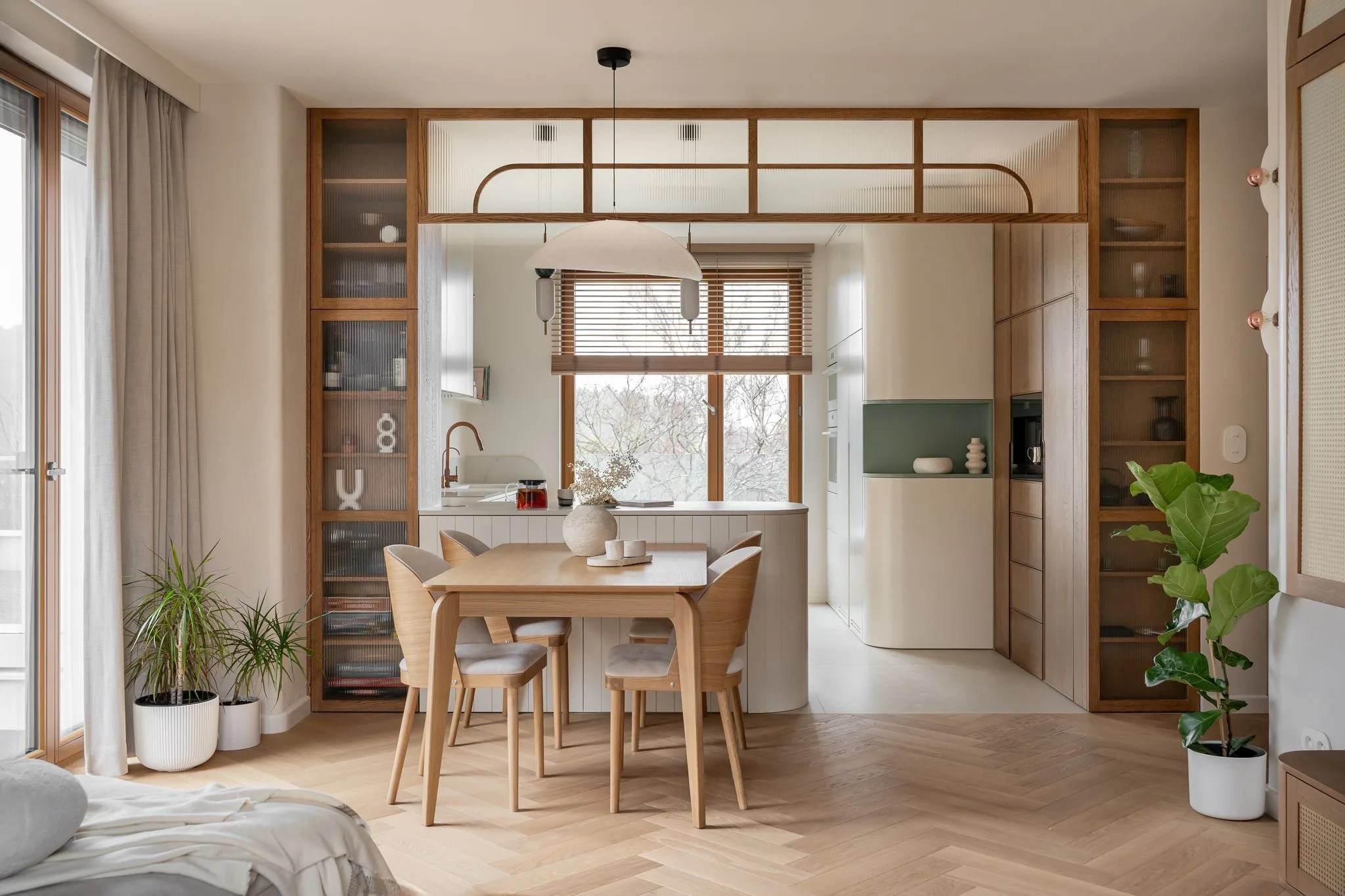 Wnętrze zachwyca subtelną paletą barw – dominują odcienie beżu, taupe oraz naturalne drewno, uzupełnione o delikatne akcenty kolorystyczne. Starannie dobrane materiały, takie jak drewno, spieki, naturalne tynki i tkaniny, nadają przestrzeni przytulności i elegancji. Detale, takie jak ceramiczne dodatki czy zielone rośliny, wprowadzają harmonię i podkreślają bliskość natury.