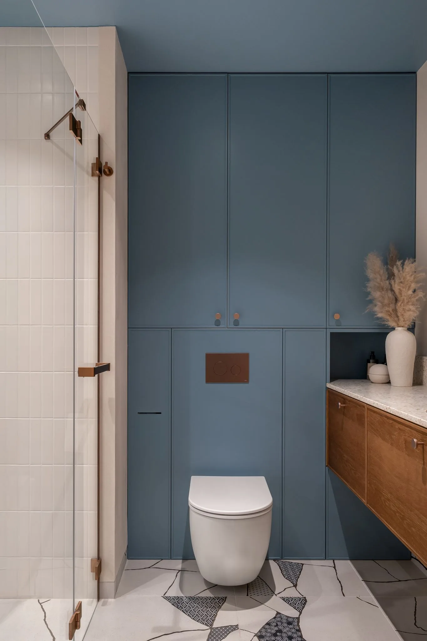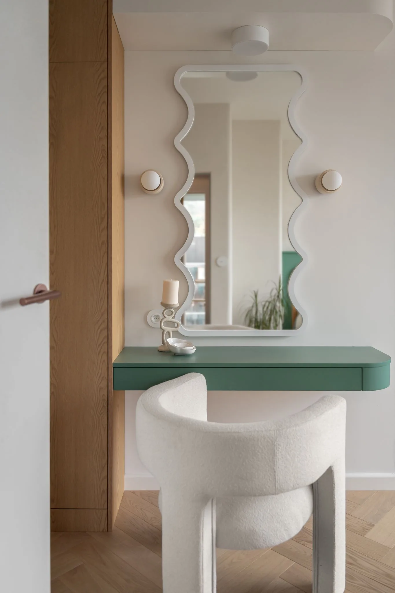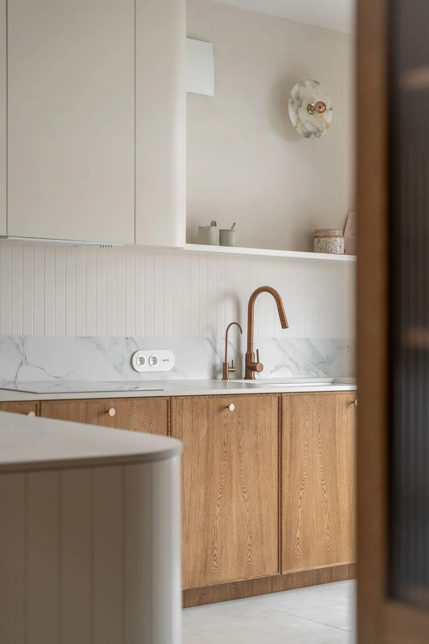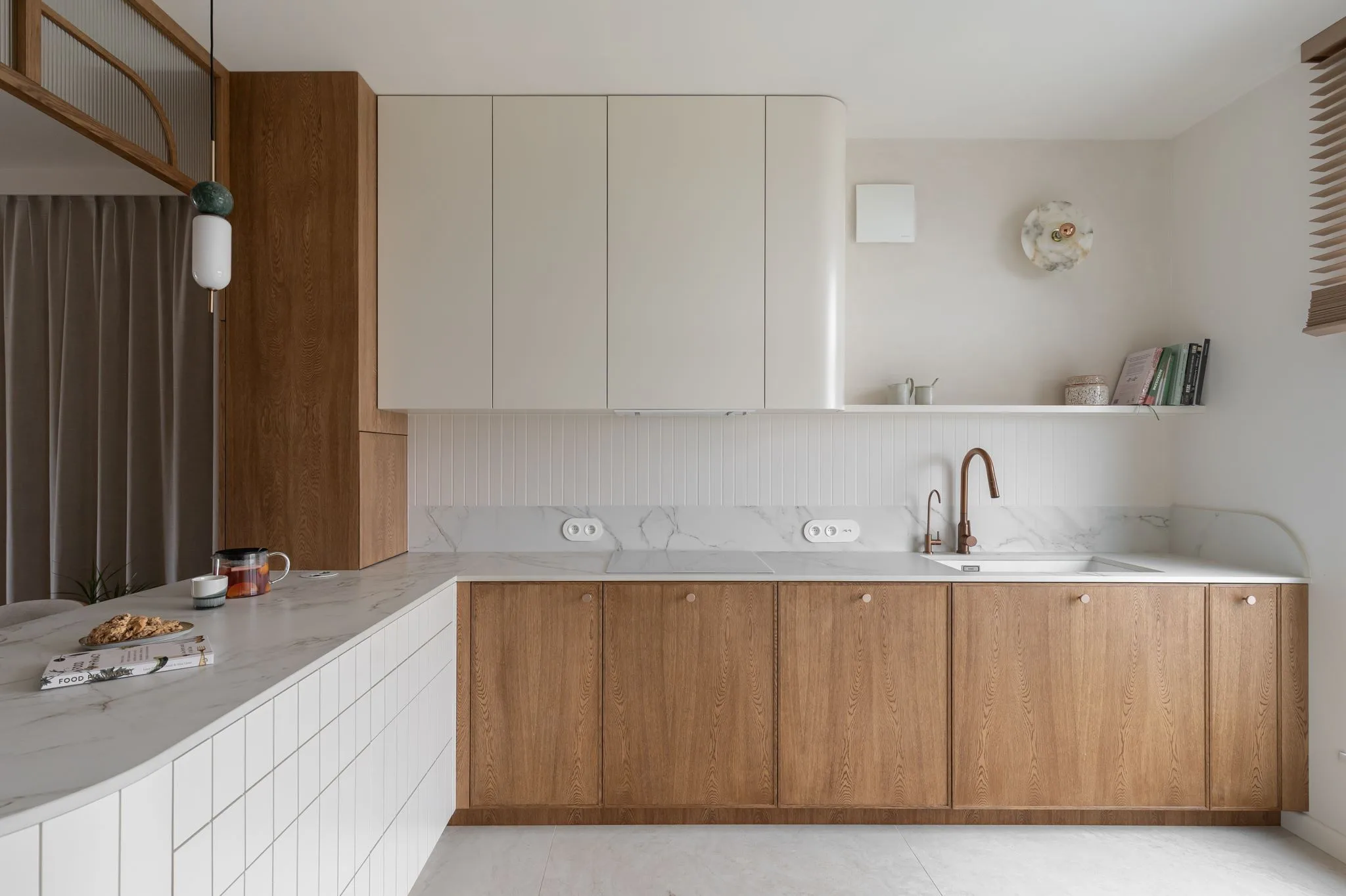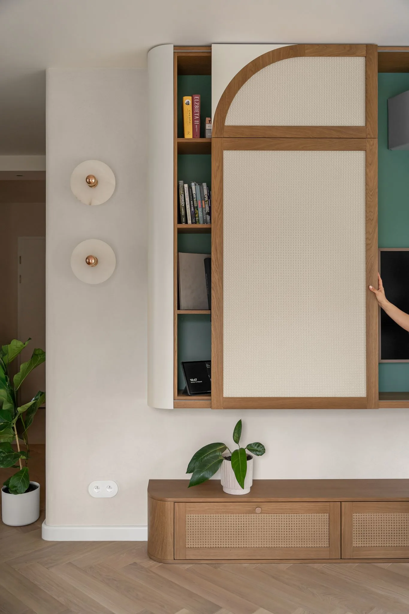 Ciekawostką są funkcjonalne zabudowy, takie jak ukryty thermomix na wysuwanej tacy, szafki typu cargo czy przesuwny system, który pozwala zasłonić telewizor. W całym mieszkaniu powtarzają się zaoblenia, widoczne m.in. w uchwytach kuchennych, wyspie z ryflowanym frontem czy zaokrąglonych narożnikach ścian, wykończonych tynkami marmurowymi.