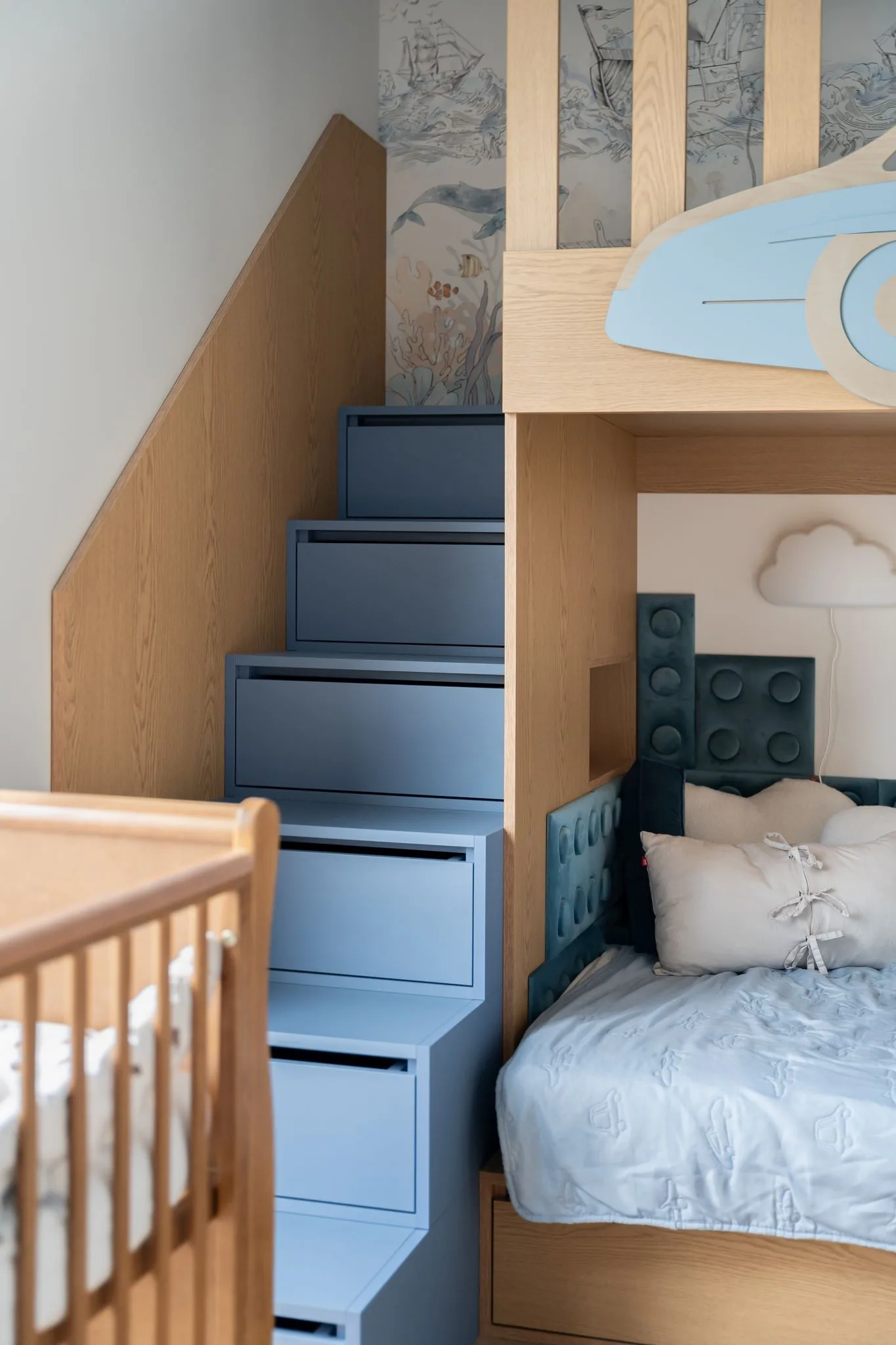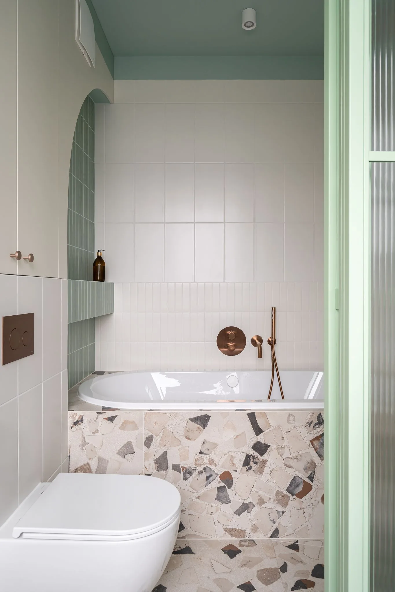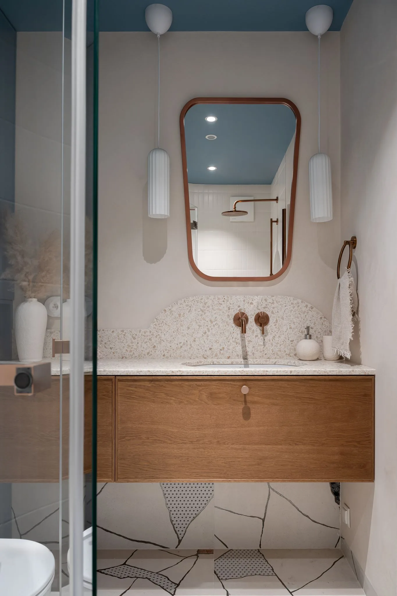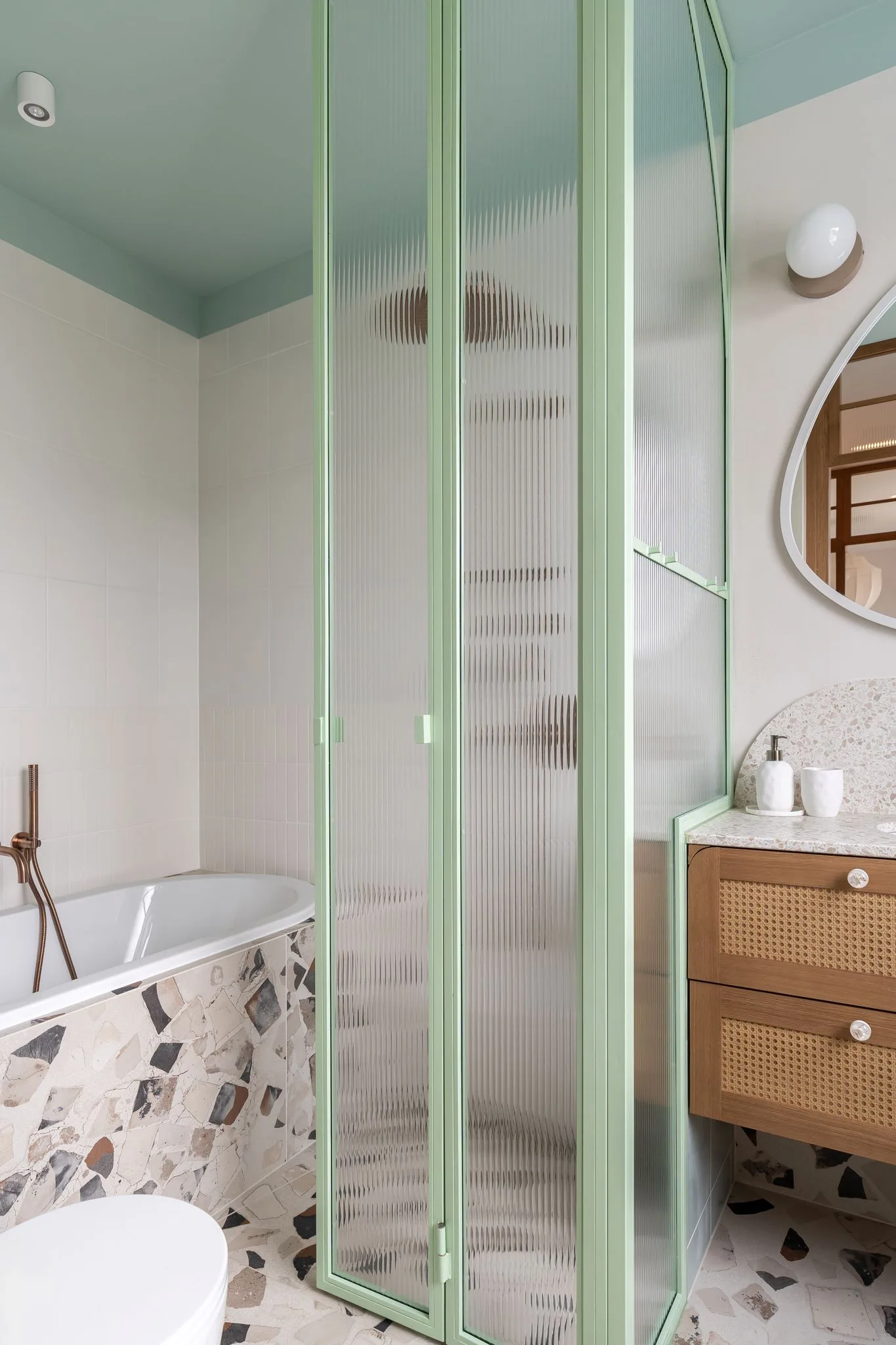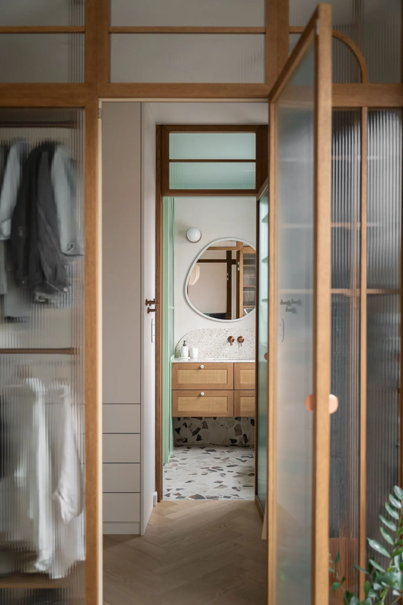 Apartament, zaprojektowany z myślą o młodym małżeństwie z dwójką dzieci, zajmuje najwyższe piętro budynku. Jego układ został przemyślany od podstaw. Pierwotnie zamknięta kuchnia została otwarta na salon i wizualnie oddzielona drewnianą zabudową z dekoracyjnymi witrynami, wypełnionymi szkłem typu flutes. Podobne elementy zdobią inne przestrzenie mieszkania, m.in. jako ścianki działowe.
