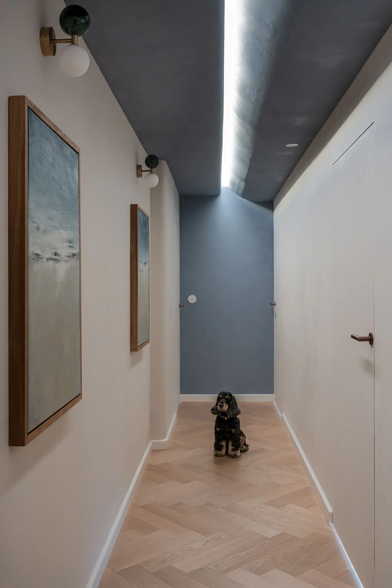 Apartament został wyposażony w zaawansowane rozwiązania technologiczne. Po przearanżowaniu ścian działowych wprowadzono ogrzewanie podłogowe, a system inteligentnego domu Loxone umożliwia mieszkańcom zdalne zarządzanie oświetleniem, klimatyzacją, audio, alarmem czy roletami zewnętrznymi. Sufity podwieszane skrywają rozbudowaną instalację, a w przedpokoju zyskały estetyczną formę granatowego świetlika z gradientowo malowanymi obrazami, które nawiązują do nadmorskiego charakteru mieszkania.