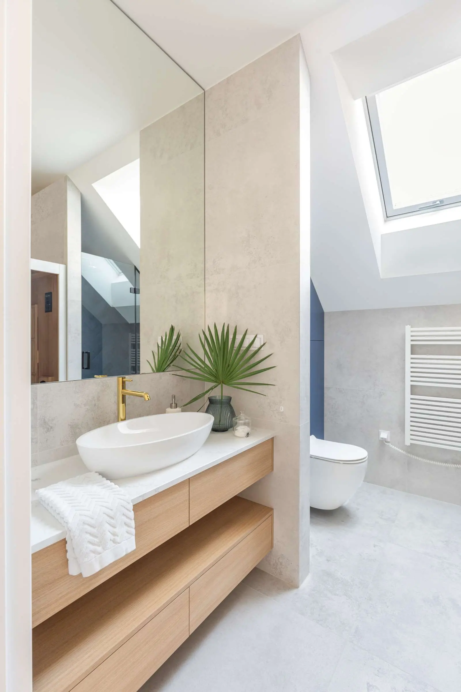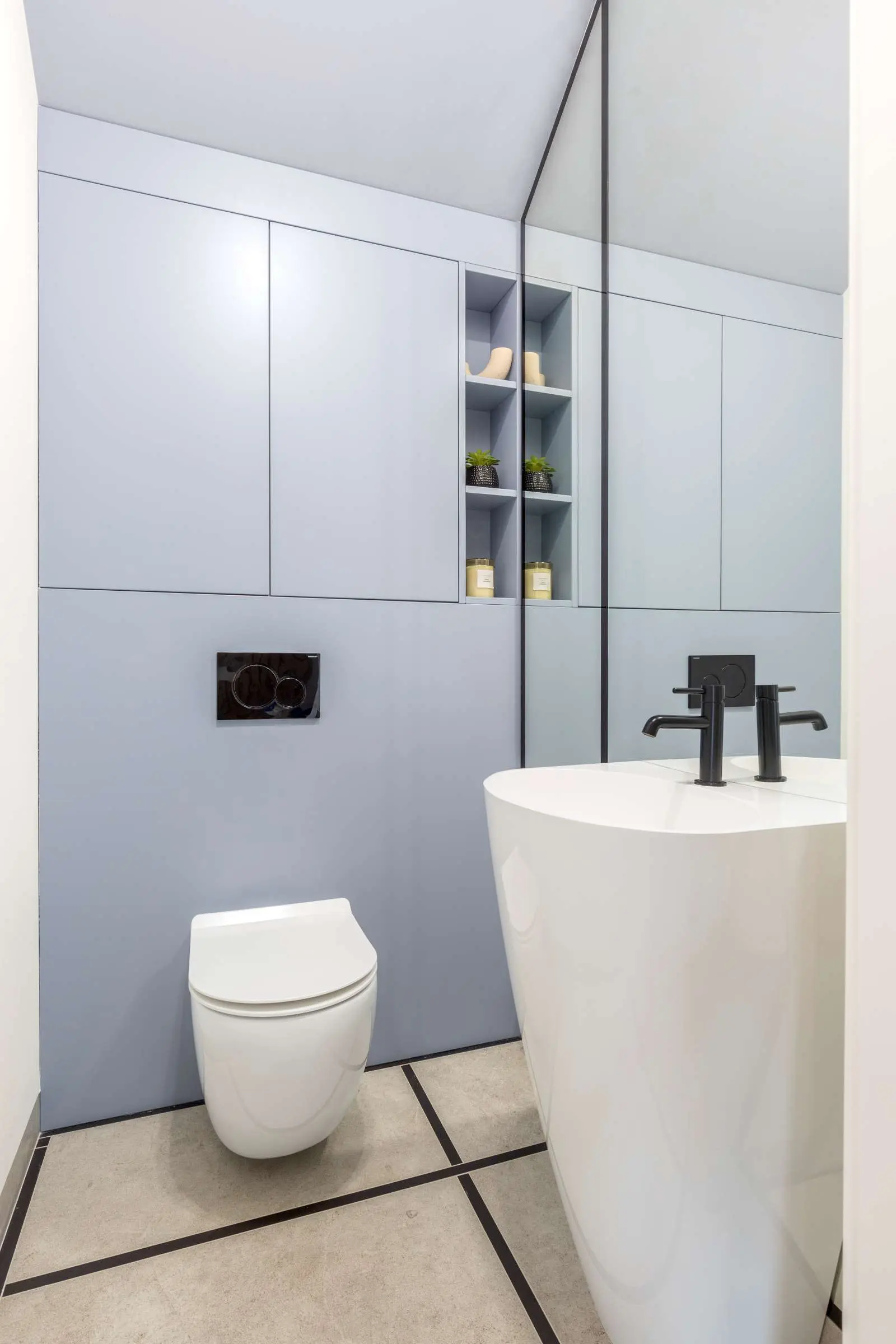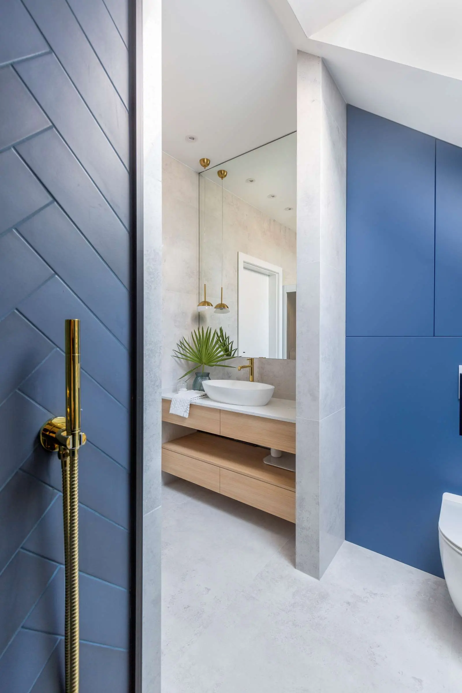 Marmur – kamień elegancki i niezwykle szlachetny – uwielbiany był już w starożytności i do dziś cieszy się uznaniem. Cóż, dzieje się tak być może dlatego, że jest to materiał oferujący w szereg wnętrzarskich możliwości. Jego różnorodność pozwala na zastosowanie kontrastów oraz powołanie do życia zarówno odważnych, jak i stonowanych rozwiązań. Choć marmurowe lub marmuropodobne płytki położyć możemy tam, gdzie chcemy, team architektów marmurowym królestwem uczynił nie tylko kuchnię, w której umiejscowiono subtelną wysepkę, ale przede wszystkim jedną z trzech łazienek. Marmur odnajdziemy tu na ścianach, dzięki czemu wspomniana elegancja daje o sobie znać już od progu. Ciekawym aspektem tego pomieszczenia mogą także kafle podłogowe, swym wzorem nawiązujące do drewna. Marmur i drewno – dwa różne światy? Otóż nie! Jak sami widzicie, z pozoru odrębne materiały mogą tworzyć spójną całość, okraszoną nutą zieleni, granatu oraz ponadczasowego złota. Flory nie brakuje także w dwóch pozostałych łazienkach – z czego jedna pełni funkcję WC. Tam również spotkamy się z królującą prostotą, błękitem i granatem, a także elementami designerskiej ceramiki – wolnostojącą umywalką.