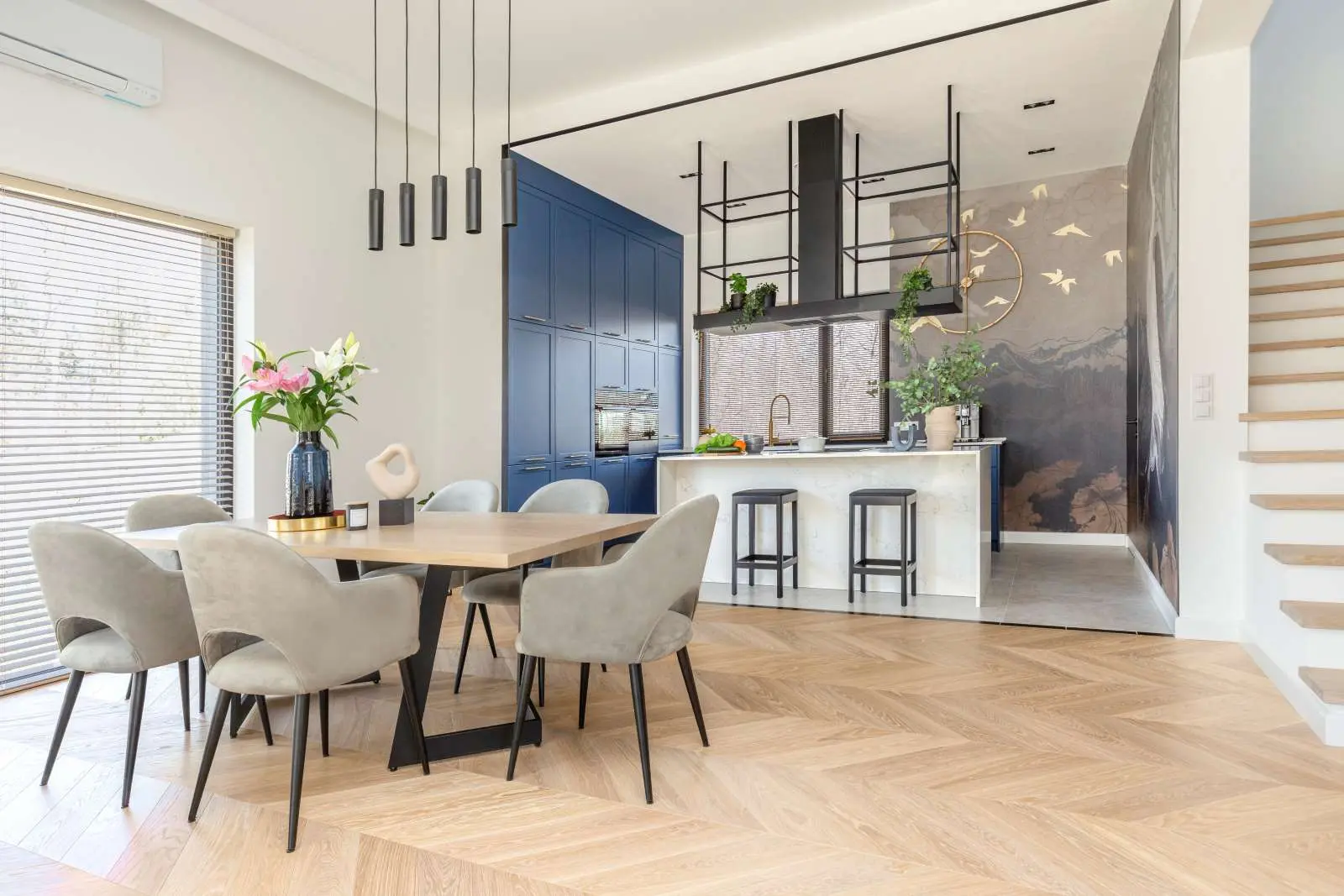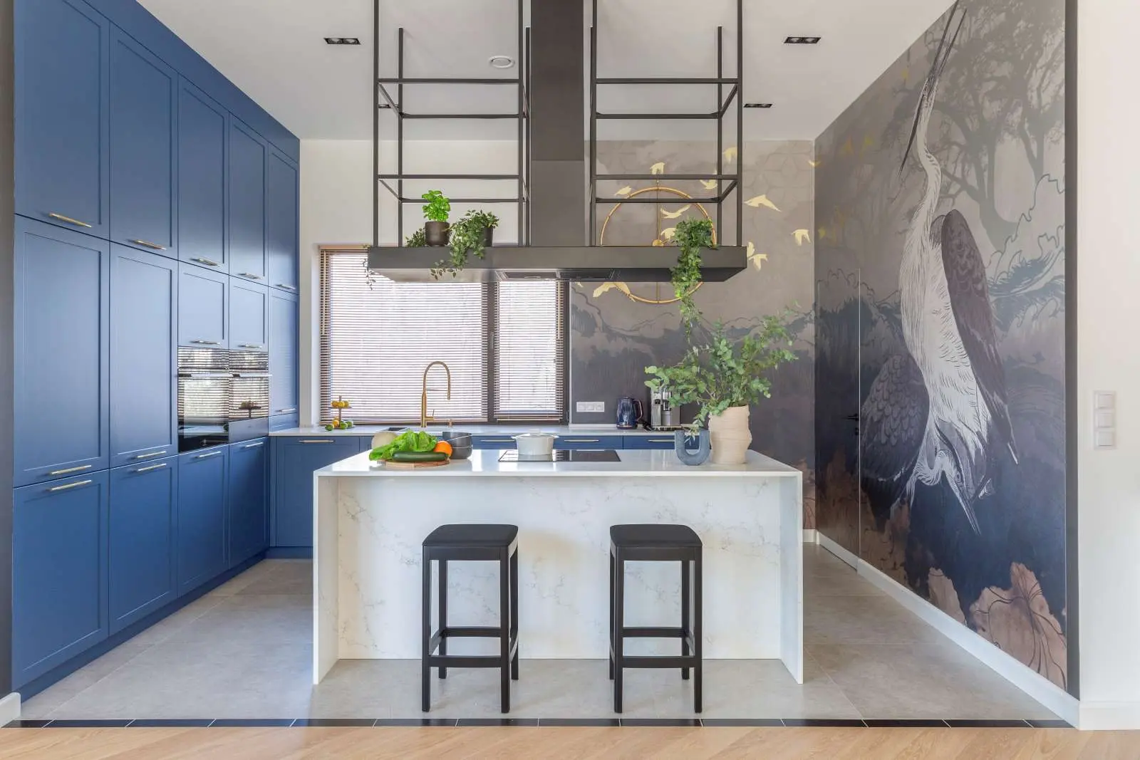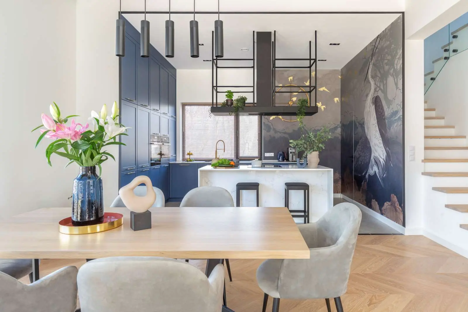 Grafiki obejmujące całą ścianę to aranżacyjny hit, po który sięgamy coraz chętniej. Wszystko za sprawą wyjątkowych wzorów, pozwalających dopełnić charakter naszego domu bądź mieszkania. Co ważne, nie musimy tapetować wszystkich ścian, aby osiągnąć pożądany efekt. Jak widać, warszawscy architekci pokusili się o stworzenie magicznej przestrzeni, wybierając najciekawszą, niezagospodarowaną ścianę w kuchni połączonej z salonem. Tapeta obejmuje cały jej obszar, a nawet zahacza o skrawek ściany sąsiedniej. Wyjątkowa grafika utrzymana jest w barwach szarości i granatu, a w samym jej centrum dostrzec można motyw ptactwa oraz drzew. Jak się okazało, złoty zegar ścienny przepięknie dopełnił tapetę, a to dlatego, że swoją barwą współgra ze znajdującymi się na niej ptakami.
