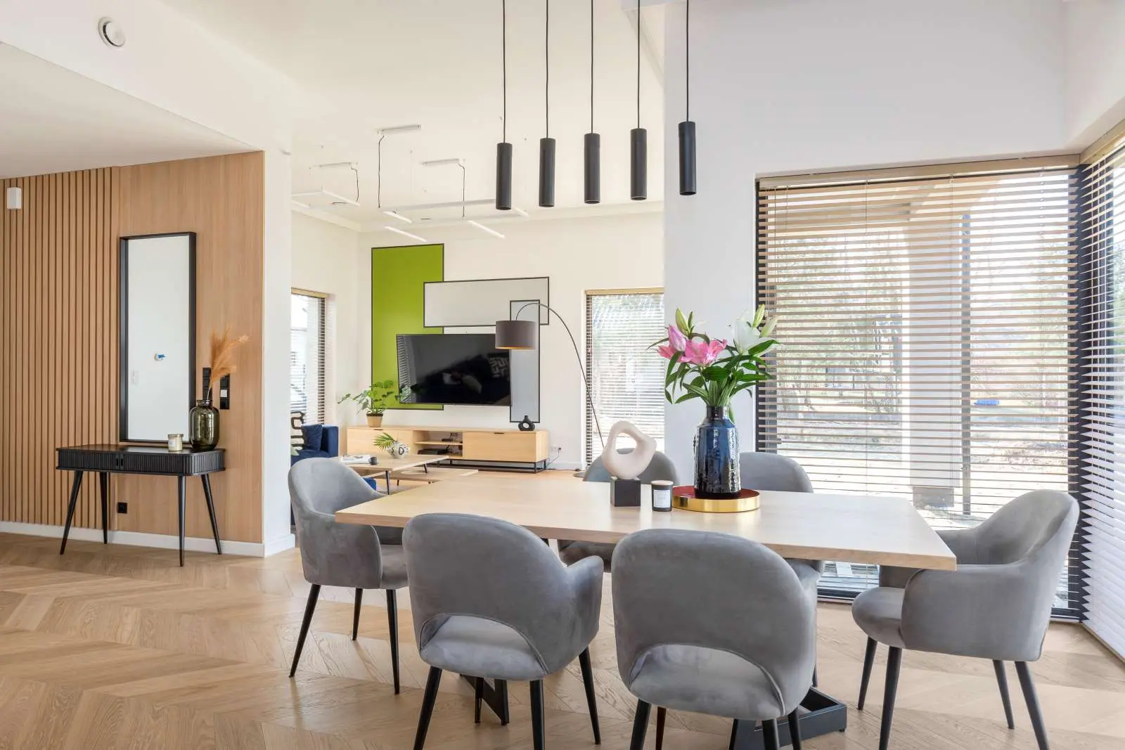 Biel – harmonijna królowa klasycznego piękna, optycznie powiększająca każde pomieszczenie, stanowiąca idealne tło dla każdego typu aranżacji. Najlepszym przyjacielem tej barwy okazuje się naturalne światło, wpadające do wnętrza przez okna – a im ich więcej, tym oczywiście lepiej. W przypadku, gdy nie chcemy uzyskać efektu przestrzeni zbyt spokojnej i stonowanej, warto pokusić się o kolorowy eksperyment. Jednolitą przestrzeń – przykładowo zaaranżowaną poprzez kolaborację bieli i jasnego brązu – jak najbardziej przełamać możemy poprzez zastosowanie kolorowych dodatków, takich jak kanapa, poduszki, kwiaty lub nawet barwny motyw geometryczny na jednej ze ścian. Efekt? Elegancki i energetyzujący zarazem!