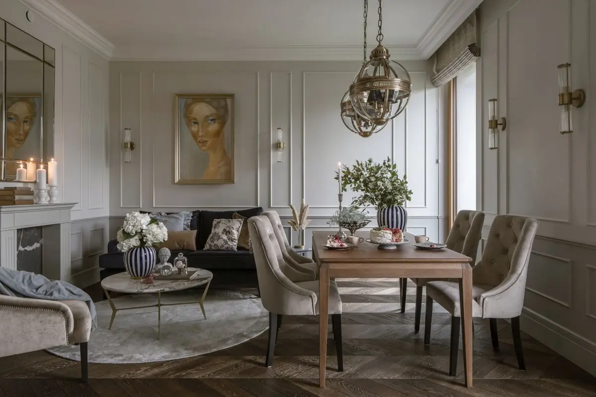 W salonie uwagę przykuwa dekoracyjny portal kominkowy, który nadaje całkowicie nowy wymiar wnętrzu. Na obudowie postawiono świece i książki, będące kontrapunktem do ciemnego spieku i lustra ze złotymi szprosami. Ozdobne, wszechobecne sztukaterie, oprócz złagodzenia przestrzeni pomiędzy ścianami, domykają całość, współgrając z liniami mebli, stolika kawowego i pikowanych krzeseł. Gościnny klimat, korespondujący ze stylem życia właścicieli, zmaterializował się tu w postaci pięknego dębowego stołu, powstałego na zamówienie w jednej z polskich manufaktur.