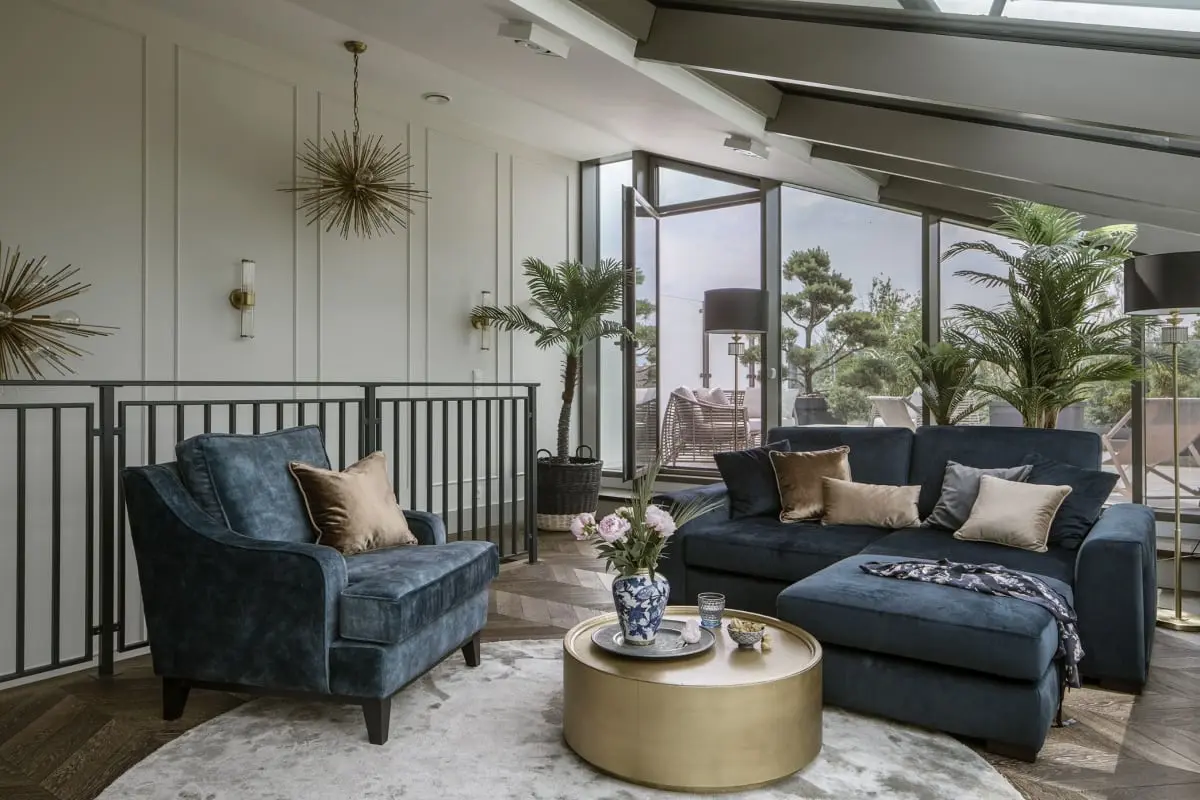 „Szklarnię” na górze zaaranżowano jako drugi, pełnoprawny salon, służący rodzinie jako przestrzeń do wypoczynku. Miejsce zachwyca widokiem na niczym niezmącony błękit nieba za oknem, las i przeszklony taras z dużą ilością roślin, przypominający nadmorską scenerię. Urządzając tę przestrzeń, zdecydowano się tylko na niezbędne meble, które wnoszą faktyczną wartość do wnętrza. Z granatową sofą i fotelem świetnie komponuje się ciemna dębowa posadzka, ułożona w klasyczną francuską jodełkę, a schowek pod oknem kryje miejsce na gry planszowe. Całość apartamentu, usytuowanego na ostatnim piętrze, jest idealnym przykładem miejsca, które pozwala się wyciszyć i na długo zapada w pamięć. Wszystkie środki wyrazu tworzą w tym miejscu perfekcyjną kombinację nowojorskiej klasyki, z nowoczesnym charakterem, które razem nadają ostateczny ton całemu wnętrzu.
