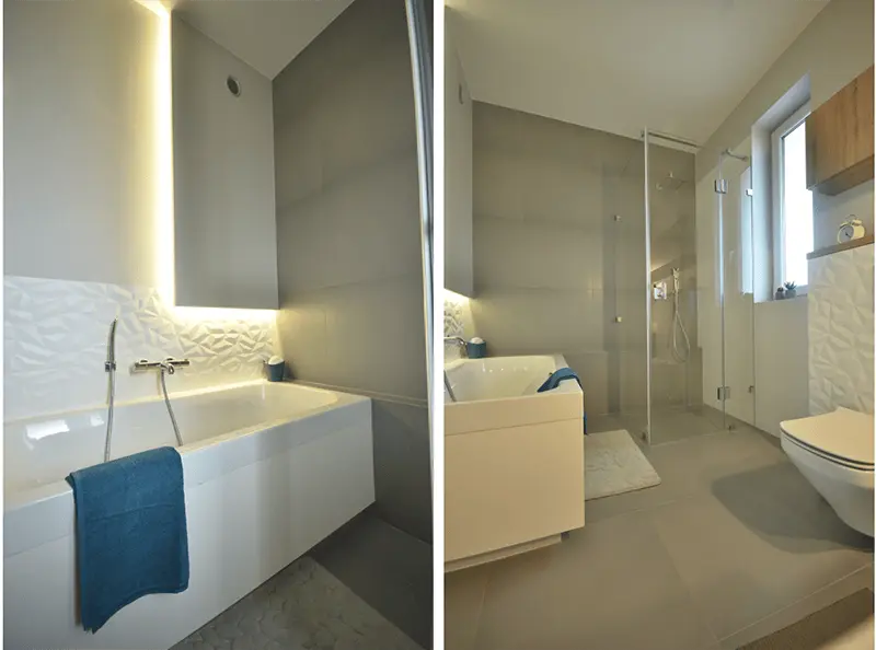 Łazienka również zasługuje na naszą uwagę. Została zaprojektowana w tym samym klimacie, co reszta mieszkania, a więc króluje tu umiarkowany minimalizm charakterystyczny dla stylu skandynawskiego. Ciekawego wyglądu i nowoczesnego sznytu, dodają jej zastosowane płytki 3d firmy Baldocer Neve Satin.